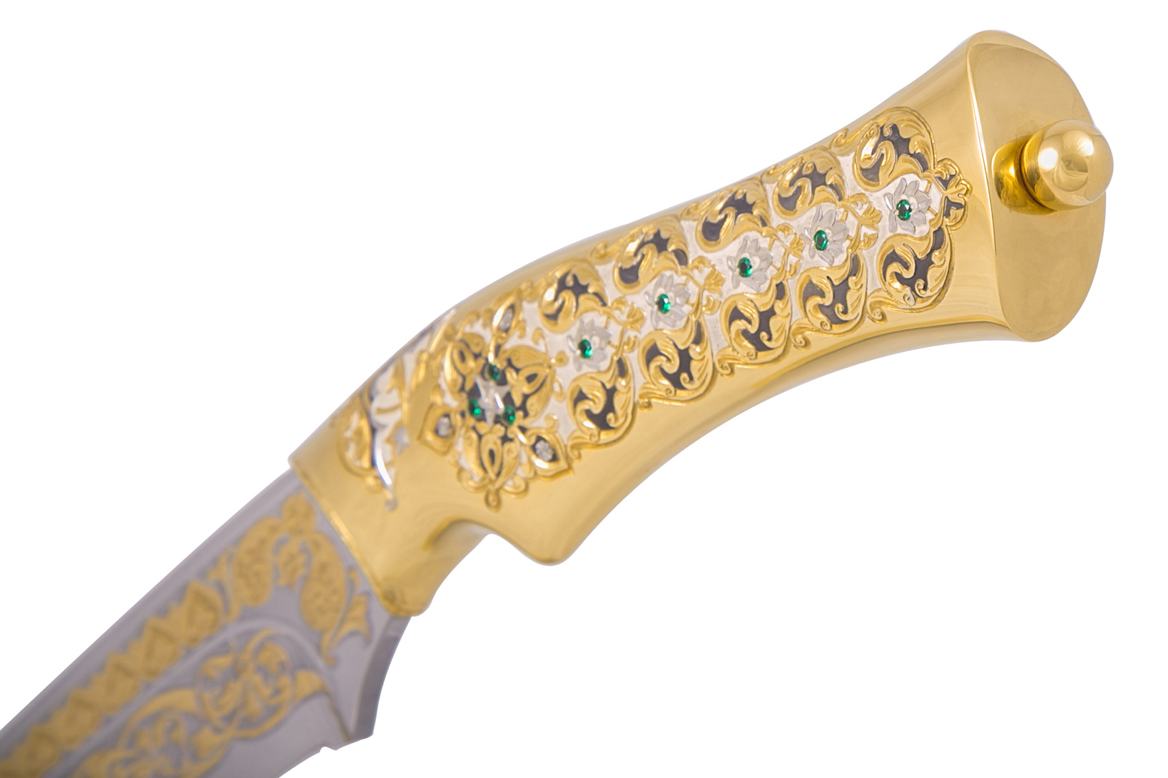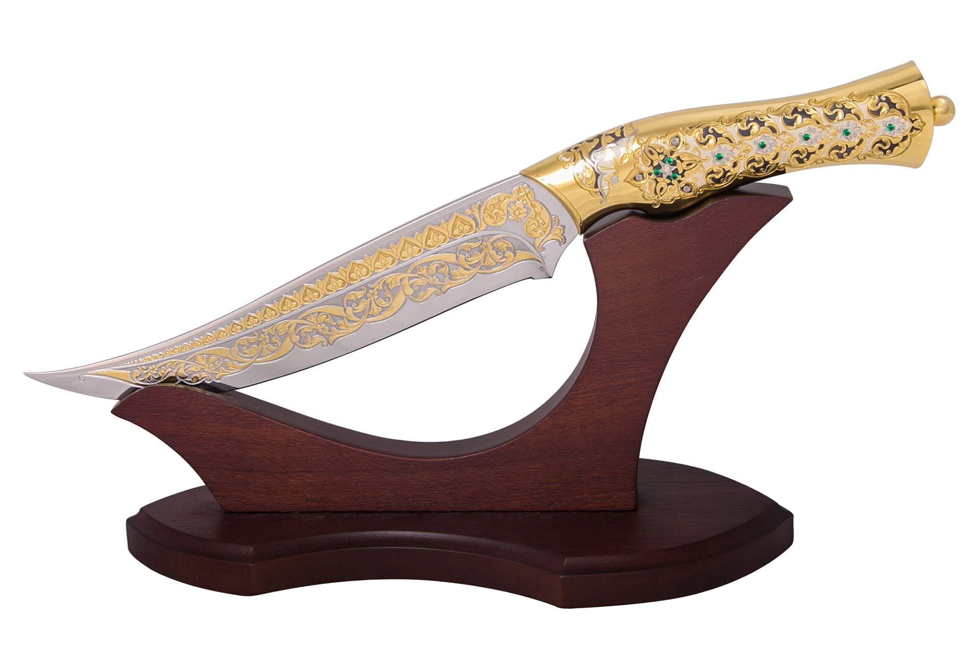 Эксклюзивный нож «Акман - Зарифи» ручной работы. Его клинок выполнен из нержавеющий стали, украшен узорной многоступенчатой гравировкой разрисован кистью. Рукоять из латуни инкрустирована камнями и ажурным узором. Нож имеет золотое и никелевое покрытие. В комплекте специальная подставка из ценного дерева. Идеальный презент для сильных и уверенных мужчин.