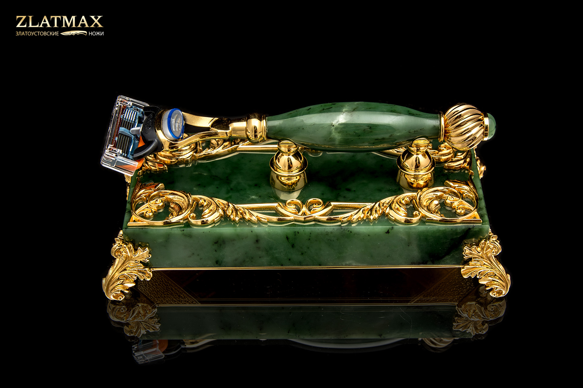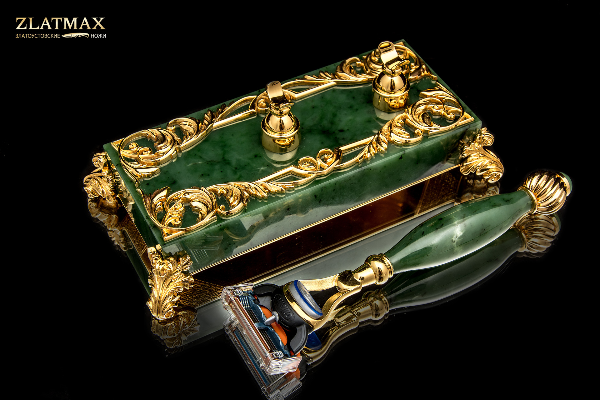 Бритвенный набор для представительного делового человека. Роскошный комплект, выполненный из нефрита и латуни, сочетает в себе мастерские техники. Здесь вы встретите и художественное литье, и гравировку иглой по лаку, и прорисовку специальной кистью на металле. Травление, подрезка, полировка и золочение. Ручная авторская работа мастеров из Златоуста воплотила потрясающую идею для повседневного использования.