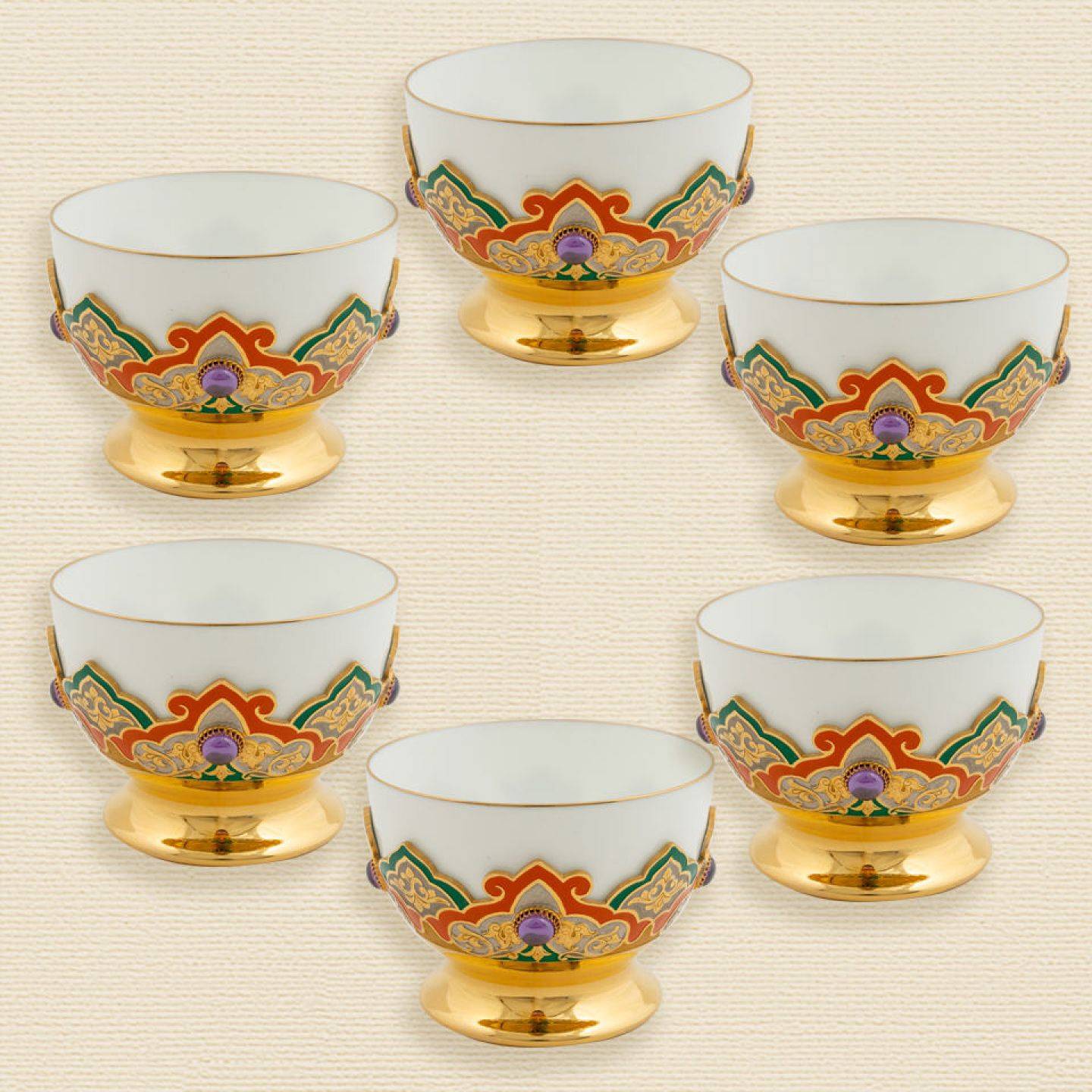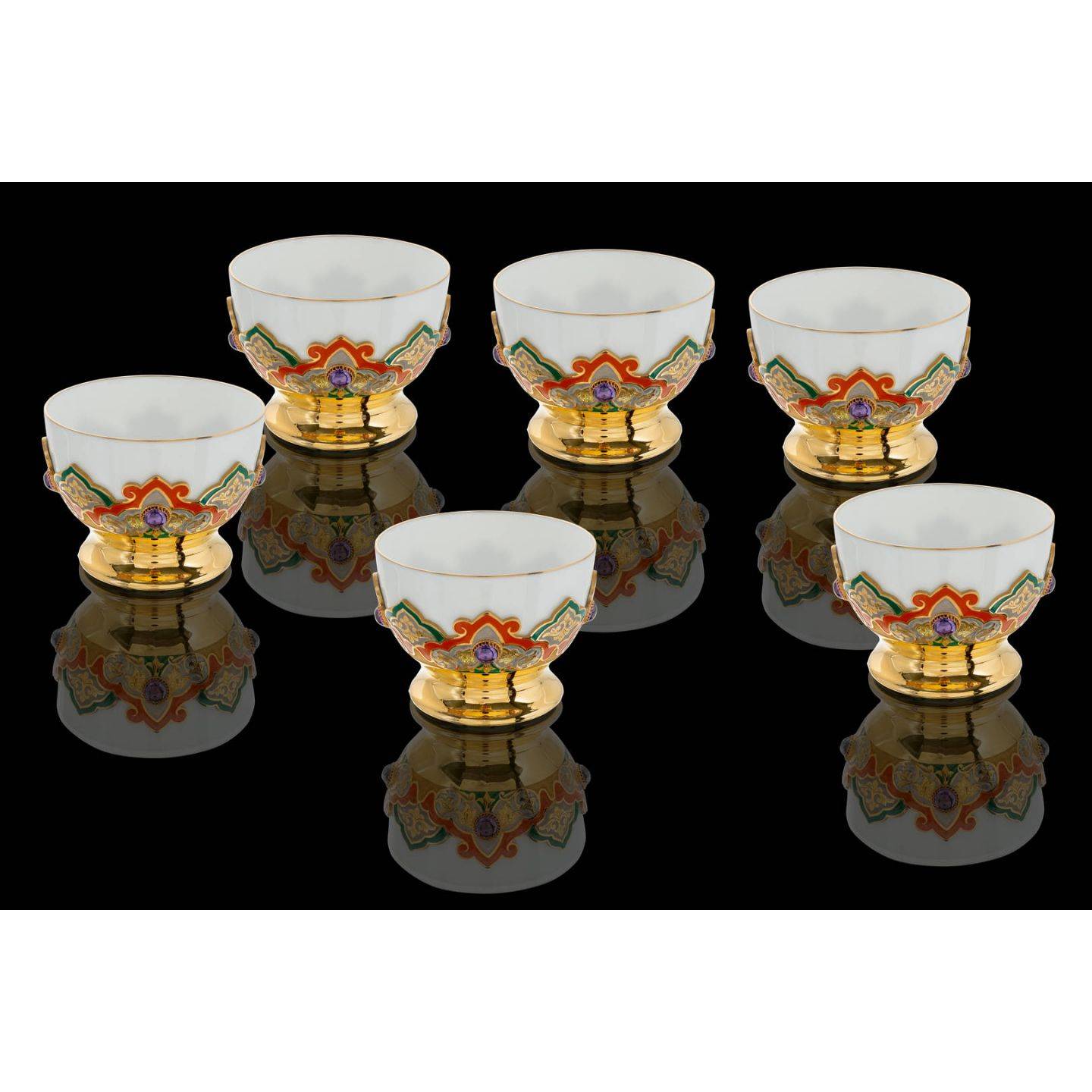 В оформлении используется золото и эмаль двух цветов, цветочный орнамент – арабески. Ухаживать за комбинированной посудой тоже проще – достаточно вымыть внутренний стаканчик.