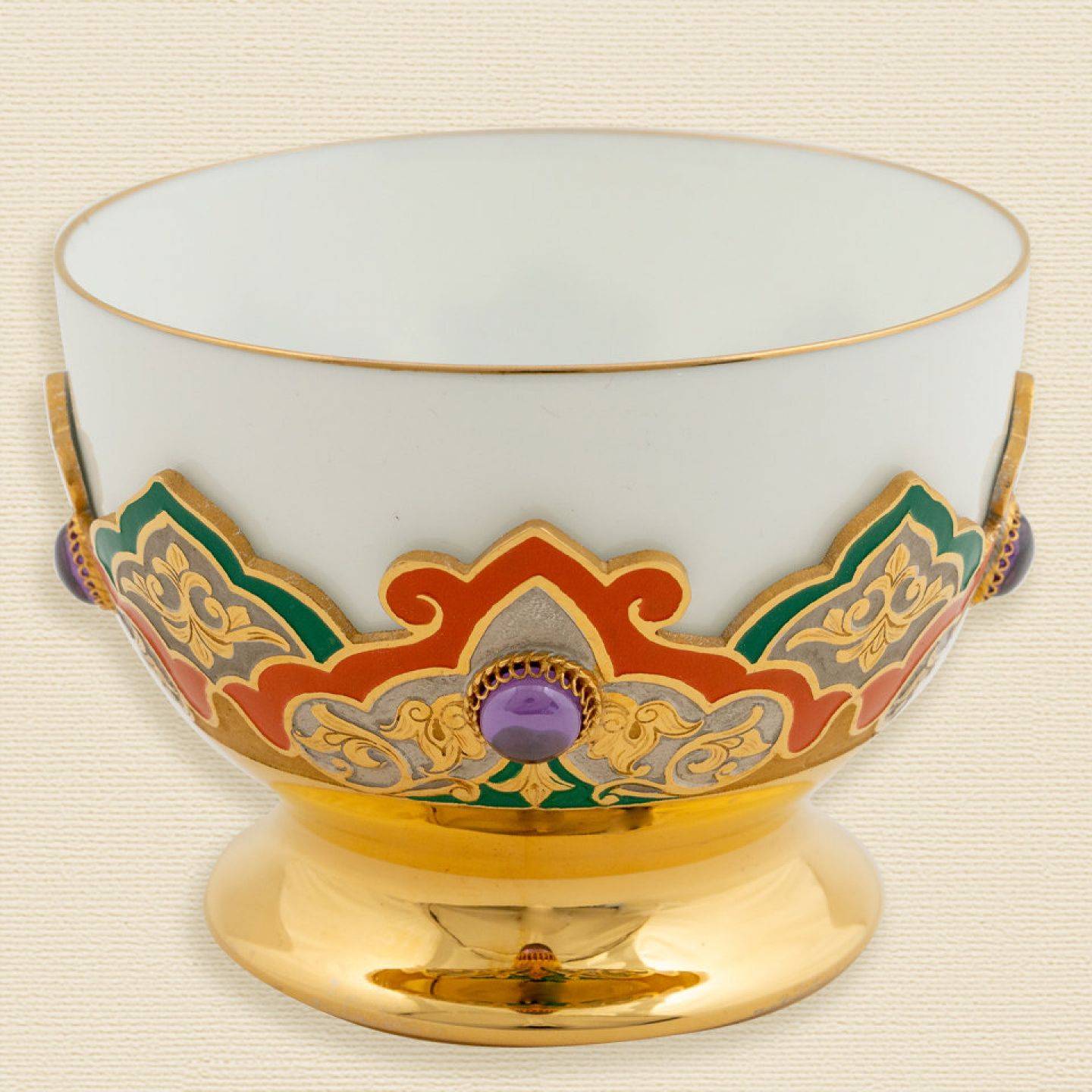 Но также эта фарфоровая пиала устанавливается в футляр из металла, что помогает дольше сохранять тепло напитка. При этом красиво украшенный металл даёт возможность не обжечь руки, пить горячий чай комфортнее.
