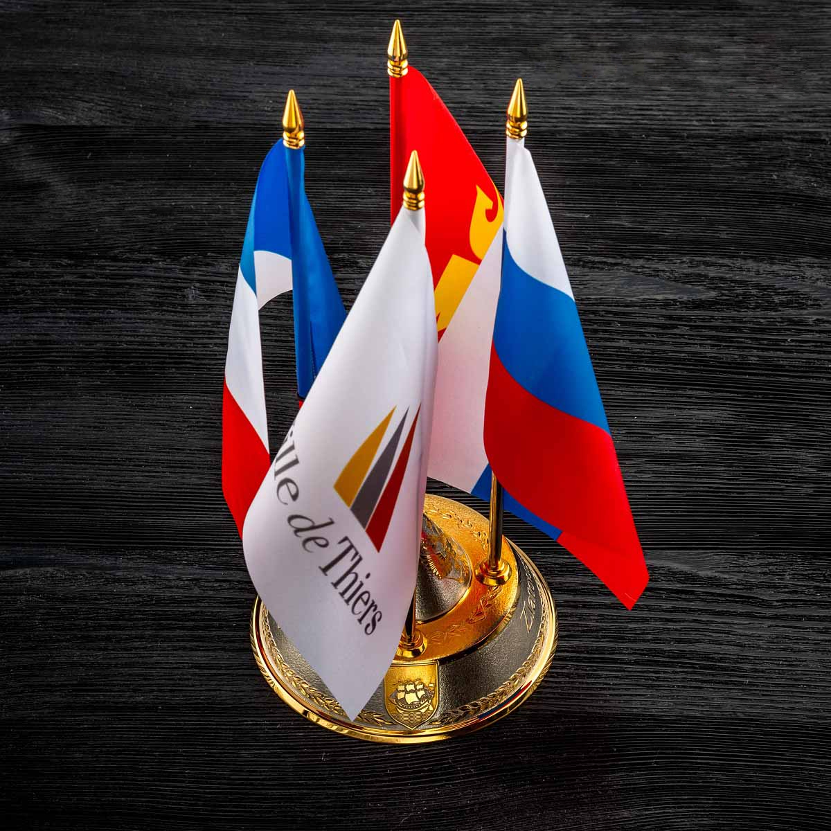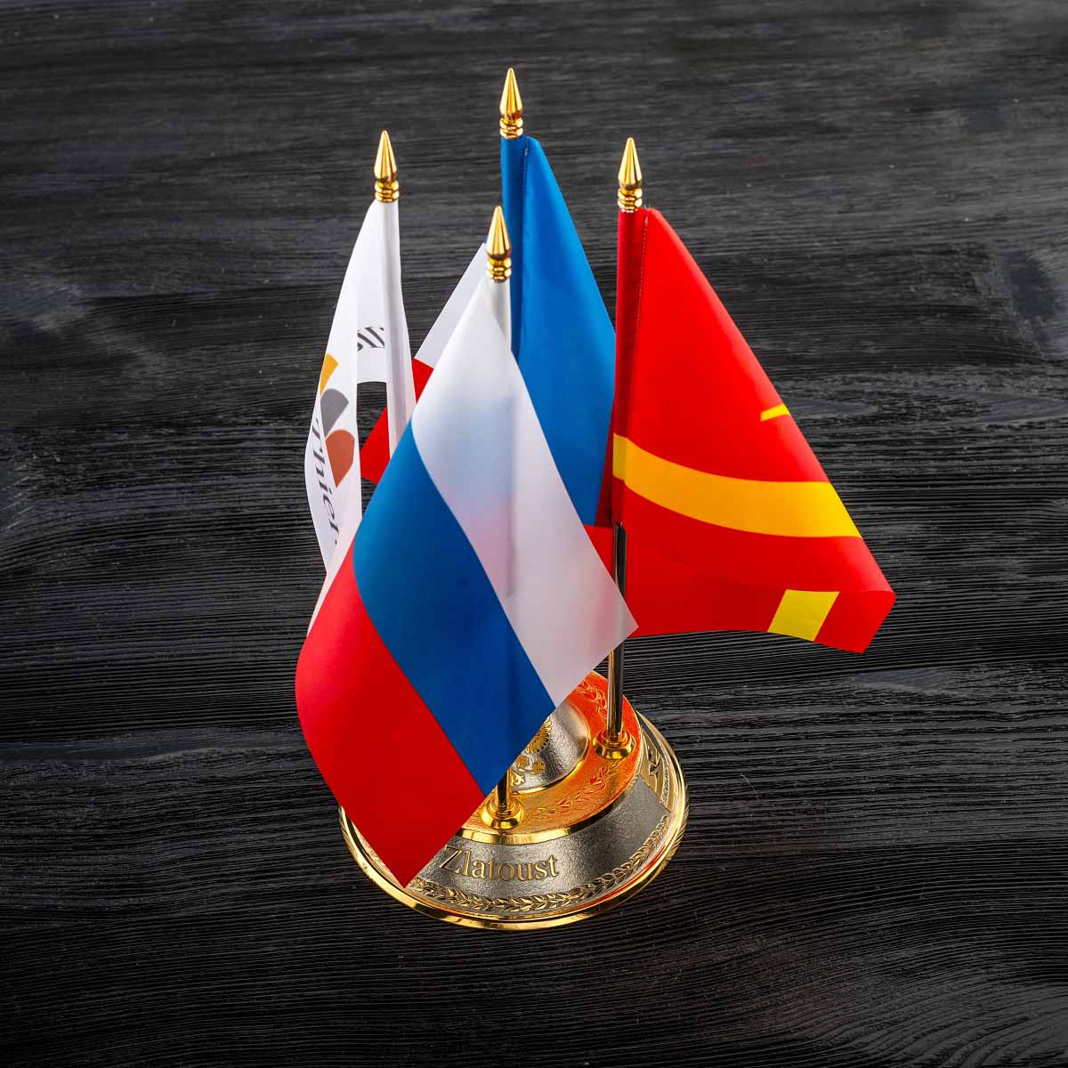 Флагшток настольный на 4 флажка, украшенный в художественном стиле златоустовской гравюры на металле.