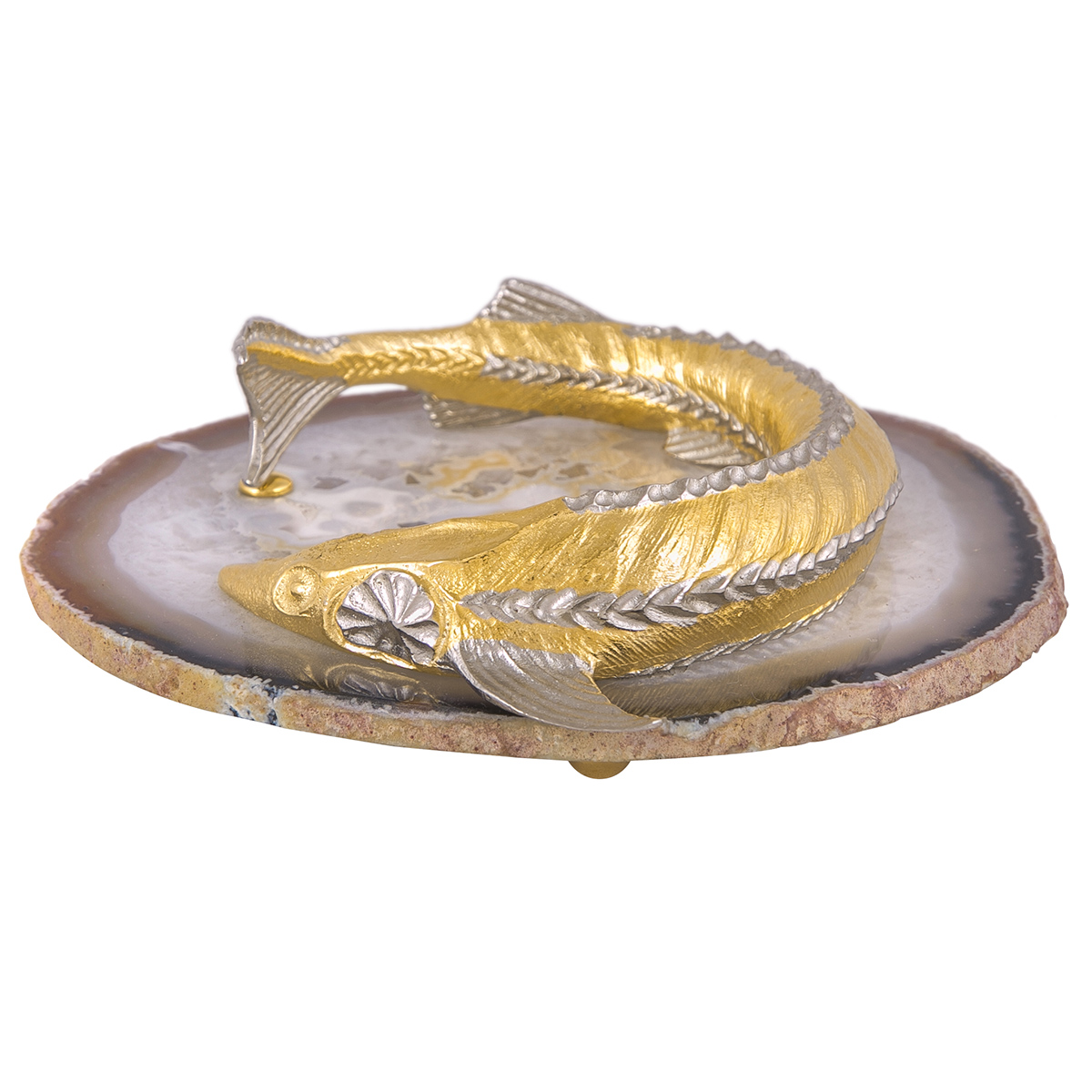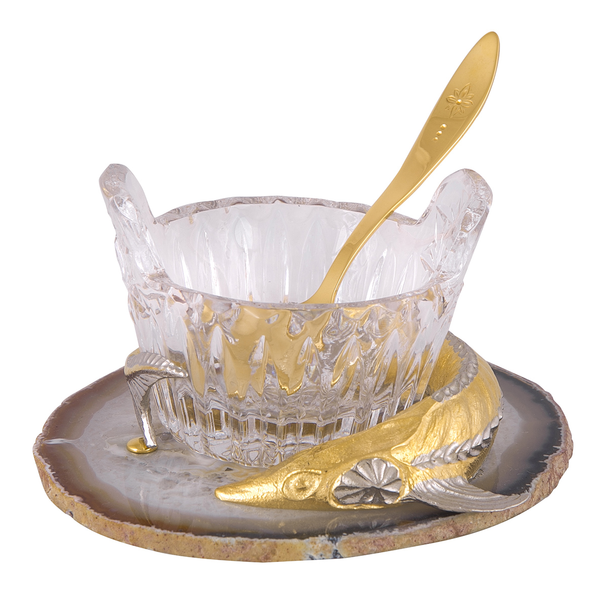 Икорницу в форме миниатюрной кадушки редко можно встретить на столе, поэтому ее появление наверняка вызовет интерес у всех присутствующих. Визуально такая посуда выглядит, как законченная картина: на подставке из агата покоится латунная рыба, буквально обнимающая хрустальную чашу. Набирать деликатес из такой икорницы – настоящее удовольствие!