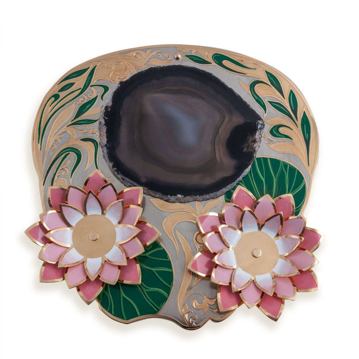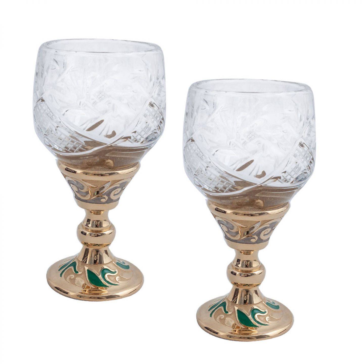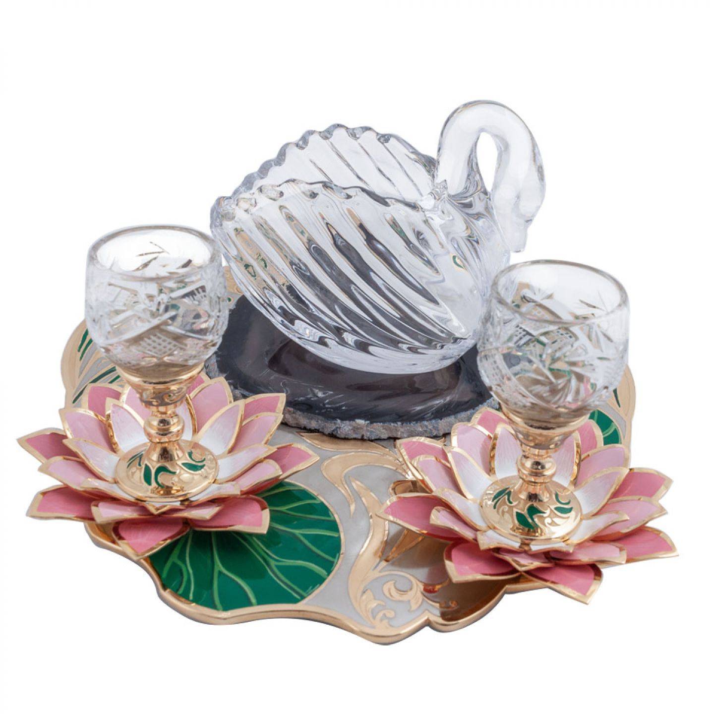 Эта икорница необычна тем, что составляет единую композицию с бокалами. Она расположена на подставке из натурального уральского камня, украшена с добавлением старинной русской техники эмали по металлу. Чаши икорницы и бокалов выполнены из хрусталя.