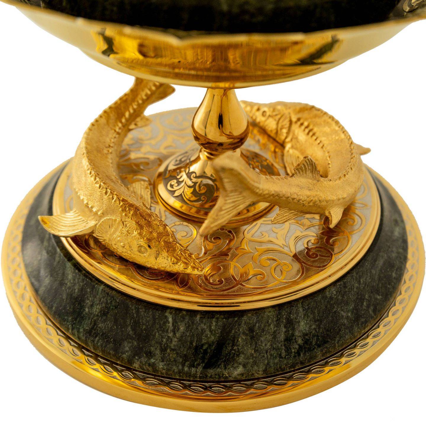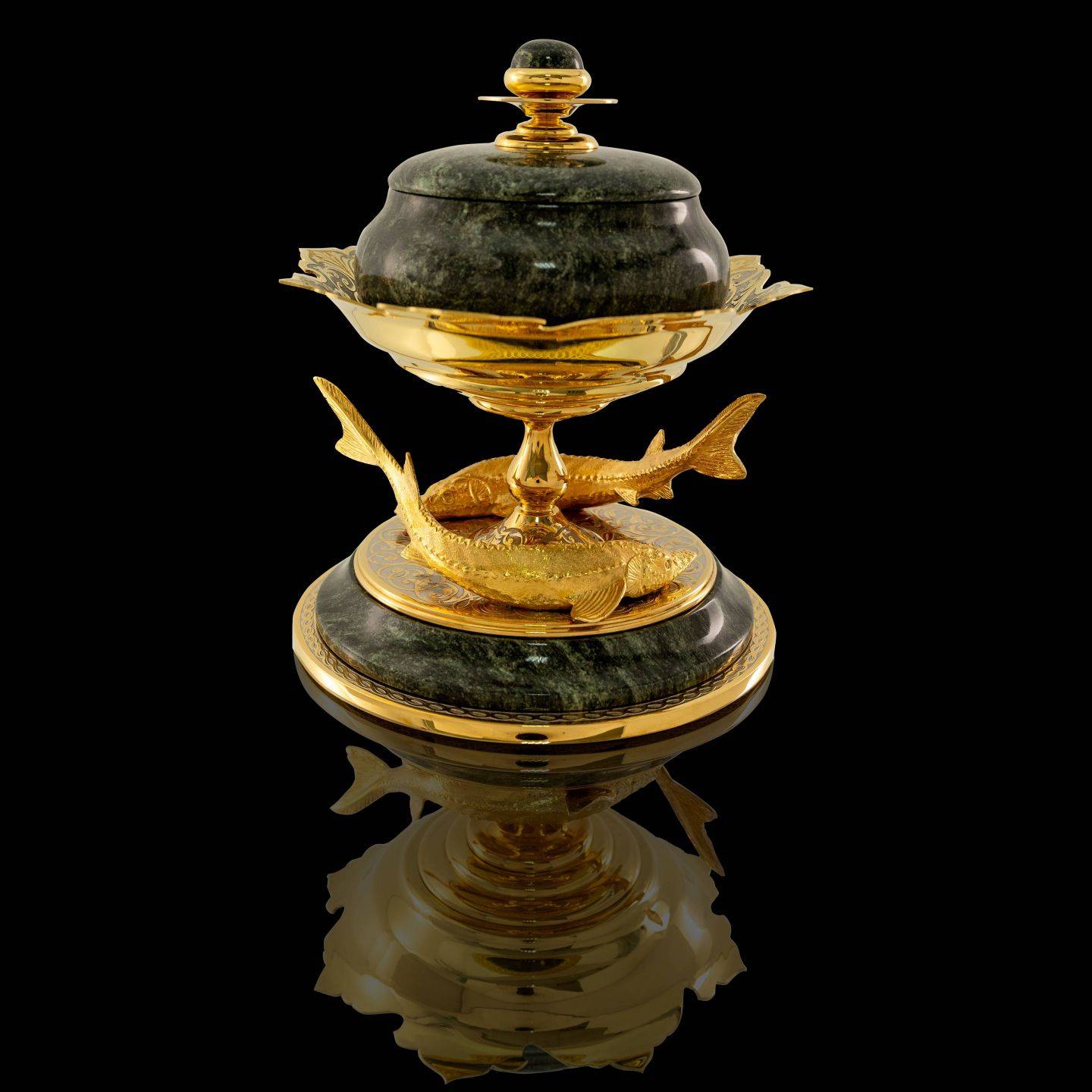 Икорница необычной формы, стилизованная под старинные русские традиции. Установлена на срезе агата – камня, который олицетворяет благополучие в доме. А напоминание про сказку «По щучьему велению» притягивает удачу хозяевам дома.