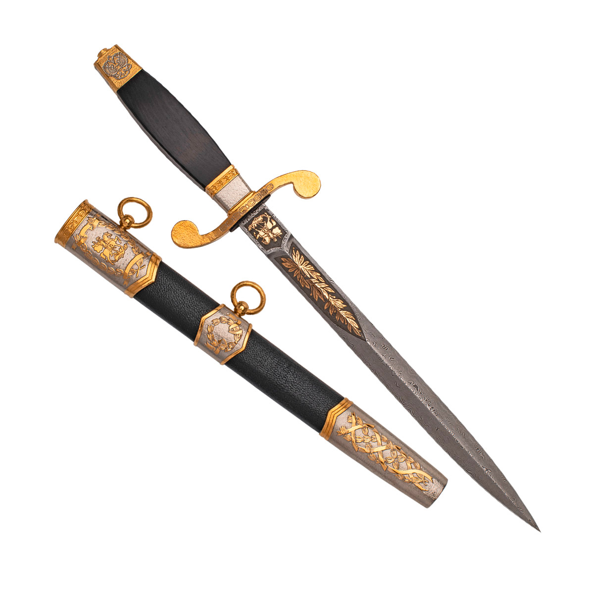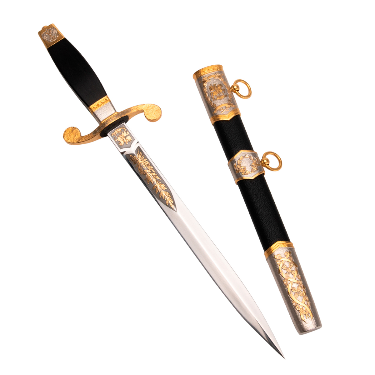 Настоящий кортик, выдержанный в золотисто-черной гамме, выигрышно оттеняющей нержавеющую сталь. Лезв...