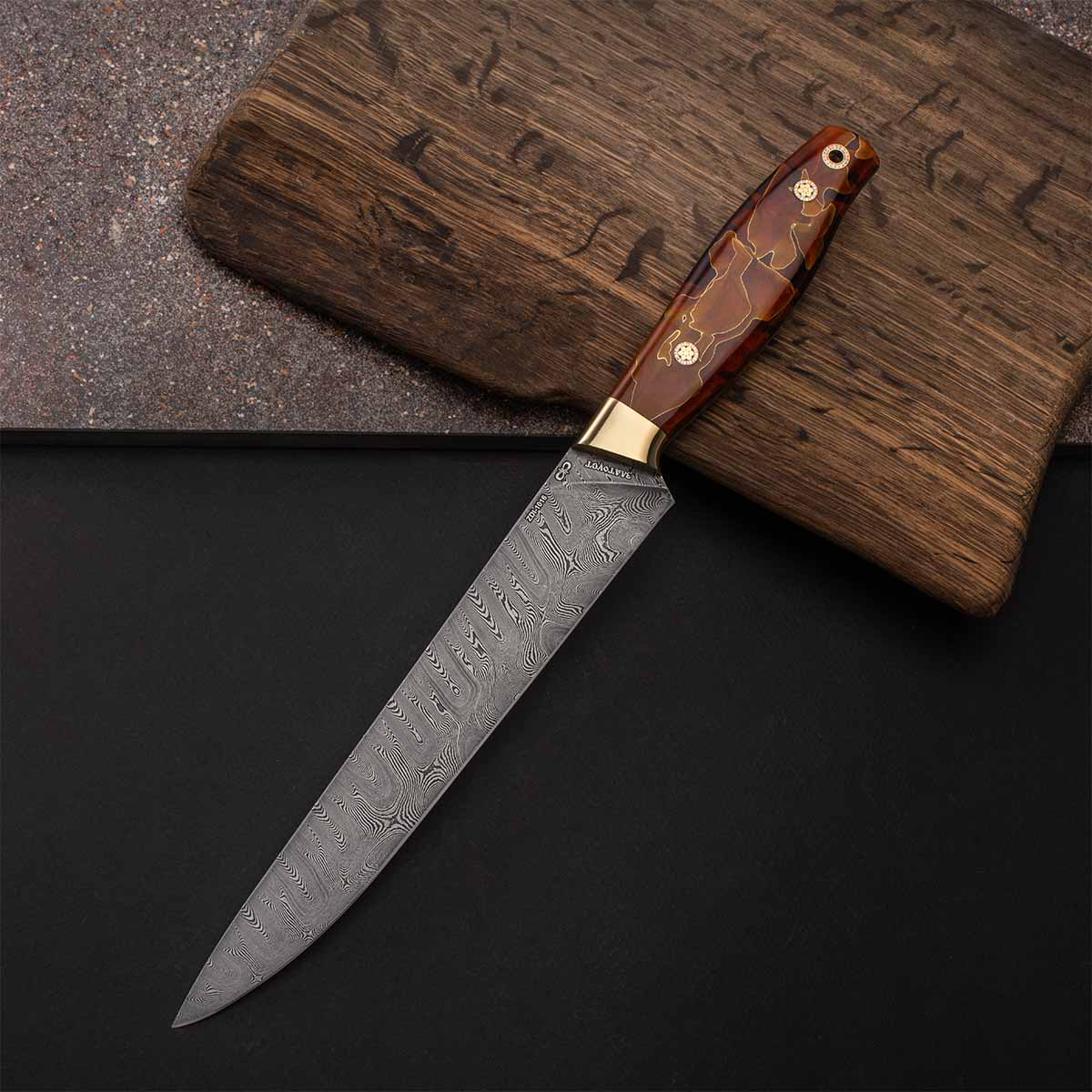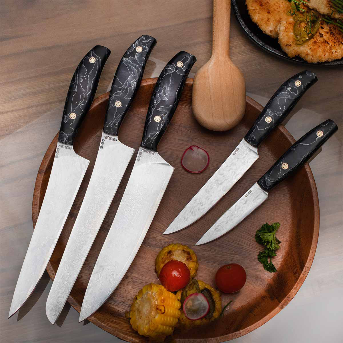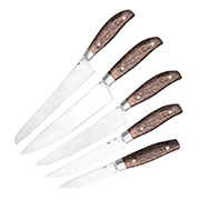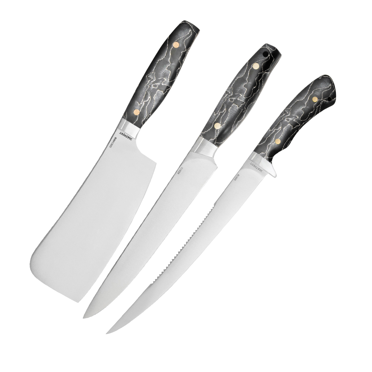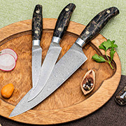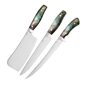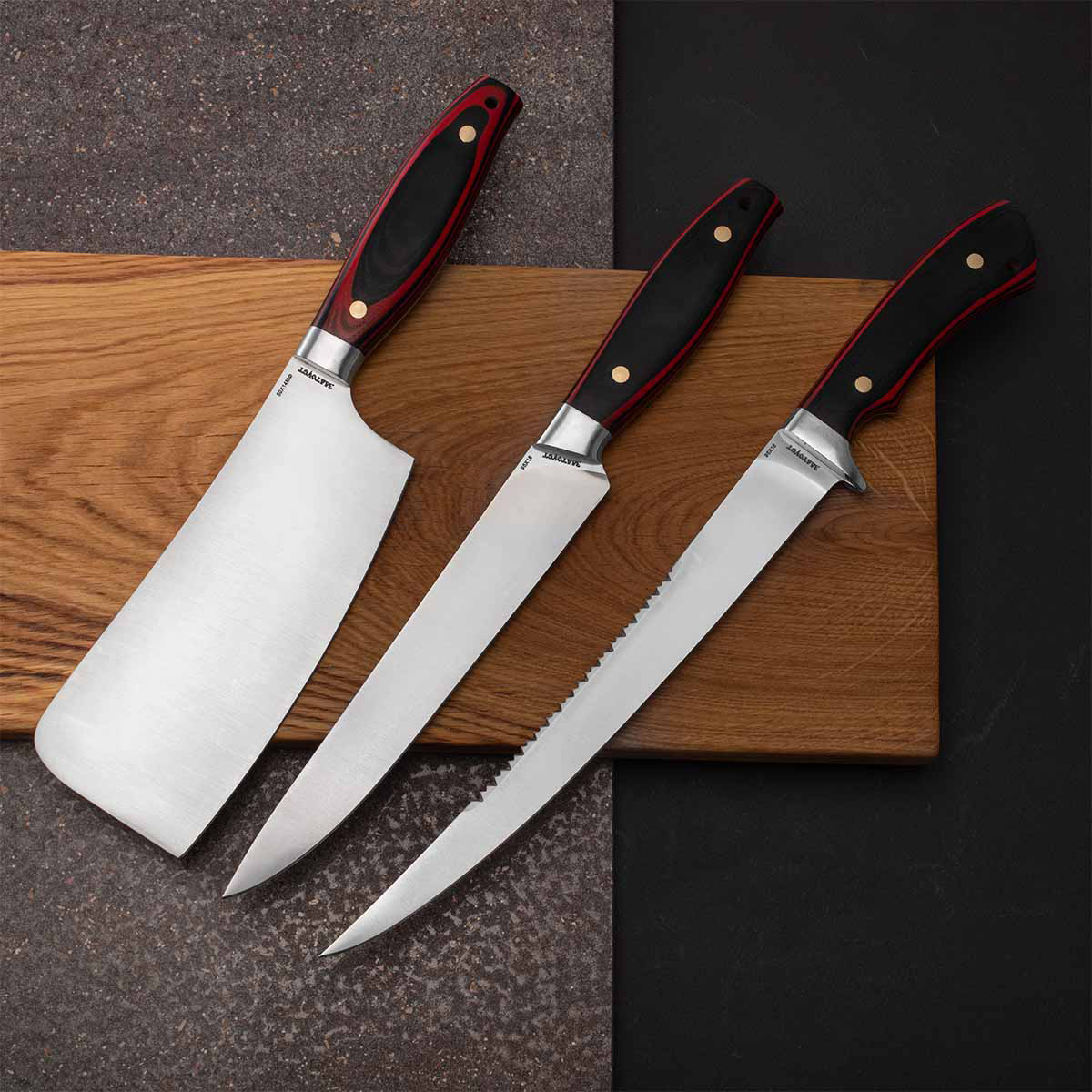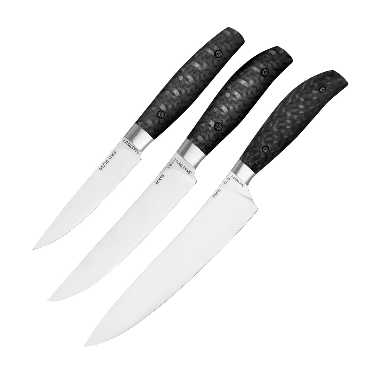 Кухонная тройка представлена тремя моделями: Шеф-нож, Нож Мясной, Нож Филейный, Нож Универсальный, Н...