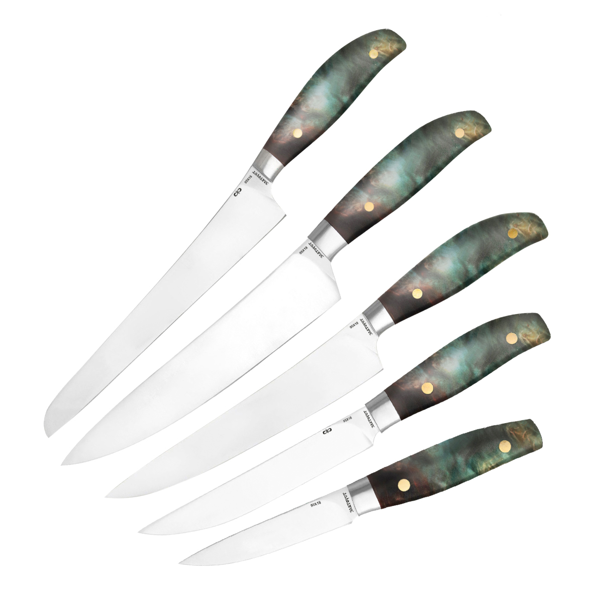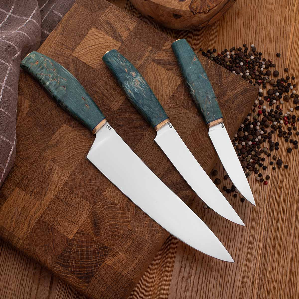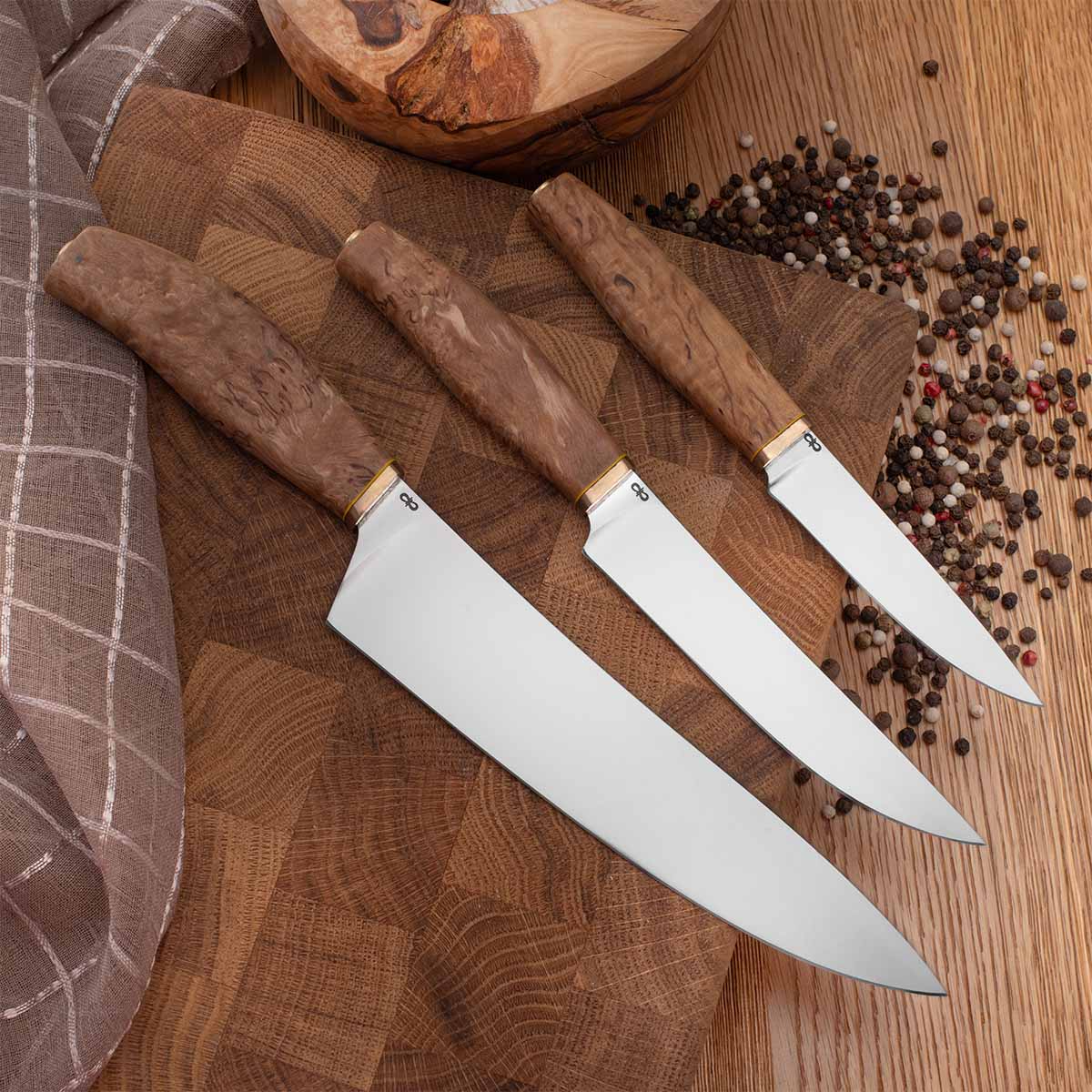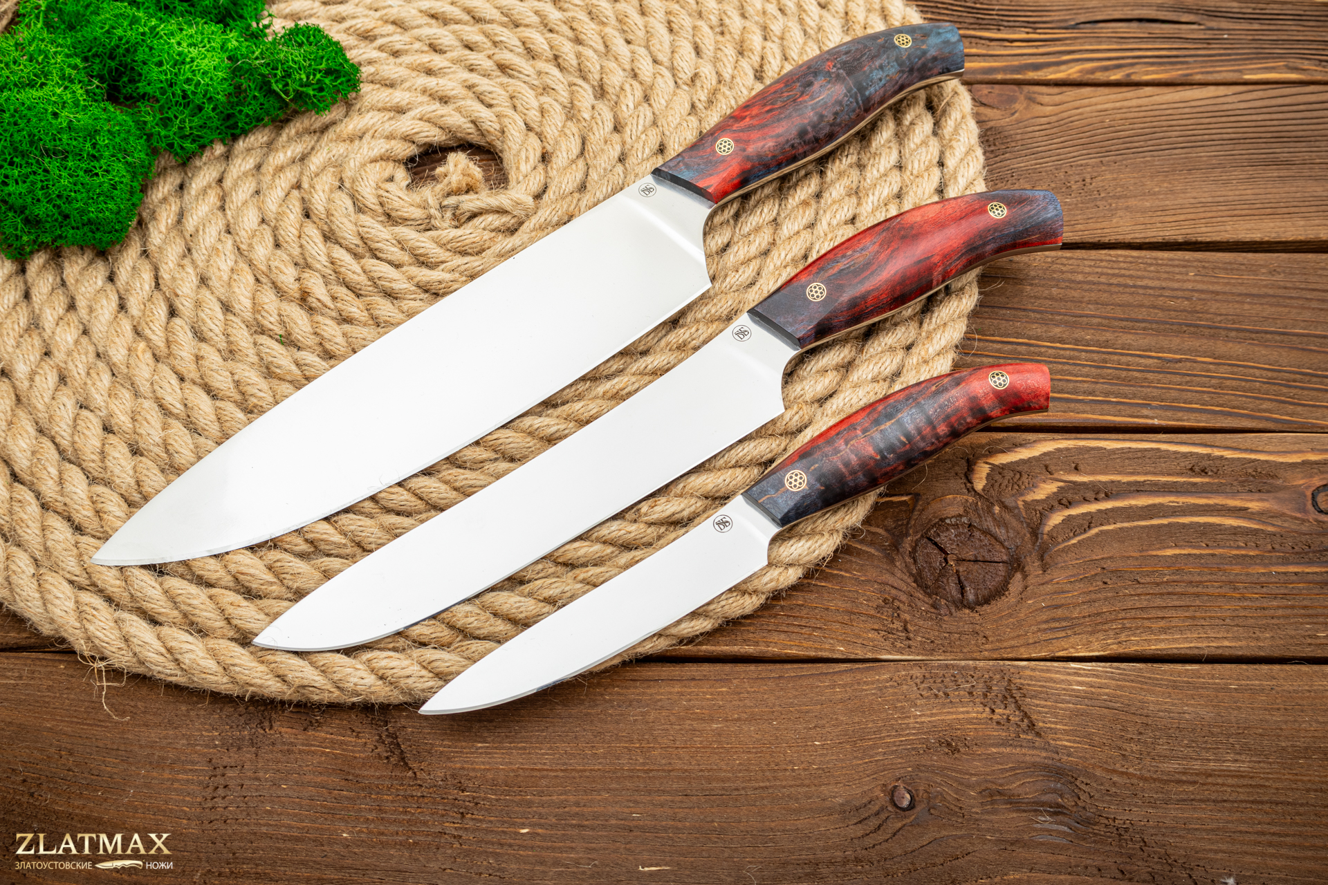 В набор входят следующие ножи:нож "Поварской" нож "Овощной" нож "Овощной малый"Нож «Пова...