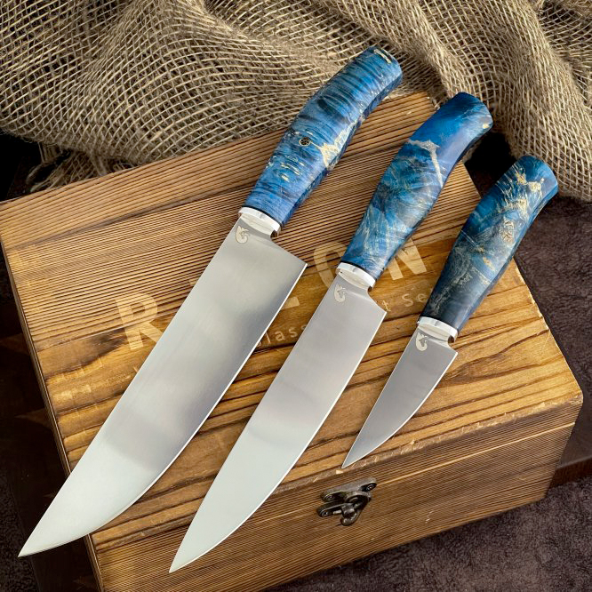 В набор входят следующие ножи:нож "Поварской" нож "Овощной" нож "Овощной малый"Нож «Пова...