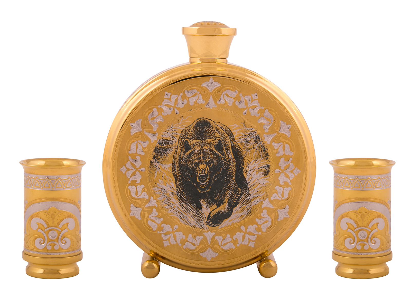 Набор охотничий "Медведица" ( фляга средняя, 2 стопки )Материал: латунь.Покрытия: золотом 99...