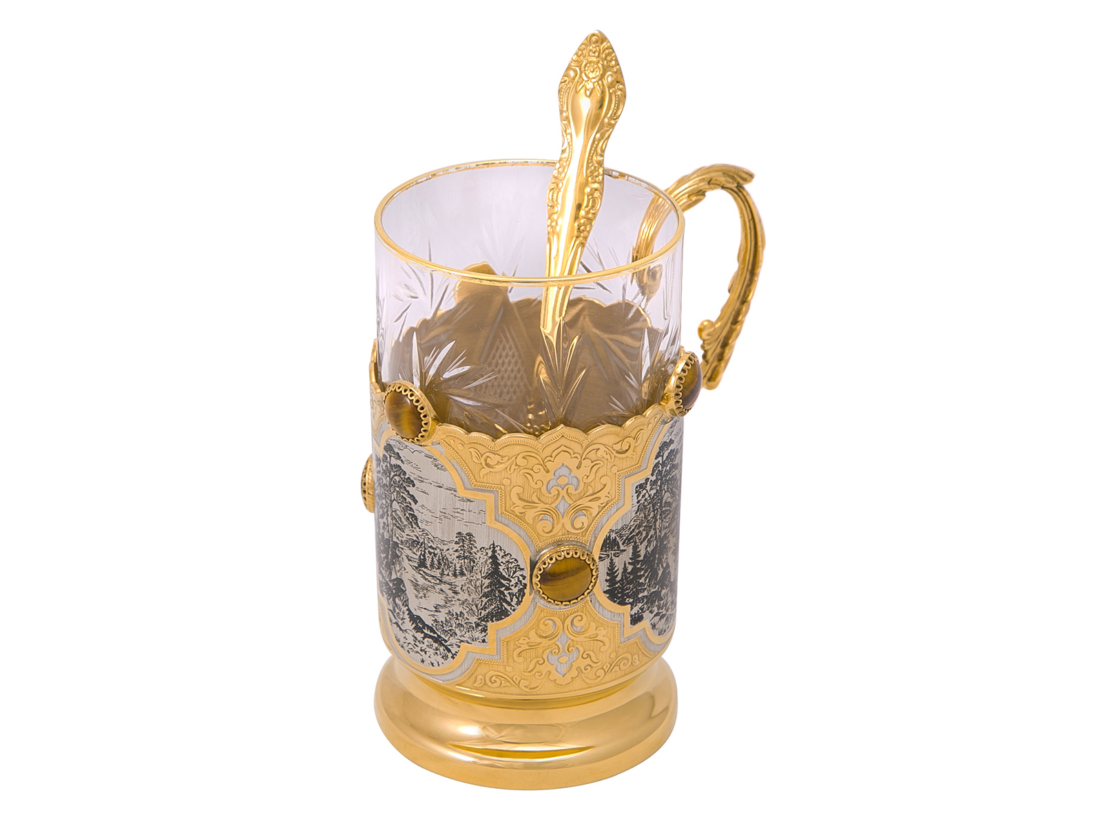 Подстаканник "Пейзаж"Материал: латунь, хрусталь, инкрустация ювелирными камнями.Покрытие: зо...