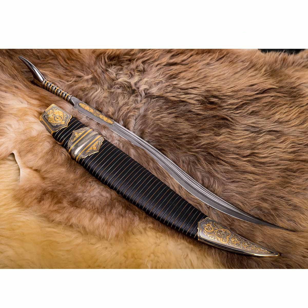 Клинок искривленный, однолезвийный, с одним широким долом. Боевой конец двулезвийный. Украшен античн...