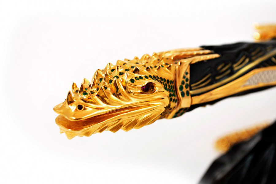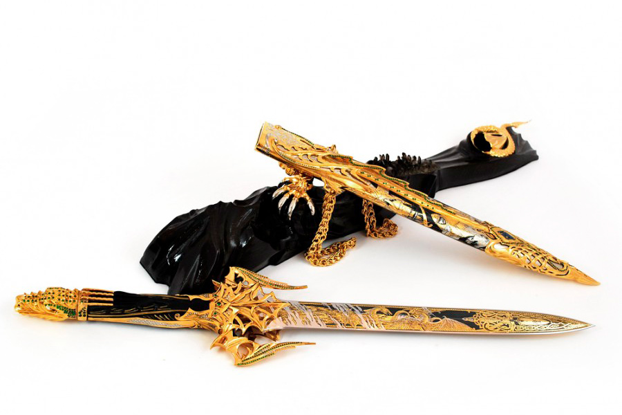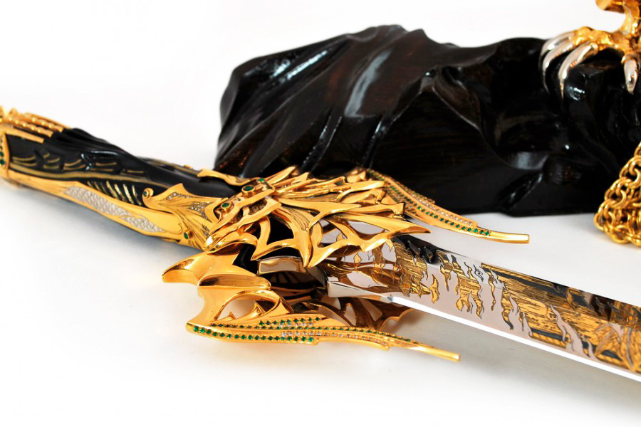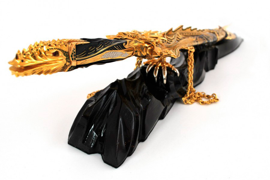 Кинжал на подставке: Изделие выполнено в честь 2012 года – Года Черного Дракона, по многочисленным предсказаниям предрекавшим конец нашей цивилизации.