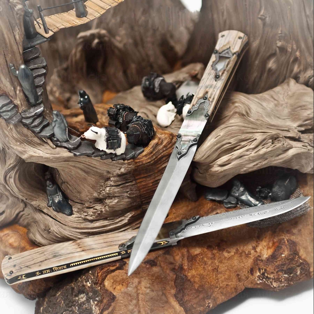На обухе ножей золотыми буквами нанесена мантра тибетских буддистов «Ом мани падме хум», это одна из самых известных и важных мантр, которая дословно переводится как «О жемчужина, сияющая в цветке лотоса!» и интерпретируется так: «Вселенная дарует процветание и изобилие, мне, принимающему их с открытым сердцем».