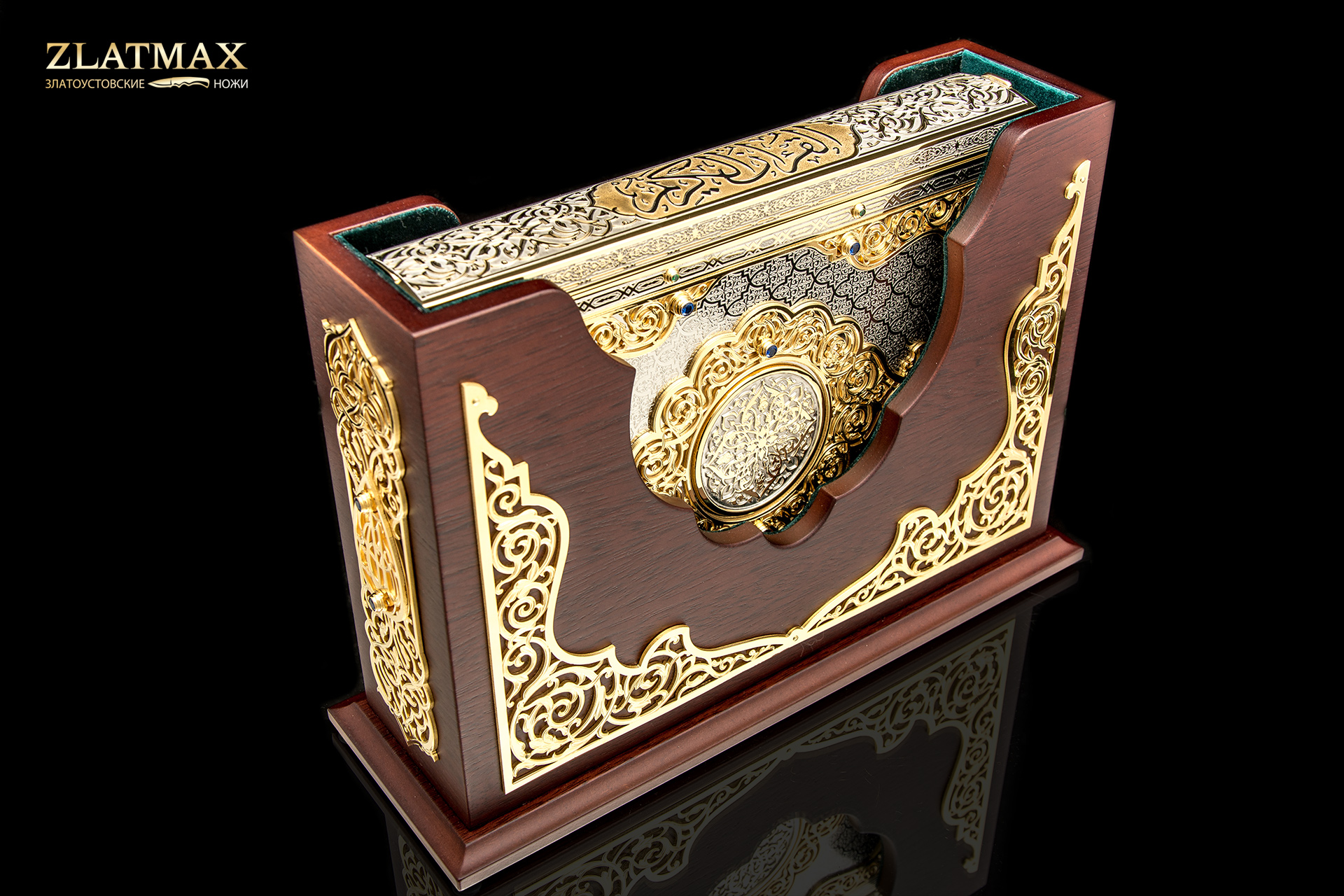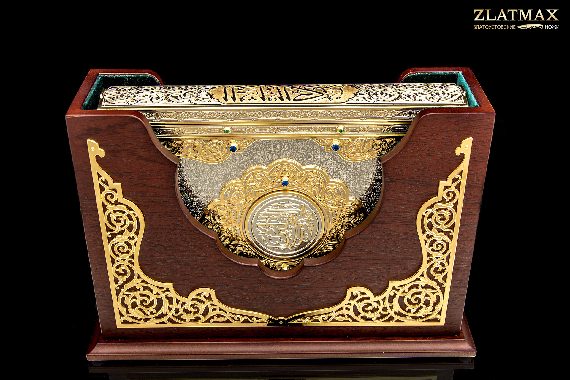 Священная книга мусульман в футляре, изготовленном из ценной породы дерева. Футляр настольный на горизонтальной деревянной подставке на 4-х ножках. Изделие богато украшено накладными декоративными элементами с восточным орнаментом, изображением мечетей и мусульманской символики по торцам футляра. Декоративные элементы изготовлены из латуни.