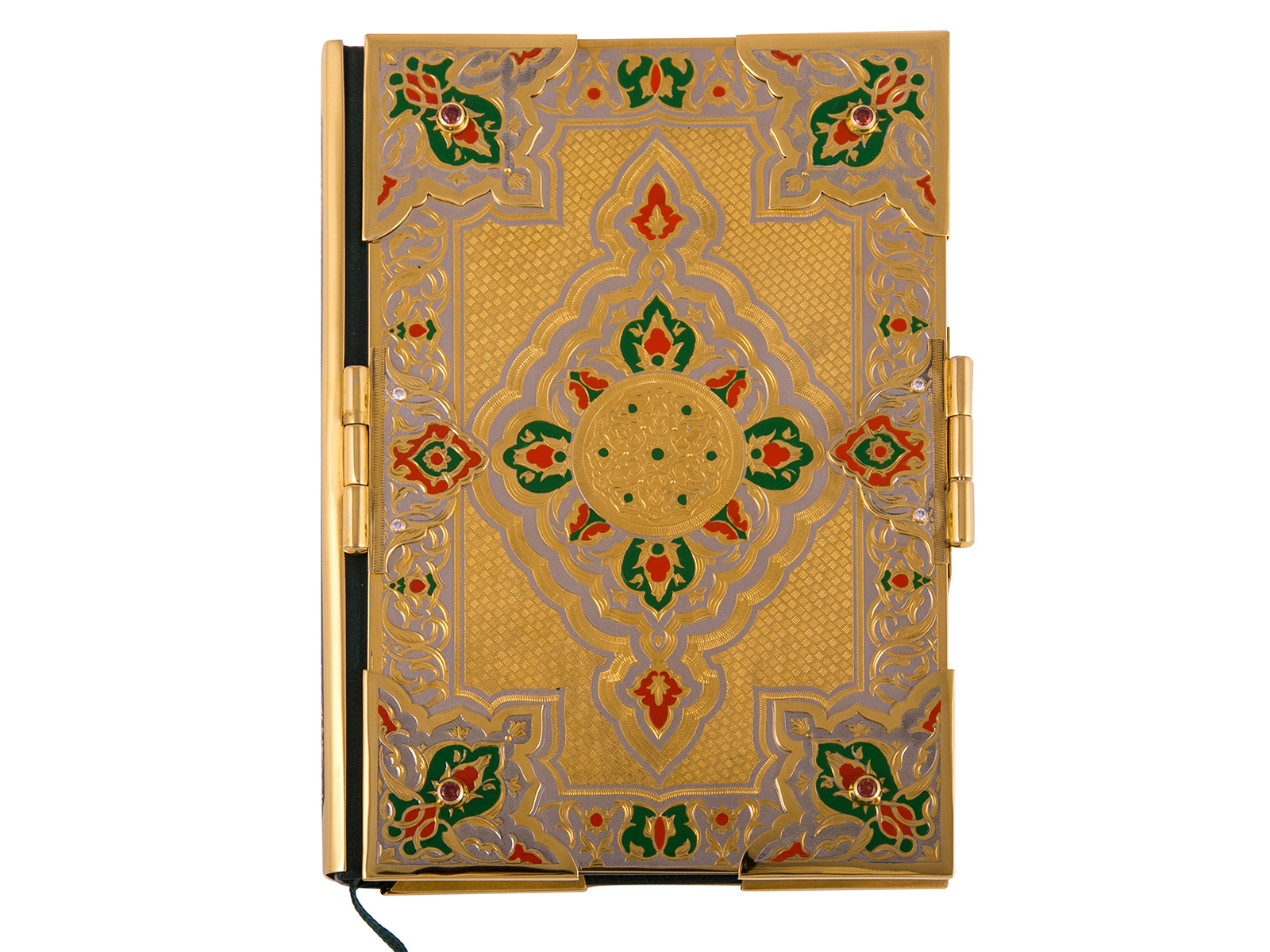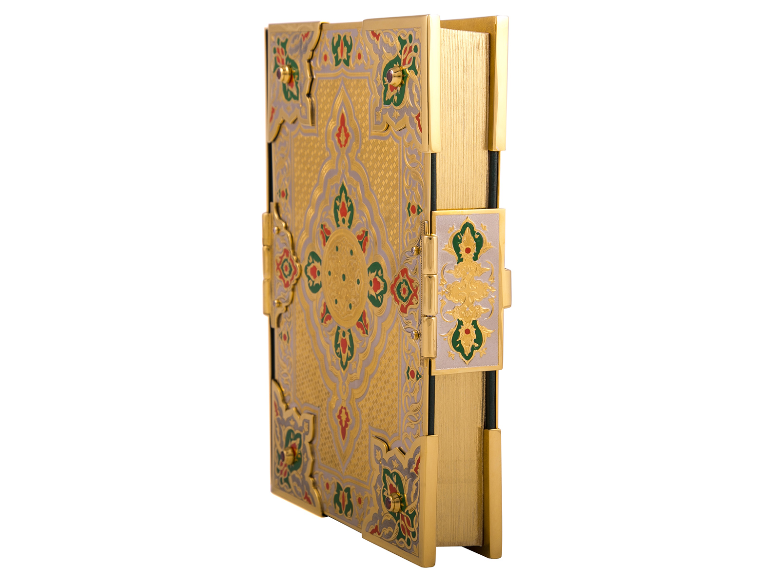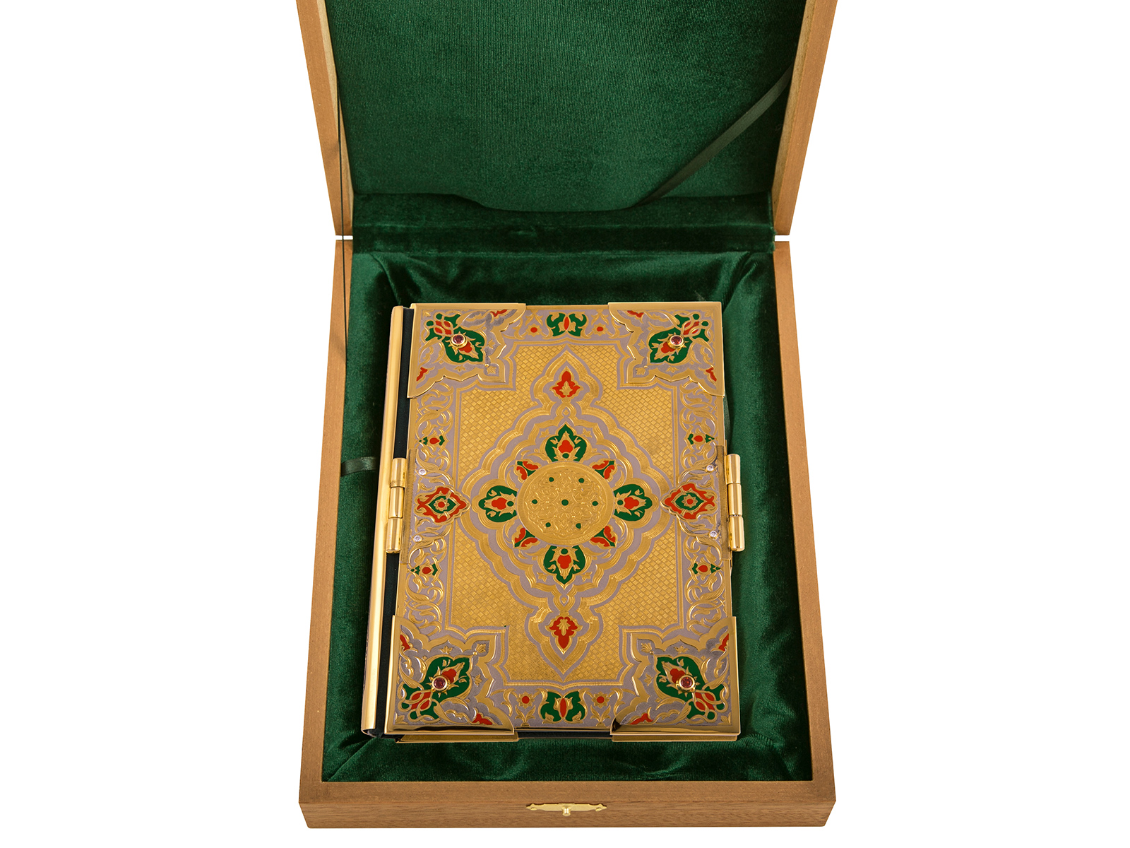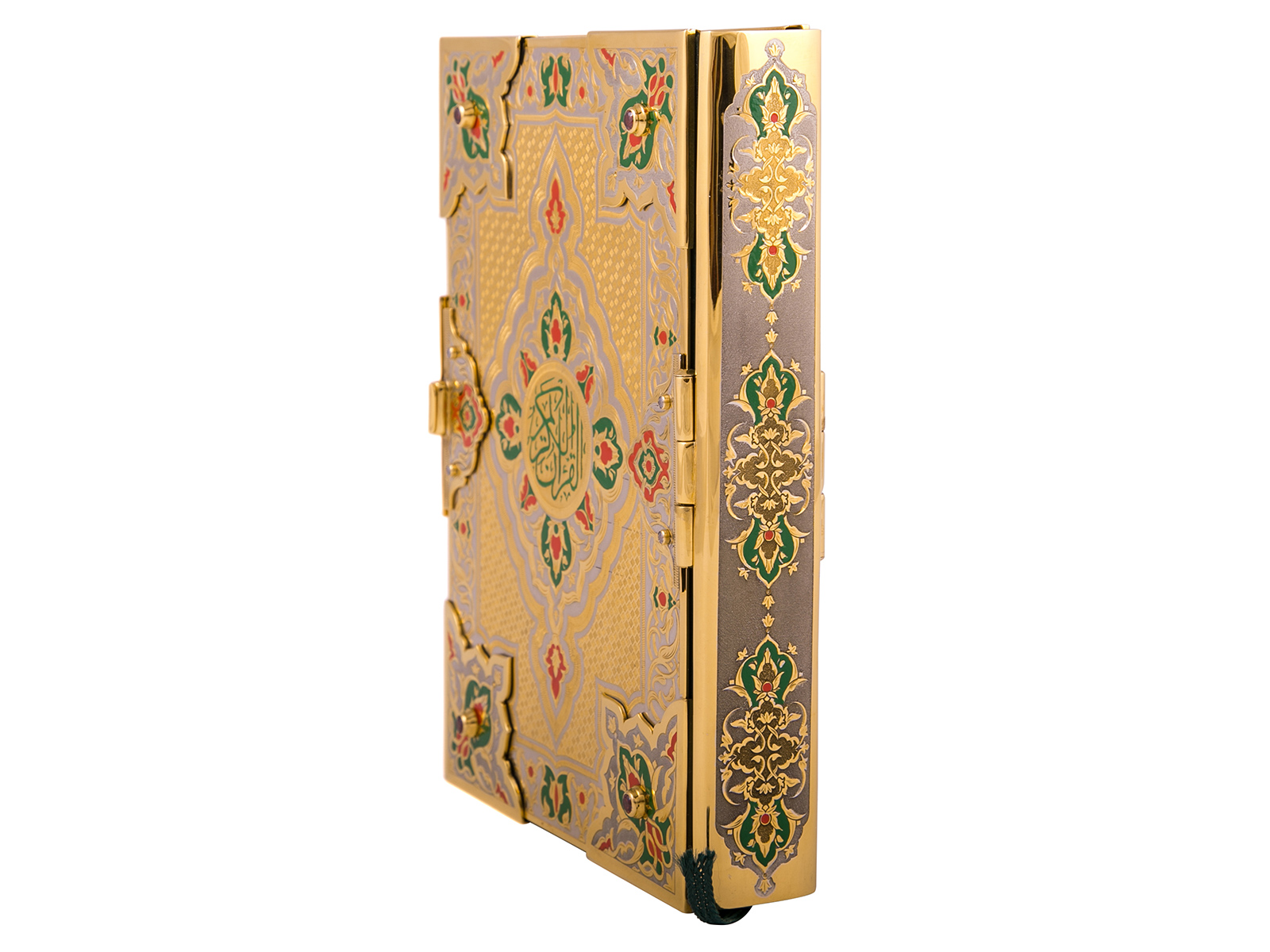 Уникальное издание Корана с золотым тиснением станет прекрасным и незабываемым презентом для верующих людей, которые ценят уникальность. Данное изделие эксклюзивно и неповторимо, так как является ручной работой. Обложка имеет оформление из латуни, инкрустацию фианитами и элементы с покрытием золота и никеля.