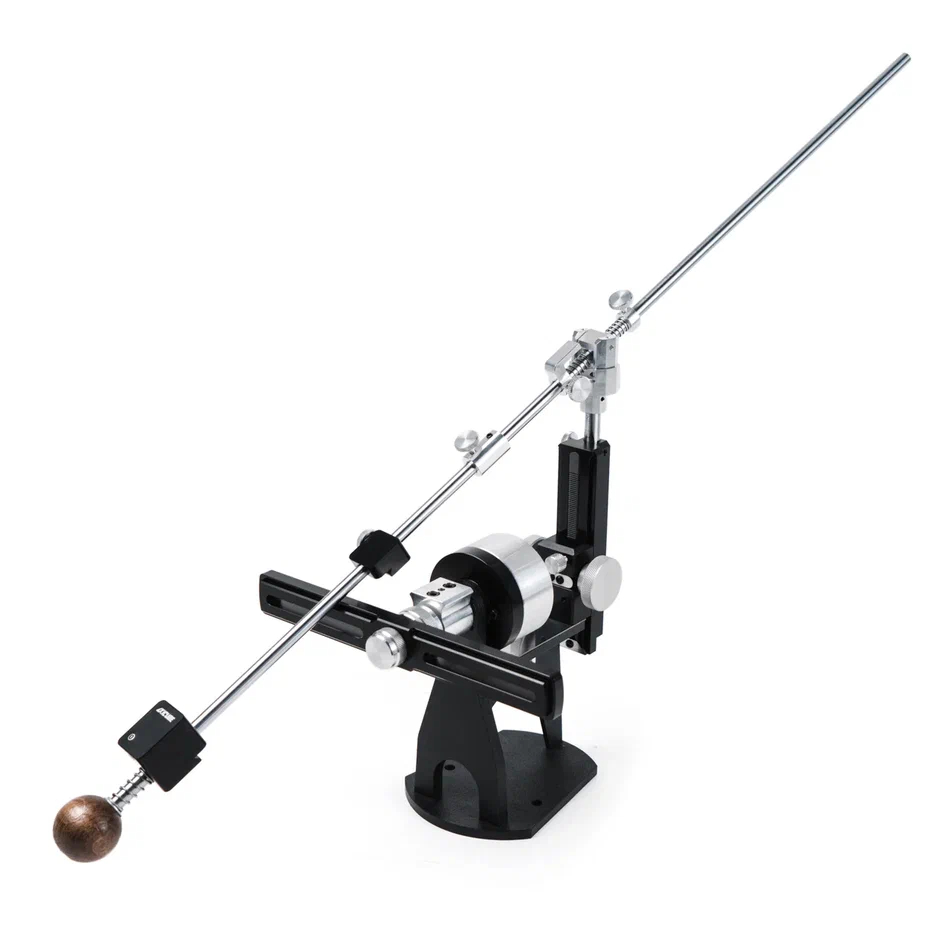 Реечный подъемник имеющий рейку с эвольвентным (зубчатым) зацеплением и бесступенчатой регулировкой, позволяет заточить ножи в диапазоне углов работы от 10° (с филейными зажимами от 8,5°) до 39° и на общий угол до 78°, с точностью до 0,1°. Корпус с увеличенным углом, за счет усовершенствованной конструкции, позволит заточить ножи в диапазоне углов работы. Ответная часть подъемника изготовлена из прочного авиационного алюминия. Он обеспечивает отличную плавность хода, благодаря усовершенствованной форме зубьев стальной рейки. Крепление ползуна происходит через соединение типа ласточкин хвост, что исключает люфты механизма при работе, которые могли бы сказаться на качестве заточки. Шкала измерения углов нанесена на боковую поверхность ползуна и дает возможность визуально контролировать их установку. Для обеспечения работы механизма реечного подъемника применяется высококлассная тефлоновая смазка. Она образует скользкую, устойчивую к коррозии прозрачную пленку, гарантирующую плавность хода, а также защиту от воды, масла, грязи и пыли.