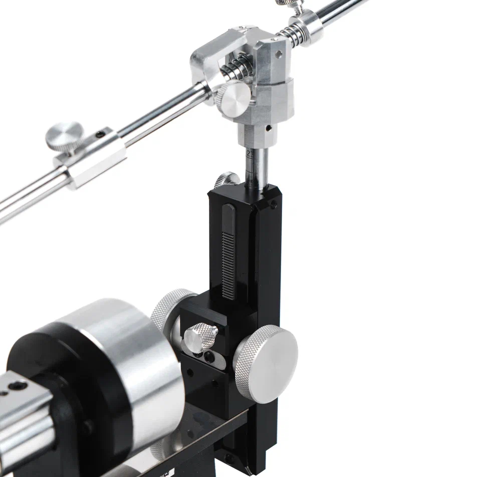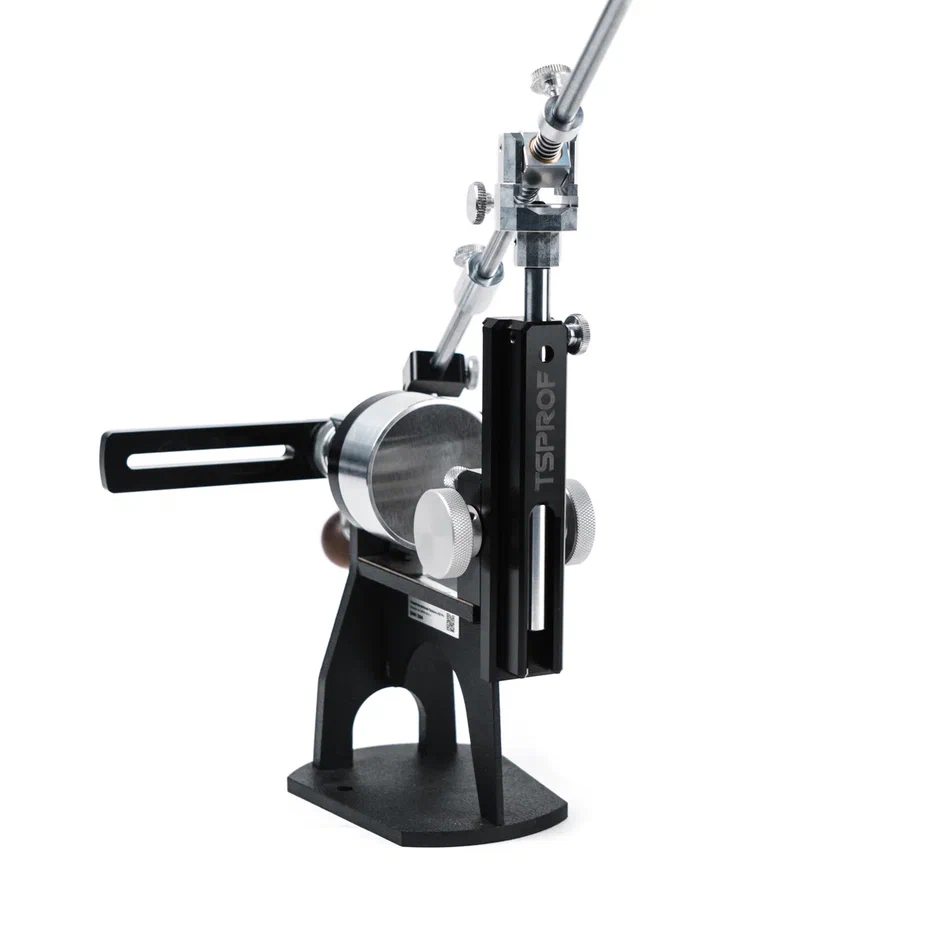 В комплекте с держателем абразива имеется устройство для измерения угла заточки – Axicube - I. Разработанный специально для систем заточки угломер встроен в корпус подвижного упора держателя и позволяет отслеживать параметры угла заточки в реальном времени. Axicube имеет жесткую связь с держателем абразива и находится в плоскости абразивного камня. Это позволяет получить максимальную точность угла в процессе работы. Позволяет выставлять угол с точностью до 0,1°. Axicube имеет алюминиевый корпус с черным анодированием, обладает влаго- и пылестойкостью, устойчив к вибрациям, падениям и перепадам температур. Может эксплуатироваться при температурах от 0 до +40°С. Заряжается от стандартной зарядки USB Type-C . Каждый Axicube проходит калибровку на производстве с помощью поверенных средств измерения. Перед применением с помощью специальной калибровочной призмы ему задается начальный угол отсчета. При перестановке заточного устройства на другую поверхность, необходима новая калибровка с помощью призмы.