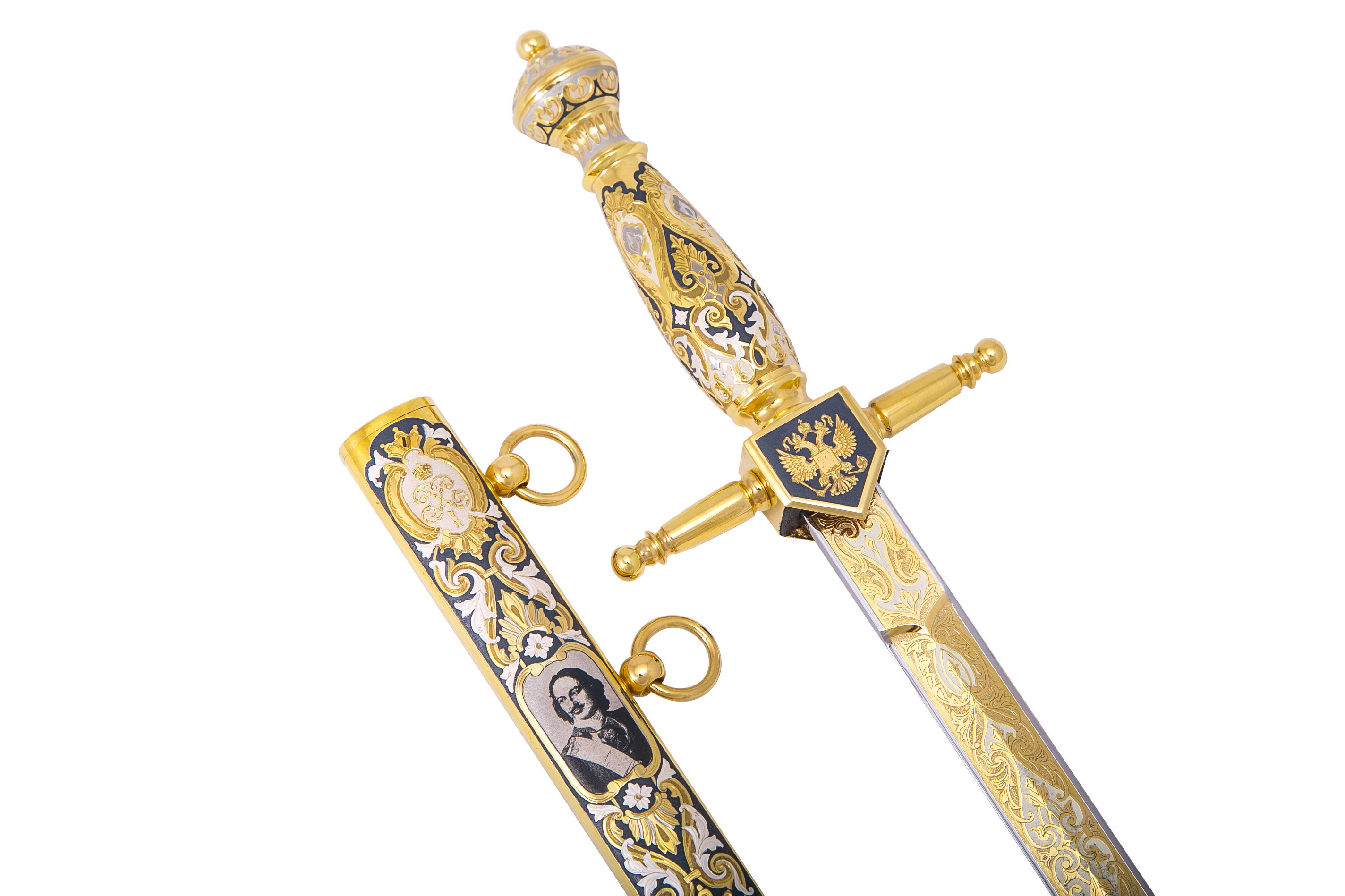 Строгий в своем исполнении сувенирный кортик ручной работы станет приятным подарком для любителей или коллекционеров качественного холодного оружия. Рукоятка украшена гербом РФ, лезвия – причудливыми вензелями. Аналогичный дизайн с элементами морской тематики и портретом Петра Первого присутствует и на ножнах.