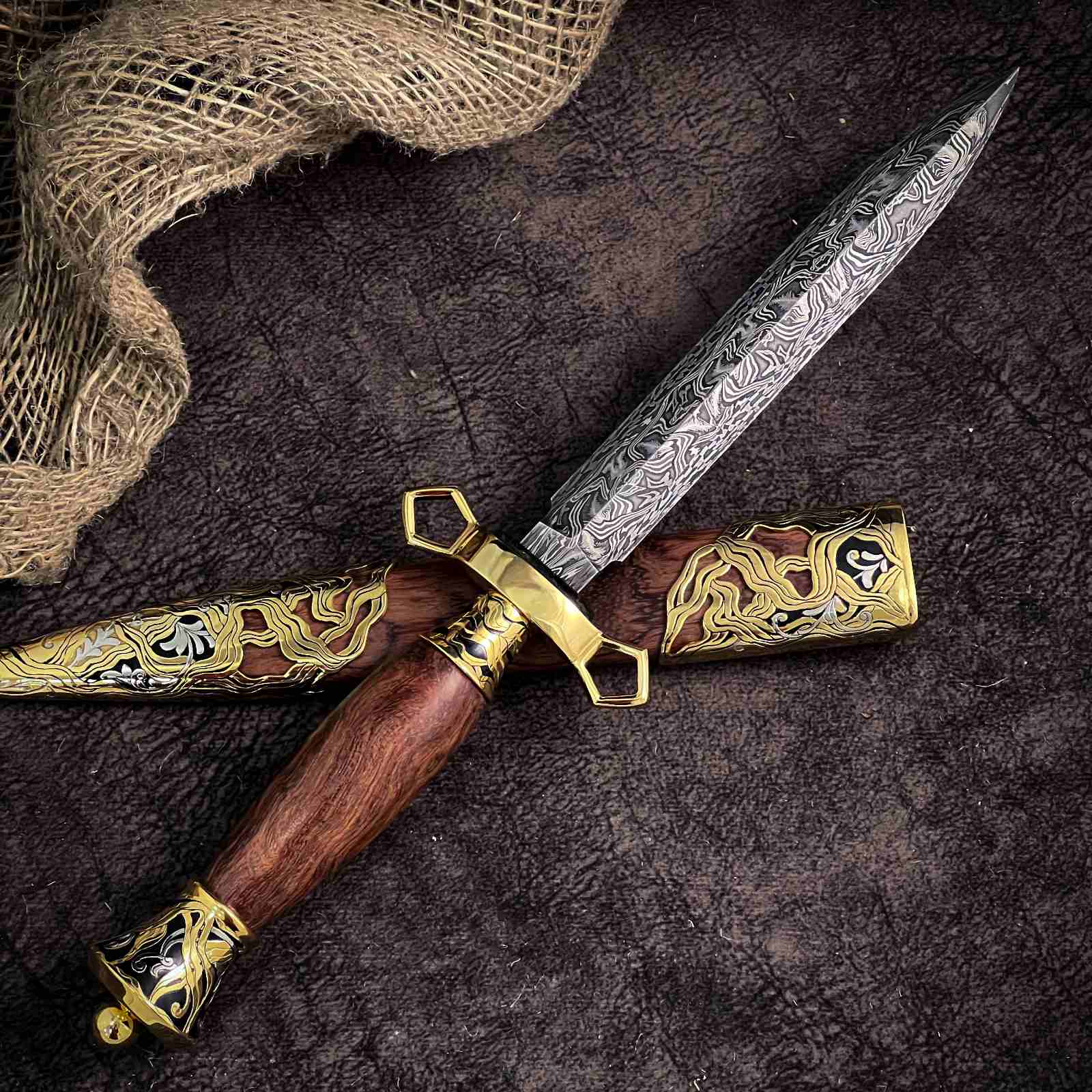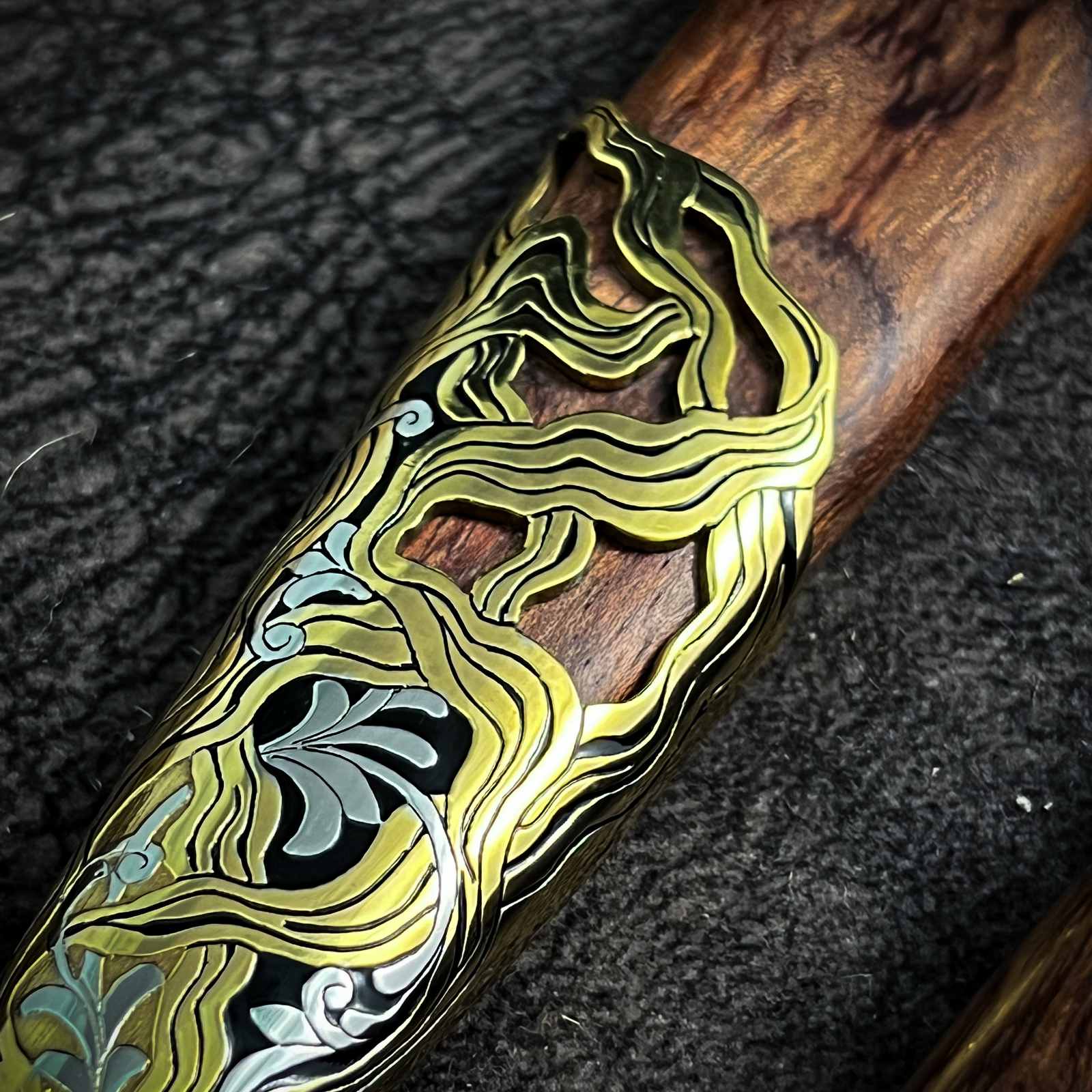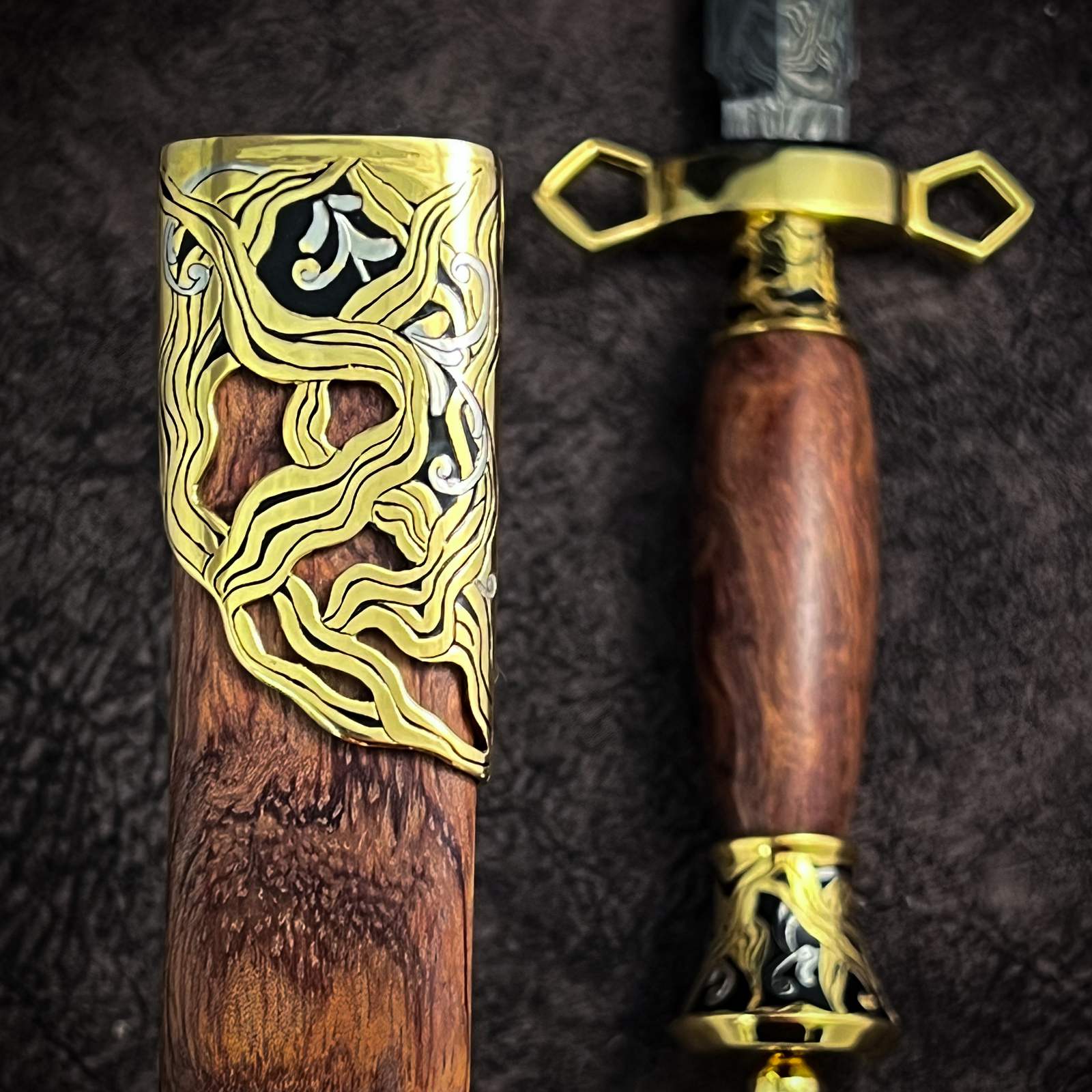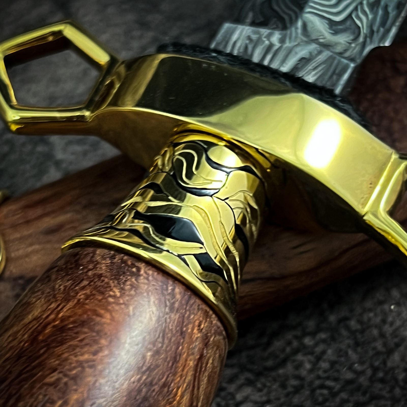 Мозаичный дамаск на клинке, бубинго изумительной фактуры, просечка - все максимально приведено к форме узловатых корней. Покрытие фурнитуры никелем, золотом, эмалью.