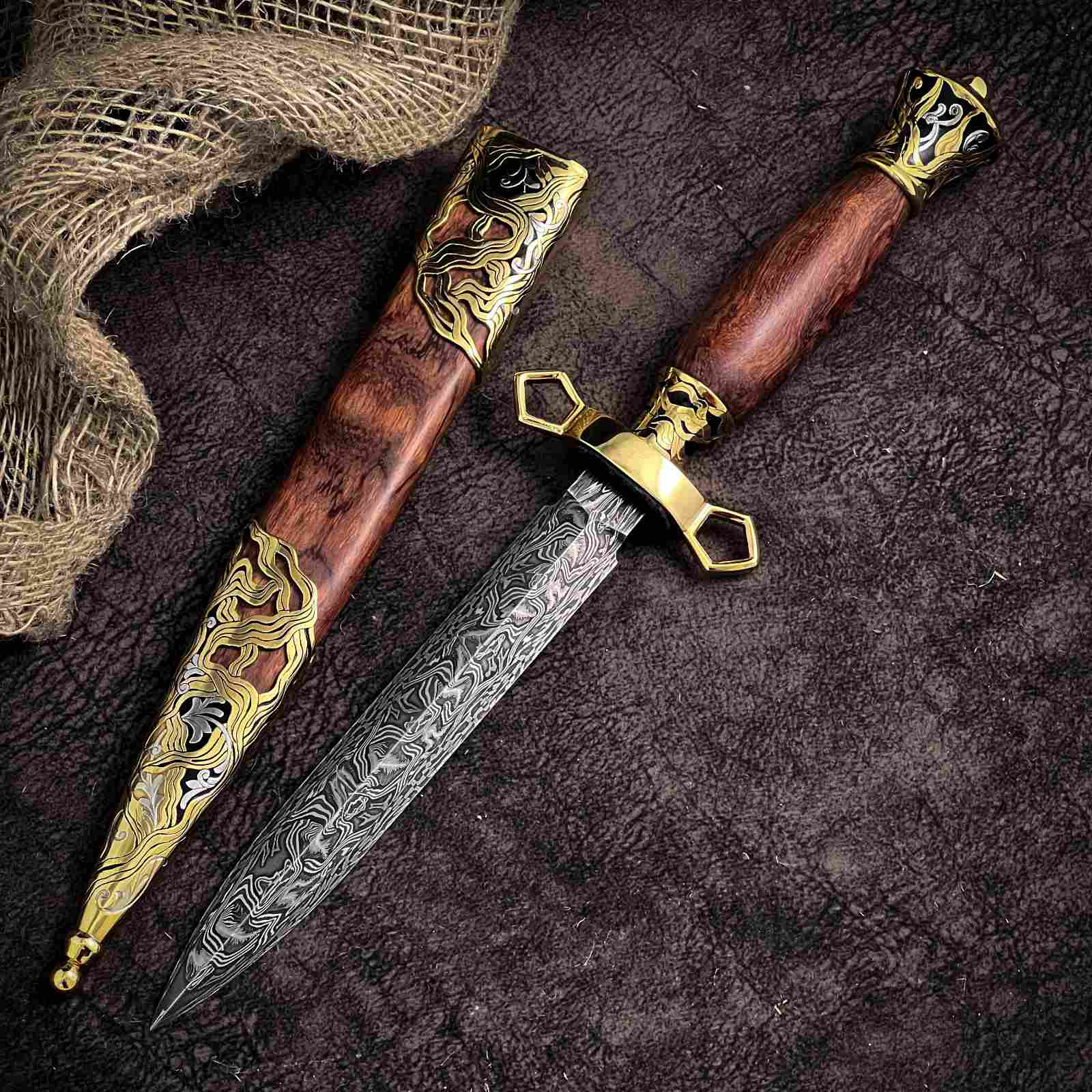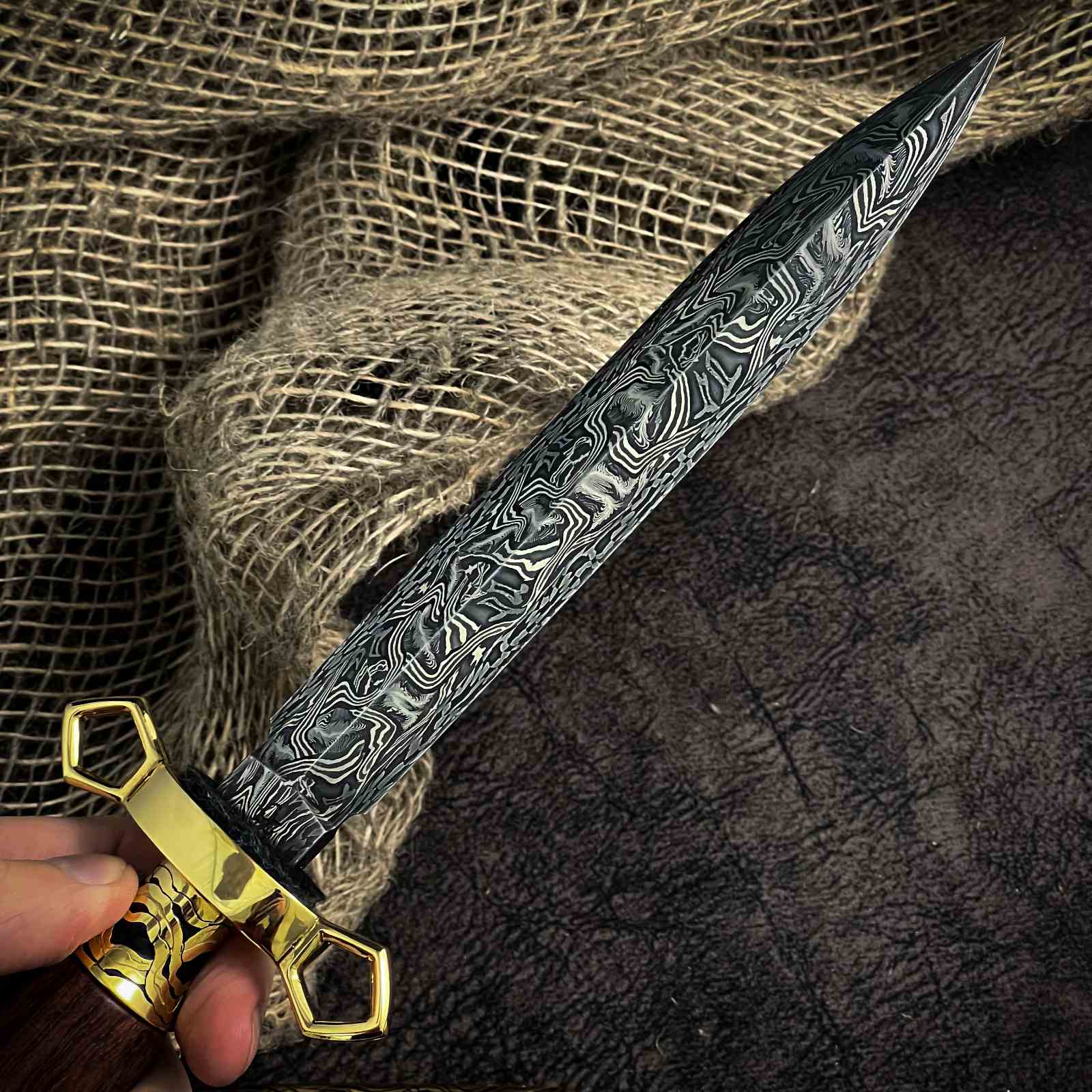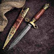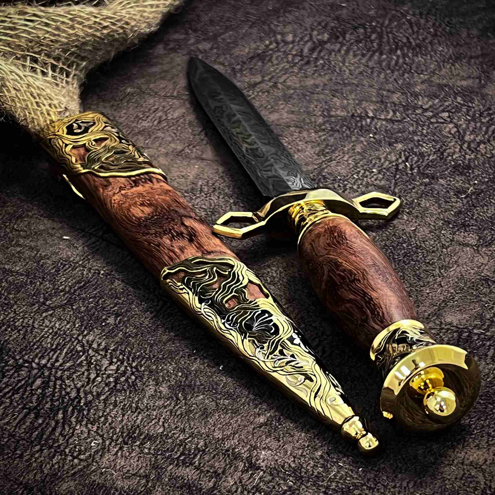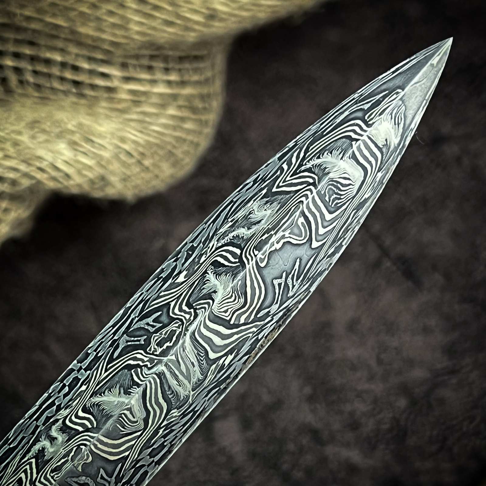 Мозаичный дамаск на клинке, бубинго изумительной фактуры, просечка - все максимально приведено к форме узловатых корней. Покрытие фурнитуры никелем, золотом, эмалью.