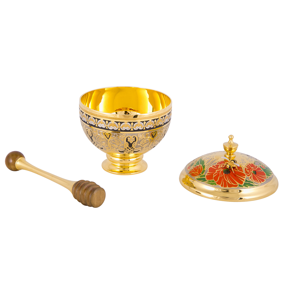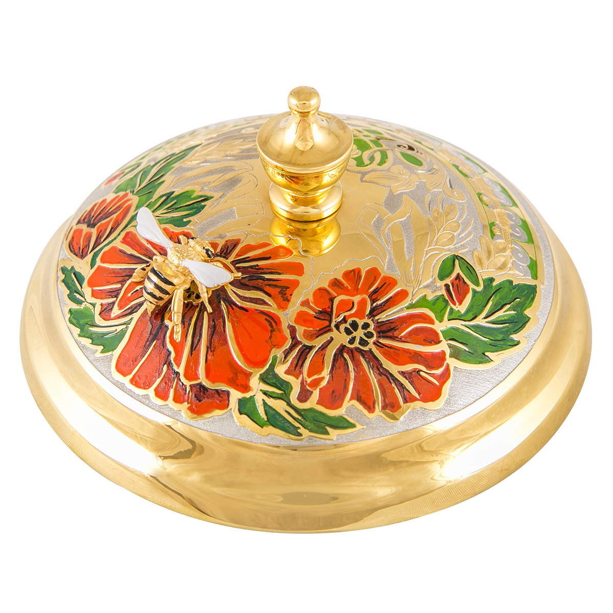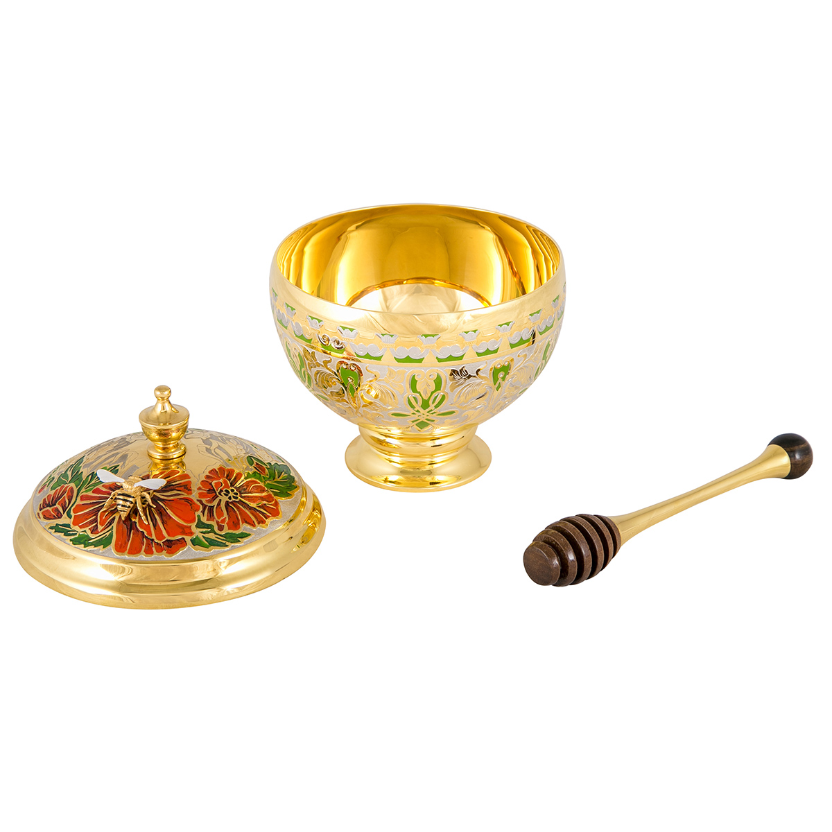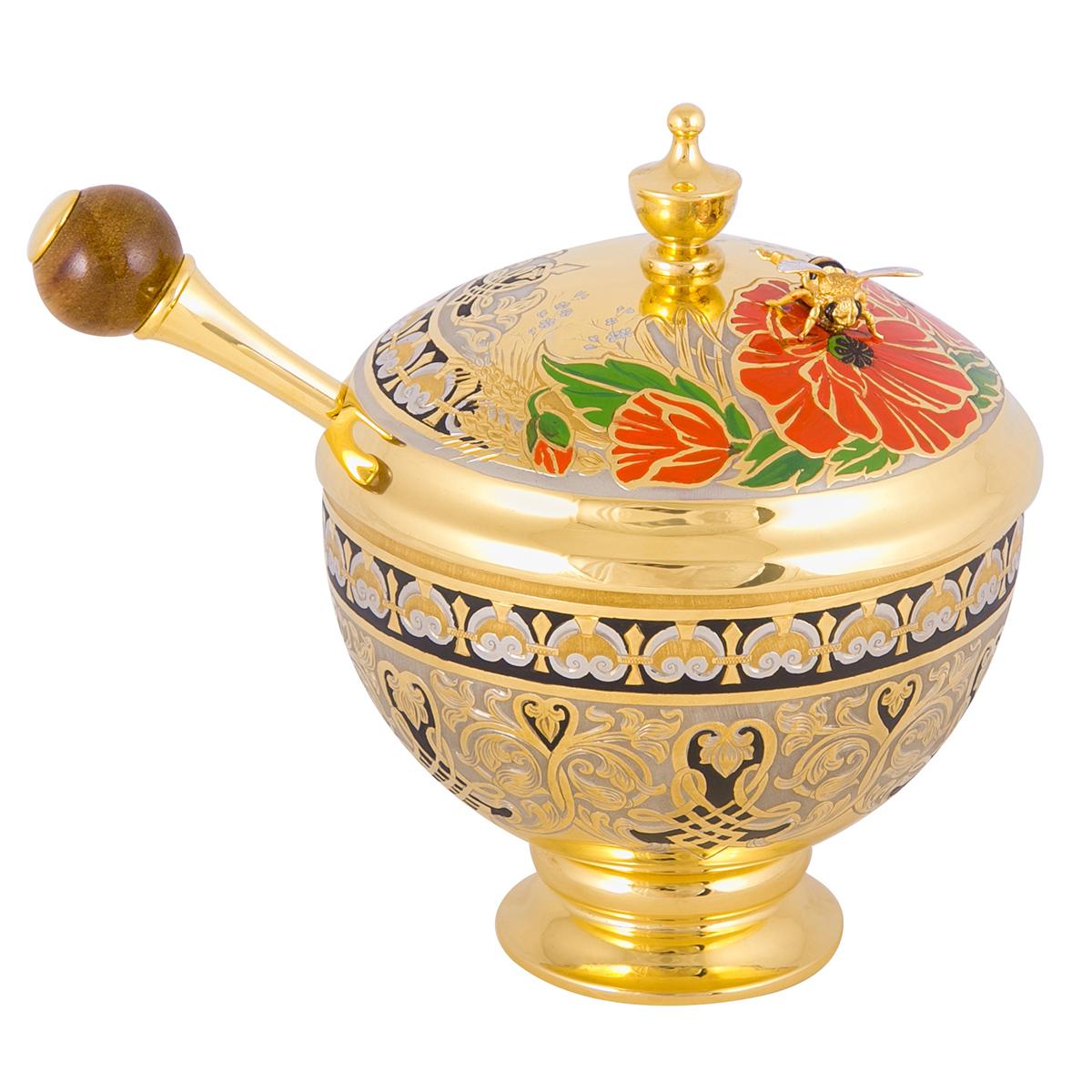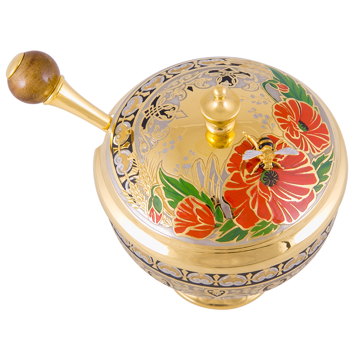 Компактная медовница с объемной фигурой пчелы на крышке наверняка добавит настроения своему владельцу. Яркая композиция украсит любой стол и поможет сохранить любимое лакомство в своем первозданном жидком виде. «Пчёлка» изготавливается из латуни, покрывается золотом и никелем. В комплекте идет и специальная ложечка, делающая процесс забора меда еще проще!