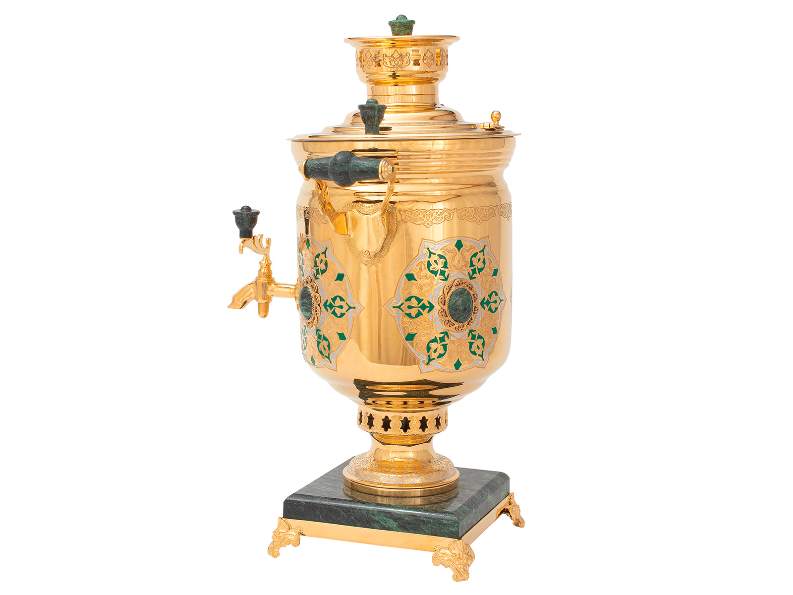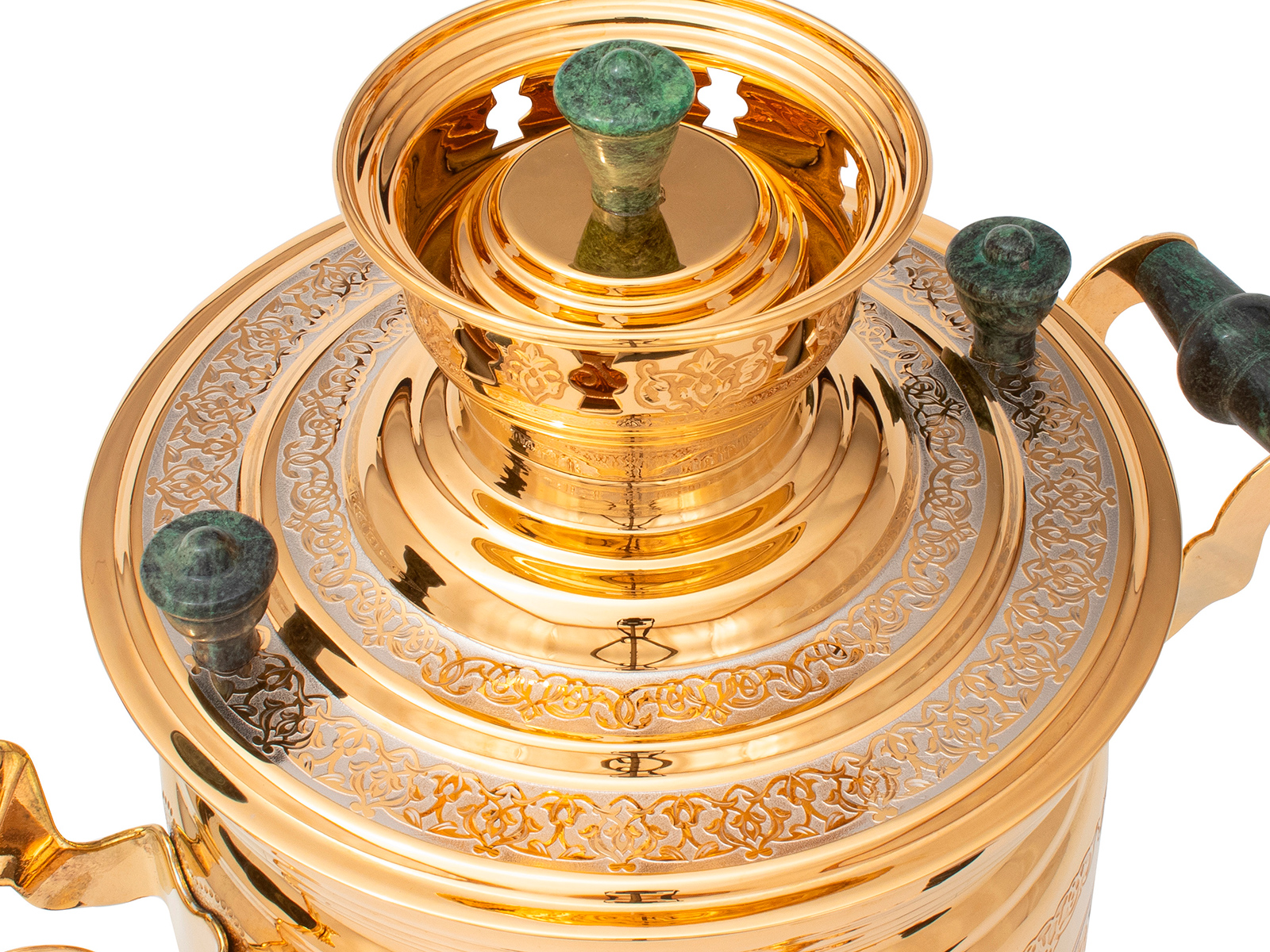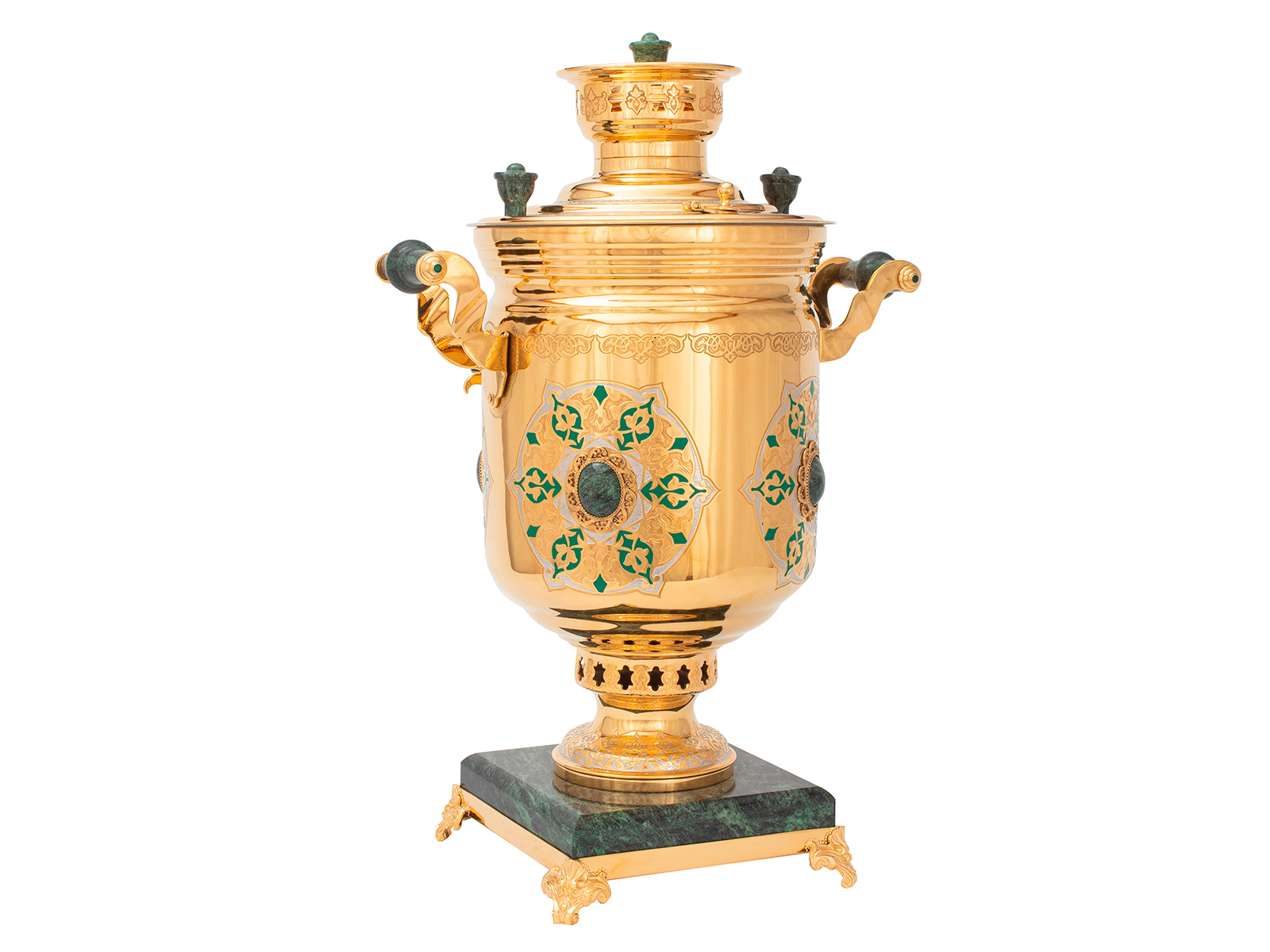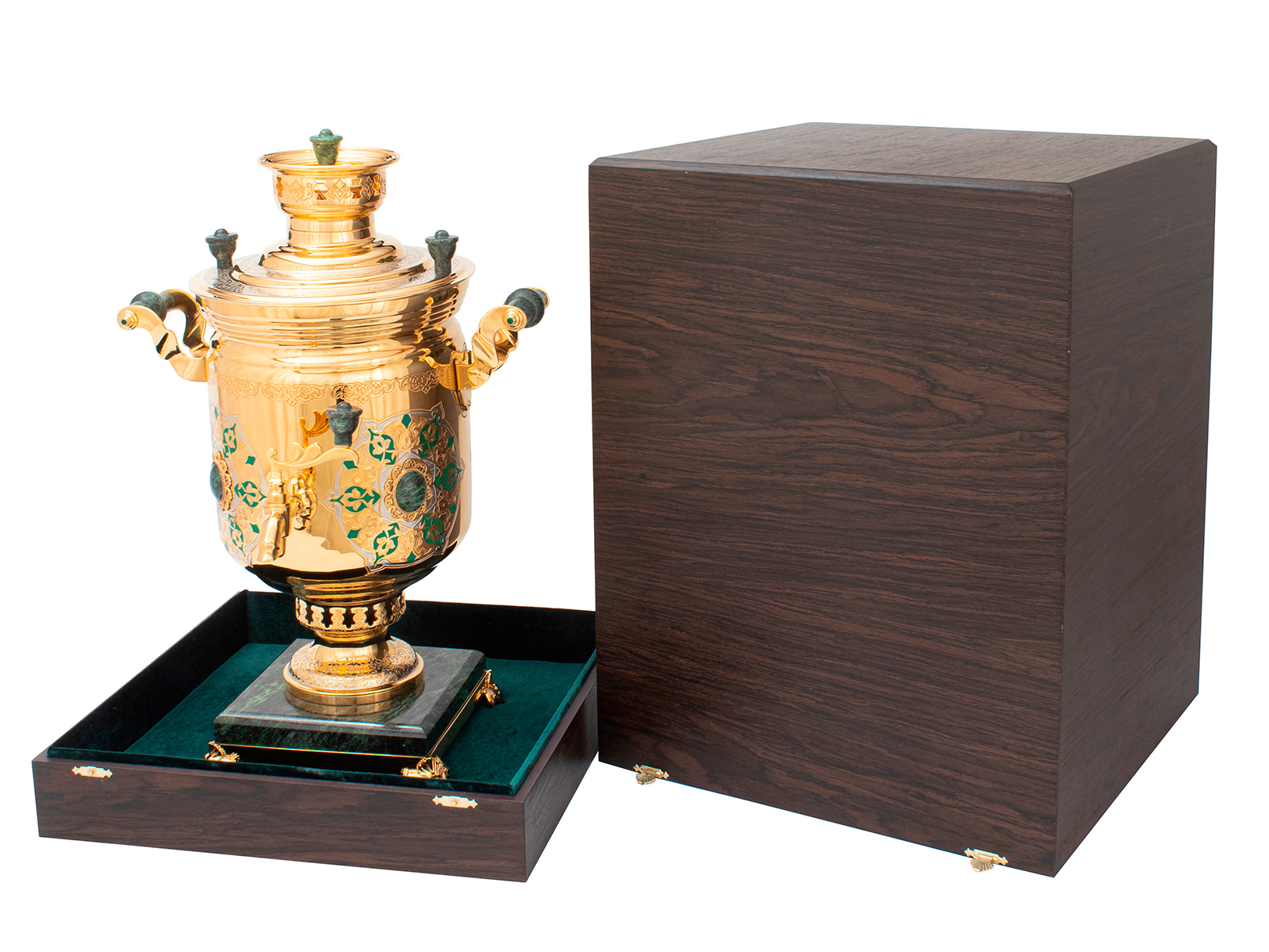 Купить чайный набор с самоваром Купеческий это эксклюзивный подарок который подойдет для торжественных случаев, так и для повседневного жизни, делая чайный ритуал волшебным и незабываемым. В набор чайный "Купеческий" входит: самовар, 4 подстаканника и 4 тарелки