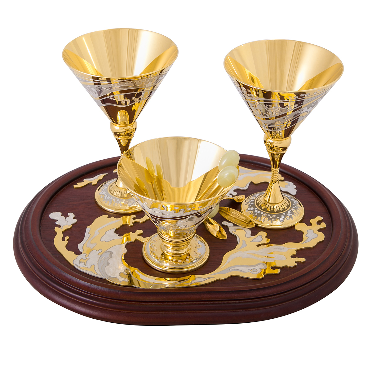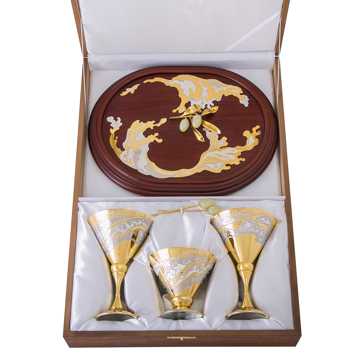Набор для мартини «Олива» - изысканный и дорогой подарок на свадьбу, который еще долгое время будет напоминать молодоженам о столь значимом событии в их жизни. Вычурные бокалы с росписью ручной работы не тускнеют с течением времени, не выходят из моды и не надоедают своим обладателям. Украшенная посуда Златоуста упаковывается в короб из ценных пород дерева.