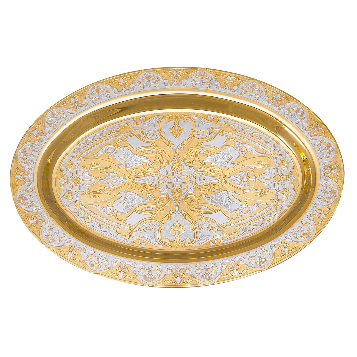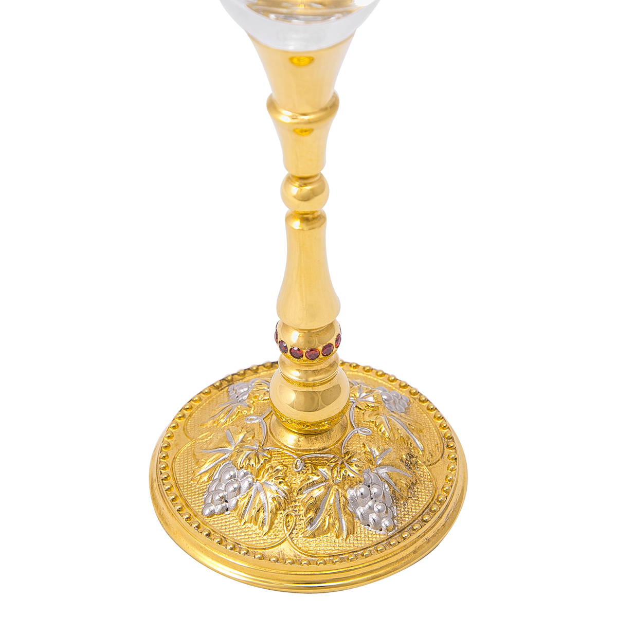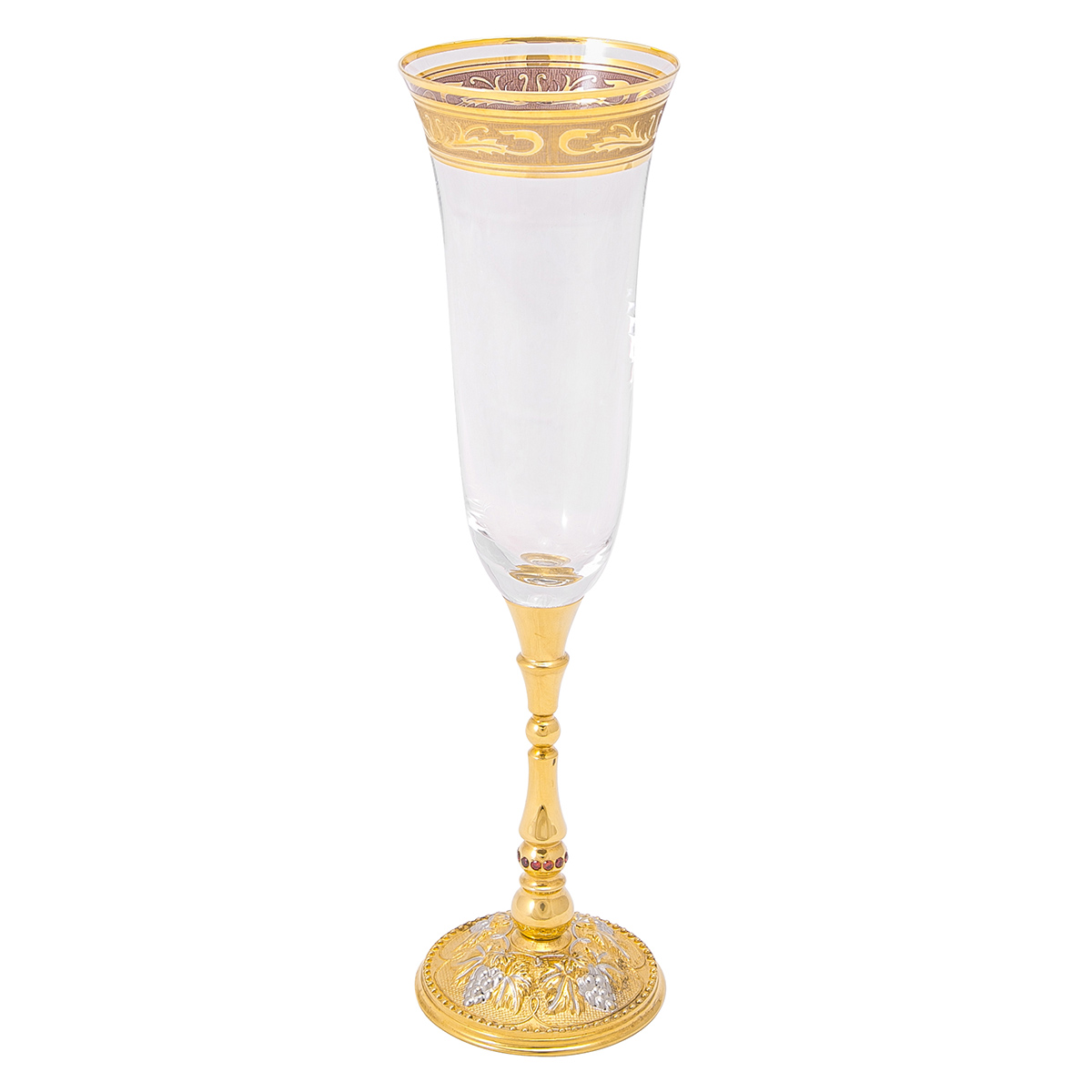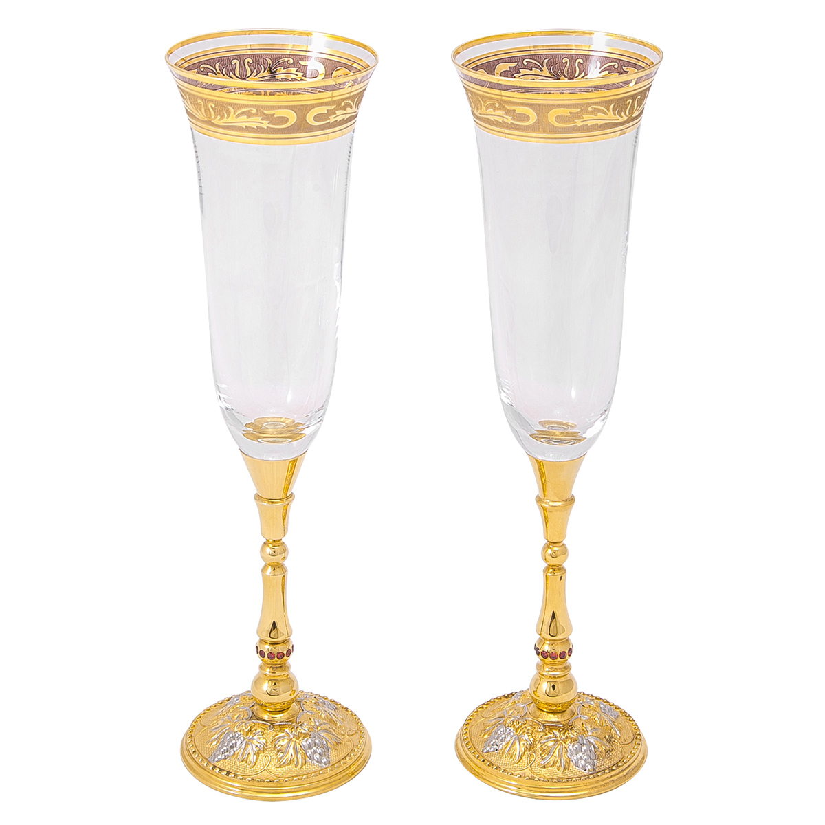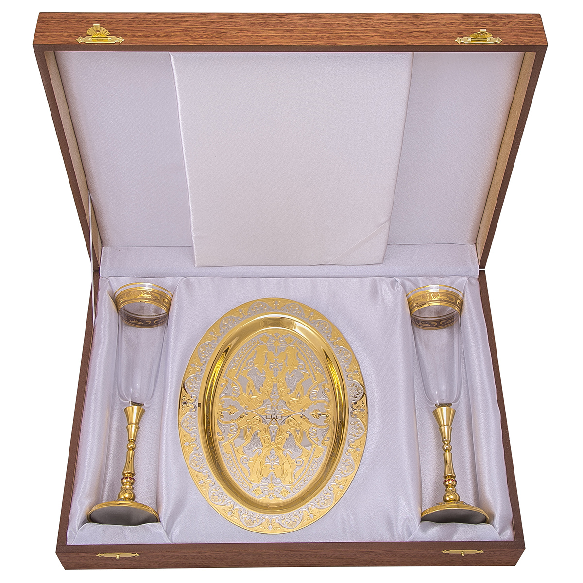 Символом долгой и счастливой семейной жизни, а также достойным подарком на свадьбу может стать набор из двух фужеров и тарели под них. Изделия выполняются из богемского стекла и декорируются узорными вензелями в золотистой гамме. Аналогичная концепция прослеживается и в оформлении тарели. Нижняя часть ножки фужера выполнена из позолоченной латуни и украшена фианитами, делающими композицию более изысканной и нарядной. Набор предлагается в подарочной коробке.
