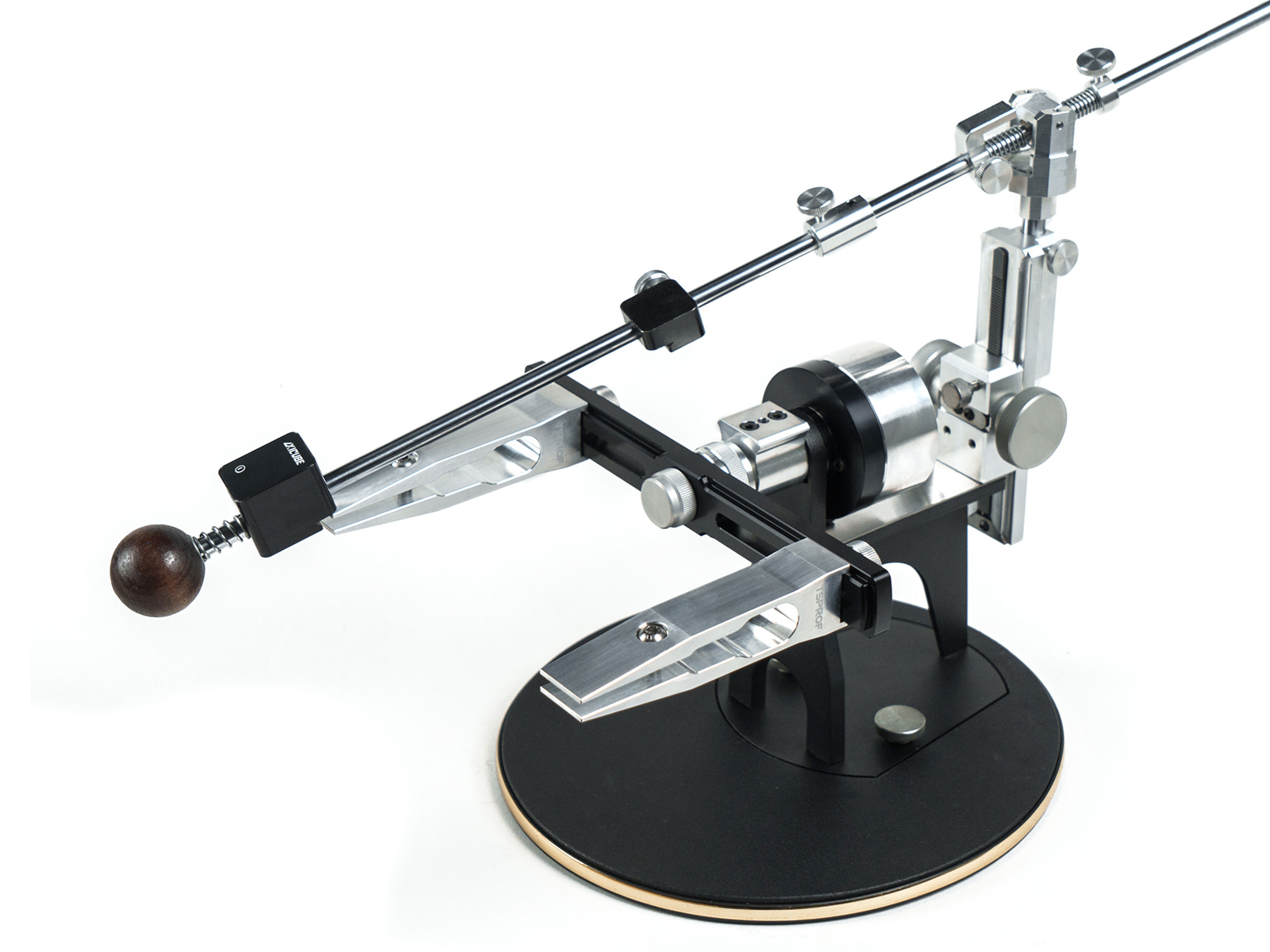 Универсальный держатель позволят использовать с точилкой любые абразивные камни как на бланках, так и без бланков. Держатель абразива не имеет металлической подложки, но благодаря специальной геометрии упоров позволяет фиксировать абразивы максимально надежно. Штанга держателя абразива имеет увеличенную длину в 694 мм, выполнена из стали и обладает высокой жесткостью. Штанга держателя — разборная и соединяется алюминиевой втулкой-муфтой, с посадочным креплением «на три точки», что дает максимальную соосность соединения. Для регулировки штанга оснащена удобным винтом-барашком, соединение штанги происходит одним движением.