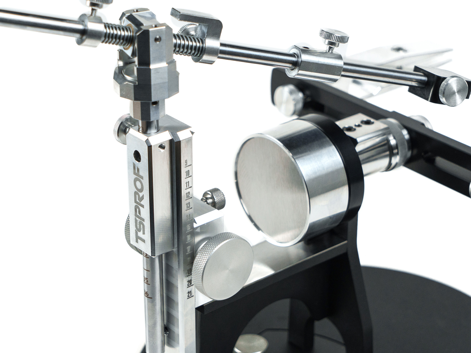 Уникальный вращающийся механизм имеет широкий рычаг, который облегчает вращение и обеспечивает надежную авто-фиксацию рамки для зажимов. Благодаря системе пружин и подшипников рама переворачивается без износа механизма. Корпус системы авторазворота выполнен из прочного авиационного алюминия, с анодированием в черный цвет. Ввиду особенностей процесса анодирования, оттенок покрытия может отличаться на разных деталях. Допустимая погрешность при перевороте рамки составляет 0,3°.