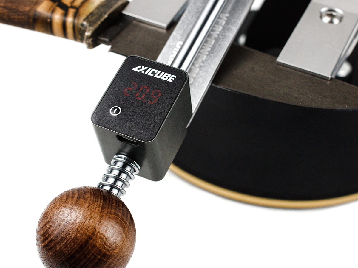 В комплекте с держателем абразива имеется устройство для измерения угла заточки – Axicube. Разработанный специально для систем заточки угломер встроен в корпус подвижного упора держателя и позволяет отслеживать параметры угла заточки в реальном времени. Axicube имеет жесткую связь с держателем абразива и находится в плоскости абразивного камня. Это позволяет получить максимальную точность угла в процессе работы. Позволяет выставлять угол с точностью до 0,1°. Axicube имеет алюминиевый корпус с черным анодированием, обладает влаго- и пылестойкостью, устойчив к вибрациям, падениям и перепадам температур. Ввиду особенностей процесса анодирования, оттенок покрытия может отличаться на разных деталях. Может эксплуатироваться при температурах от 0 до +40°С. Заряжается от стандартной зарядки micro-USB. Каждый Axicube проходит калибровку на производстве с помощью поверенных средств измерения. Перед применением с помощью специальной калибровочной призмы ему задается начальный угол отсчета. При перестановке заточного устройства на другую поверхность, необходима новая калибровка с помощью призмы.