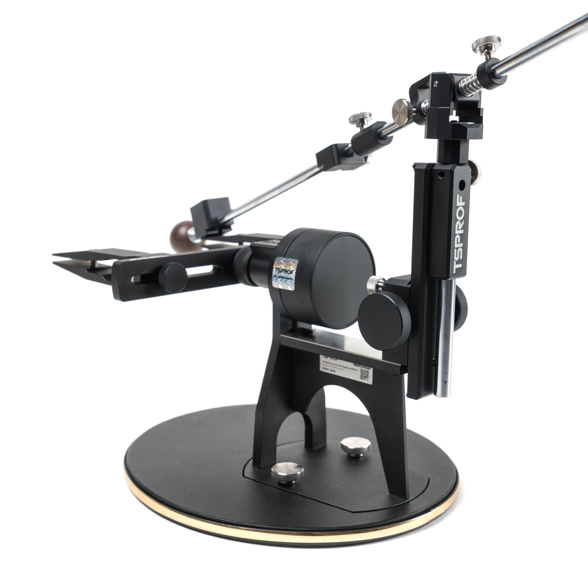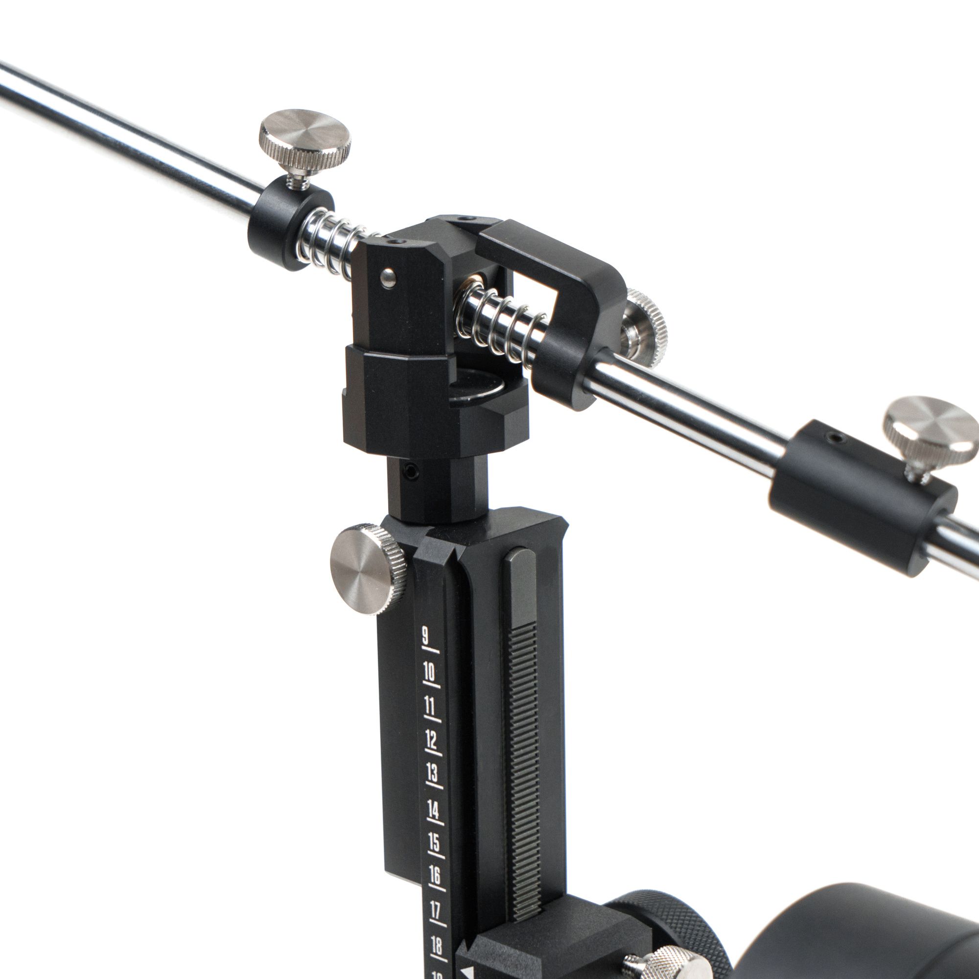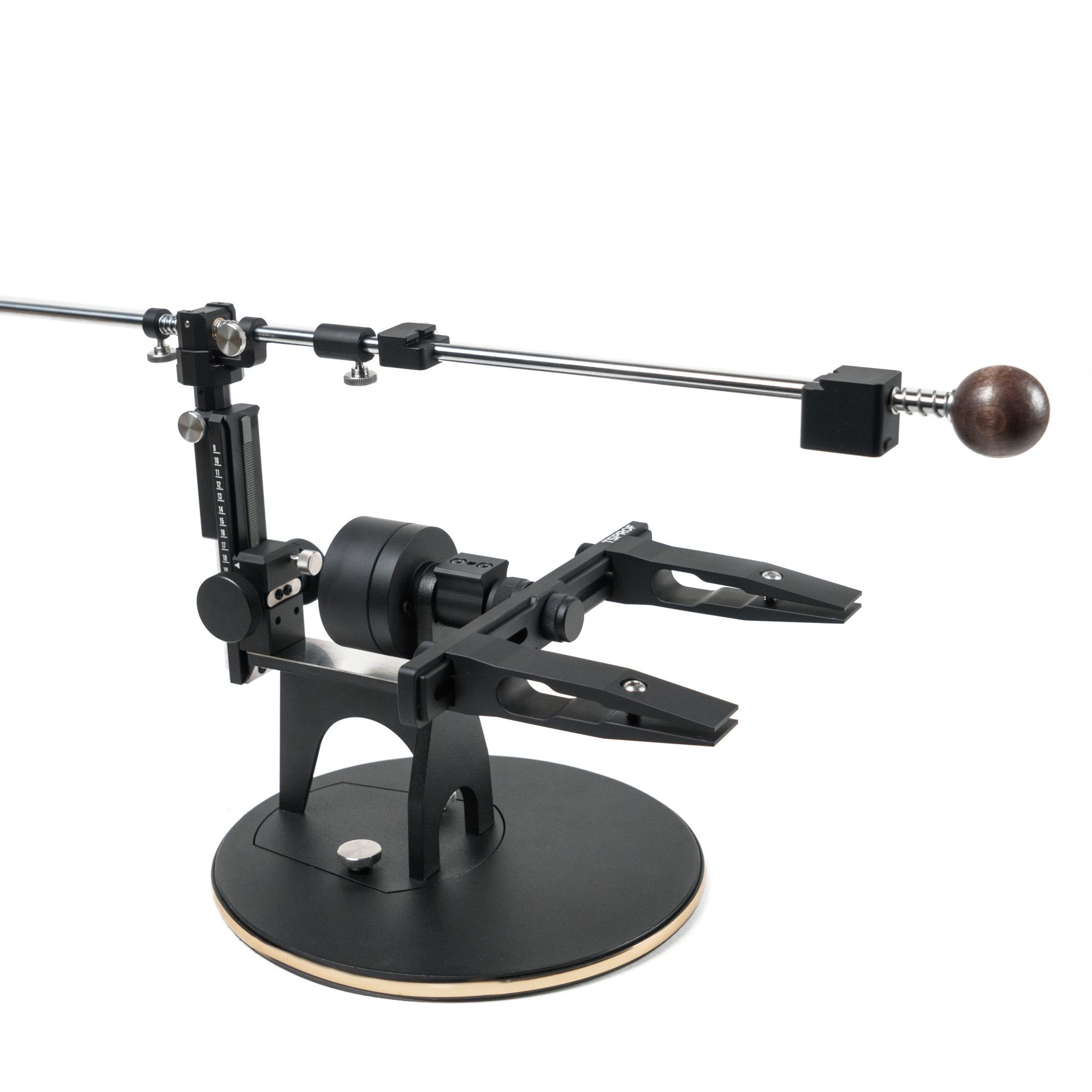 Универсальный держатель позволят использовать с точилкой любые абразивные камни как на бланках, так и без бланков. Держатель абразива не имеет металлической подложки, но благодаря специальной геометрии упоров позволяет фиксировать абразивы максимально надежно. Штанга держателя абразива имеет увеличенную длину в 694 мм, выполнена из стали и обладает высокой жесткостью. Штанга держателя — разборная и соединяется алюминиевой втулкой-муфтой, с посадочным креплением «на три точки», что дает максимальную соосность соединения. Для регулировки штанга оснащена удобным винтом-барашком, соединение штанги происходит одним движением.