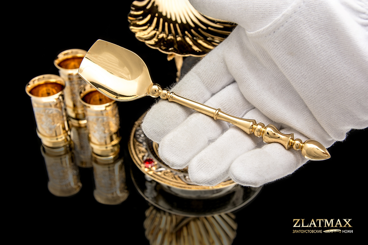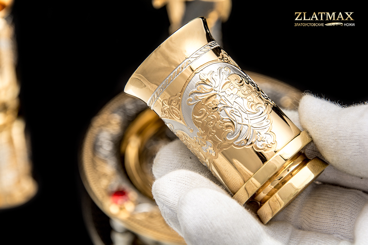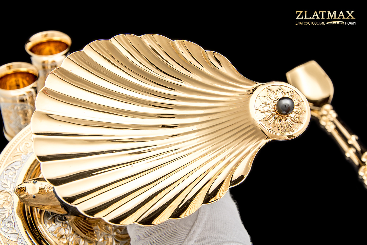Набор икорный «Белуга» с ложечкой, блюдцем и тремя стопками. Красивейший мотив раскрывается нам в этом комплекте. Позолоченная белуга, украшенная уникальной росписью и гравировкой. Элементы с применением чернения будто окутывают особой вуалью и придают таинственность изделиям. Блюдце украшено алыми камнями, и все в этом наборе блестит и идеально сочетается в своей роскоши и изысканности.