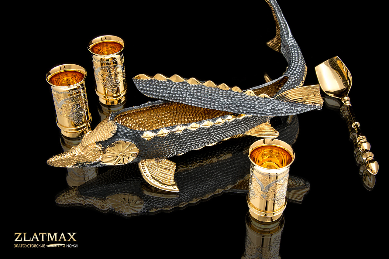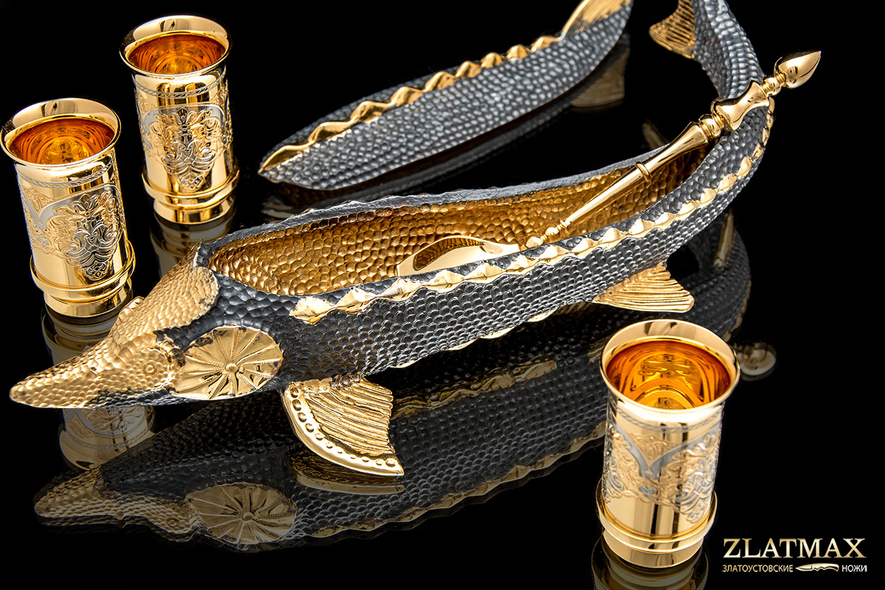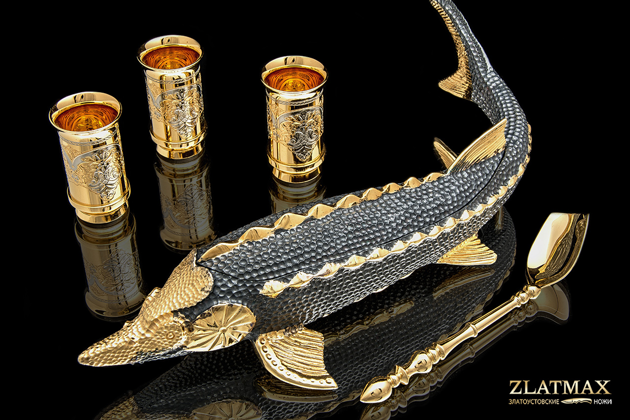 Купить Икорница со стопками "Осетр большой" это эксклюзивный VIP подарок который можно приобрести в нашем магазине "ЗЛАТМАКС". Только лучшие VIP подарки и дорогие сувениры от златоустовских оружейных заводов и фабрик. Быстрая доставка по всей России, возможна доставка самолетом!