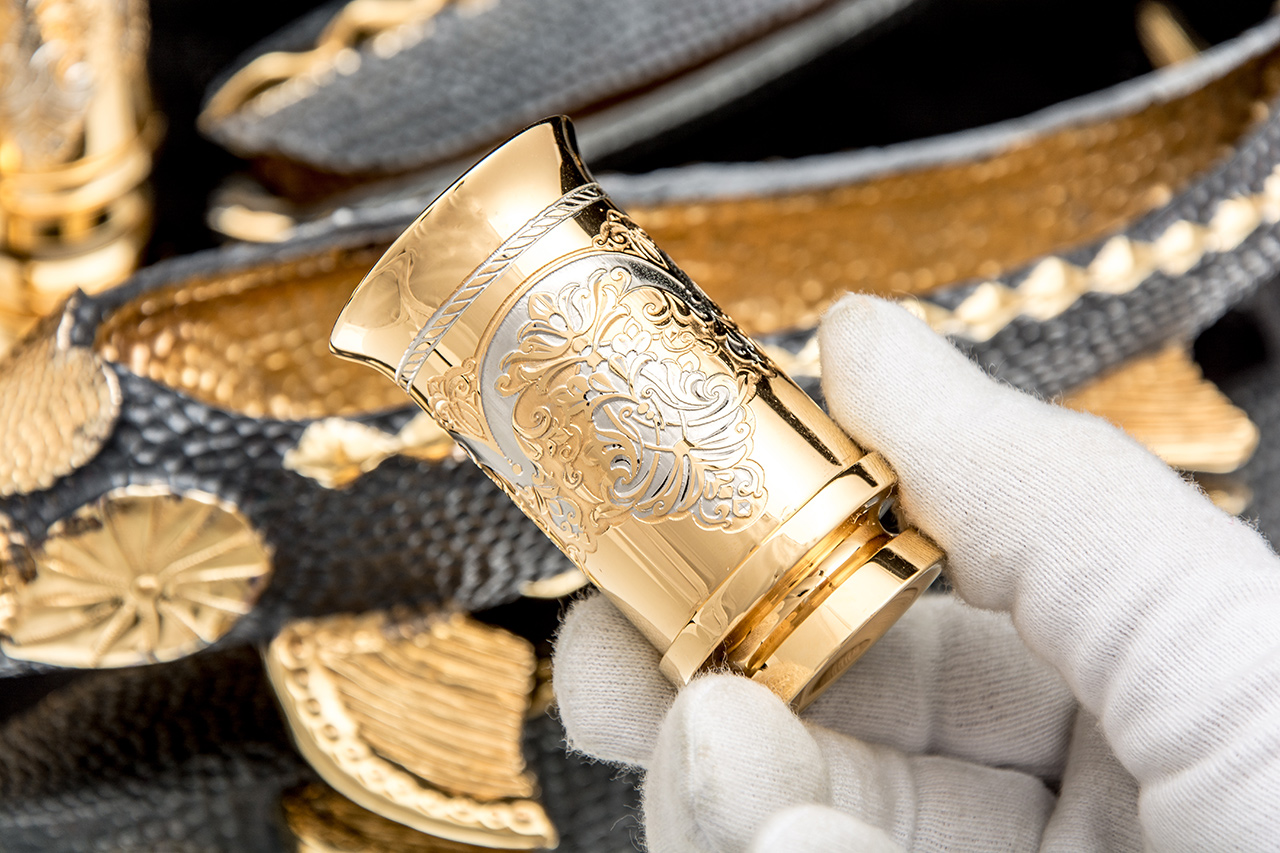 Набор икорный «Осетр большой» представляет из себя крупного осетра, который буквально усыпан черными икринками, с ложечкой и тремя стопками. Икорница - это символ достатка в доме, она никогда не теряет свою актуальность. И по сей день многие коллекционеры, и ценители дорогой и красивой посуды, желают иметь подобные произведения искусства. В этом комплекте мы видим тонкую и детальную прорисовку орнамента, сочетание различных техник: травления, золочения, серебрения и чернения серебра. Великолепная роспись, которую можно часами разглядывать, изучая каждый элемент и восхищаясь его неповторимостью.