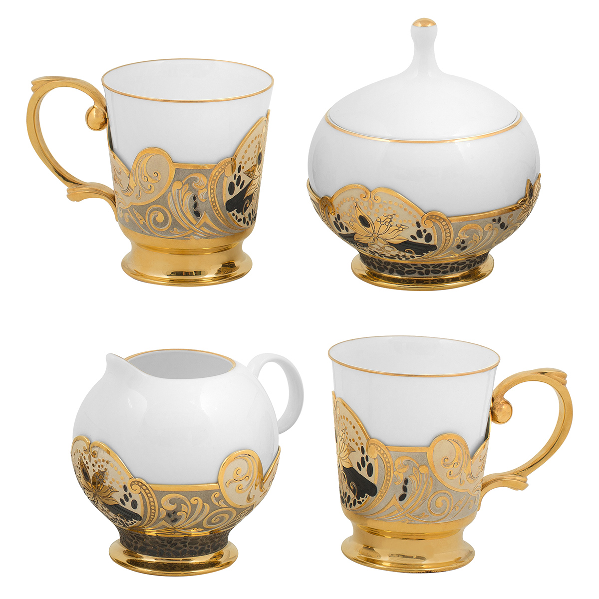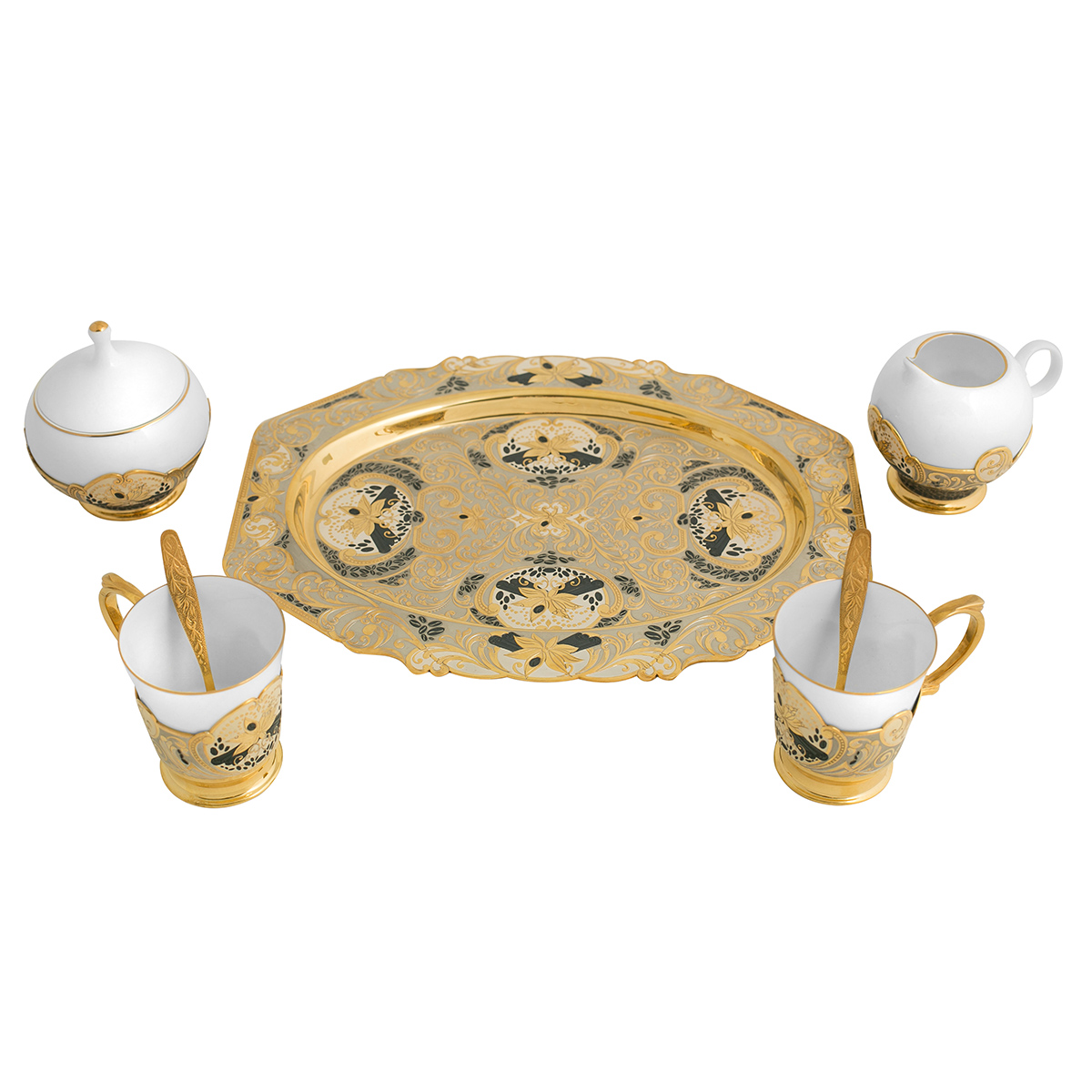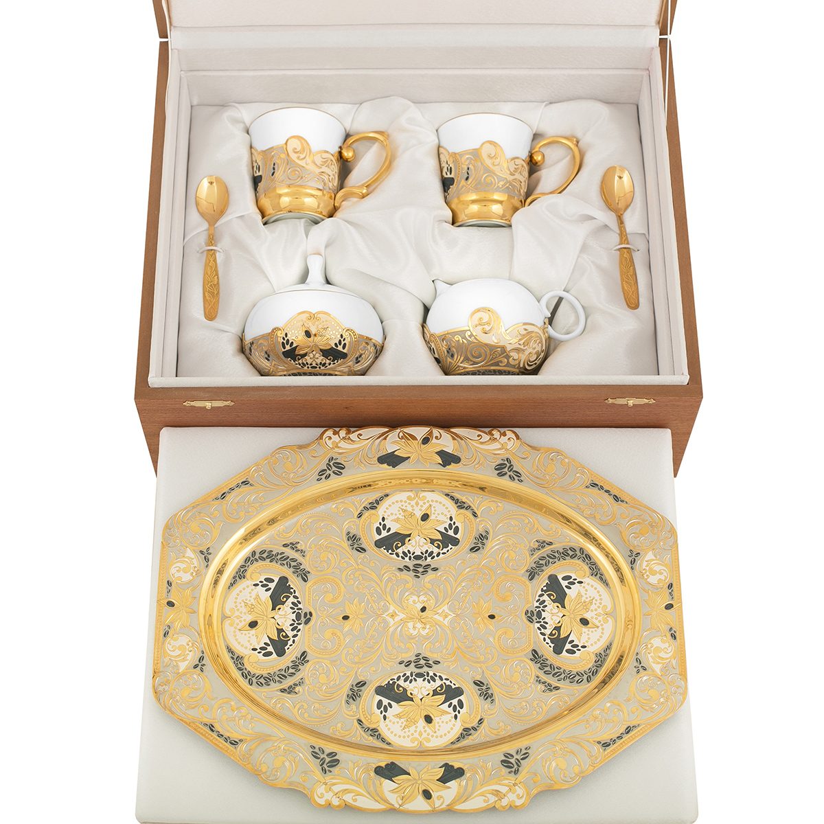 Купить Кофейный набор «Кофе с корицей» станет дорогим и оригинальным подарком для каждой женщины и прекрасным украшением обеденного стола. В эксклюзивную коллекцию входят 2 чашки, 2 ложки, сливочник, сахарница, изготовленные из костяного фарфора, и круглое блюдо из латуни. Уникальные изделия ручной работы украшены гравировкой и покрыты золотом и серебром.