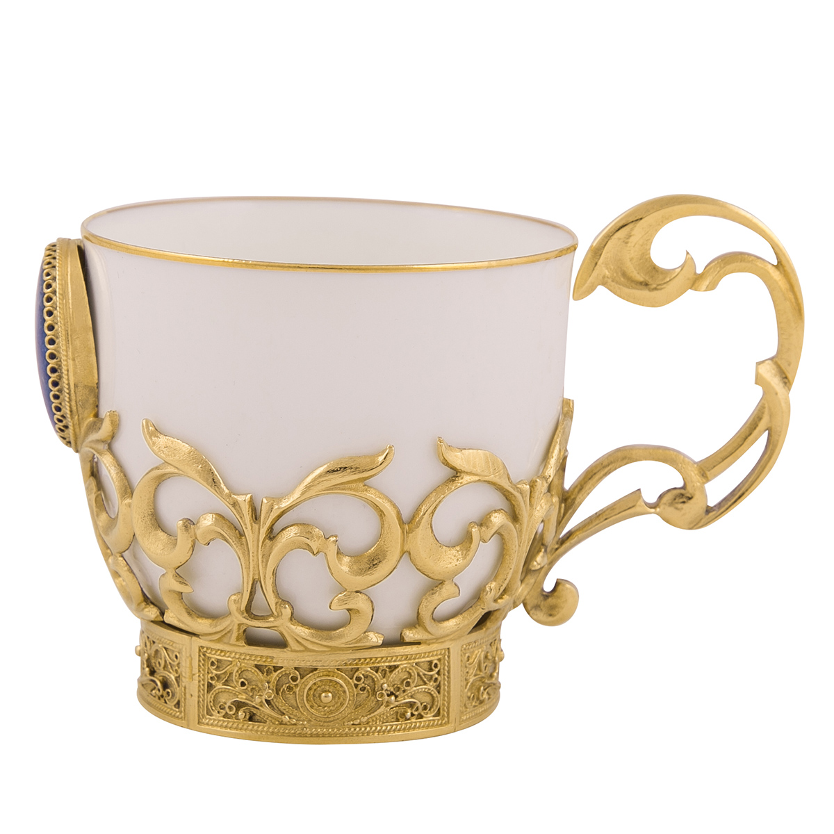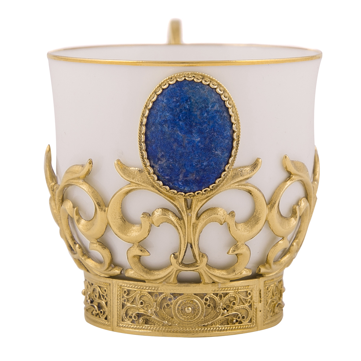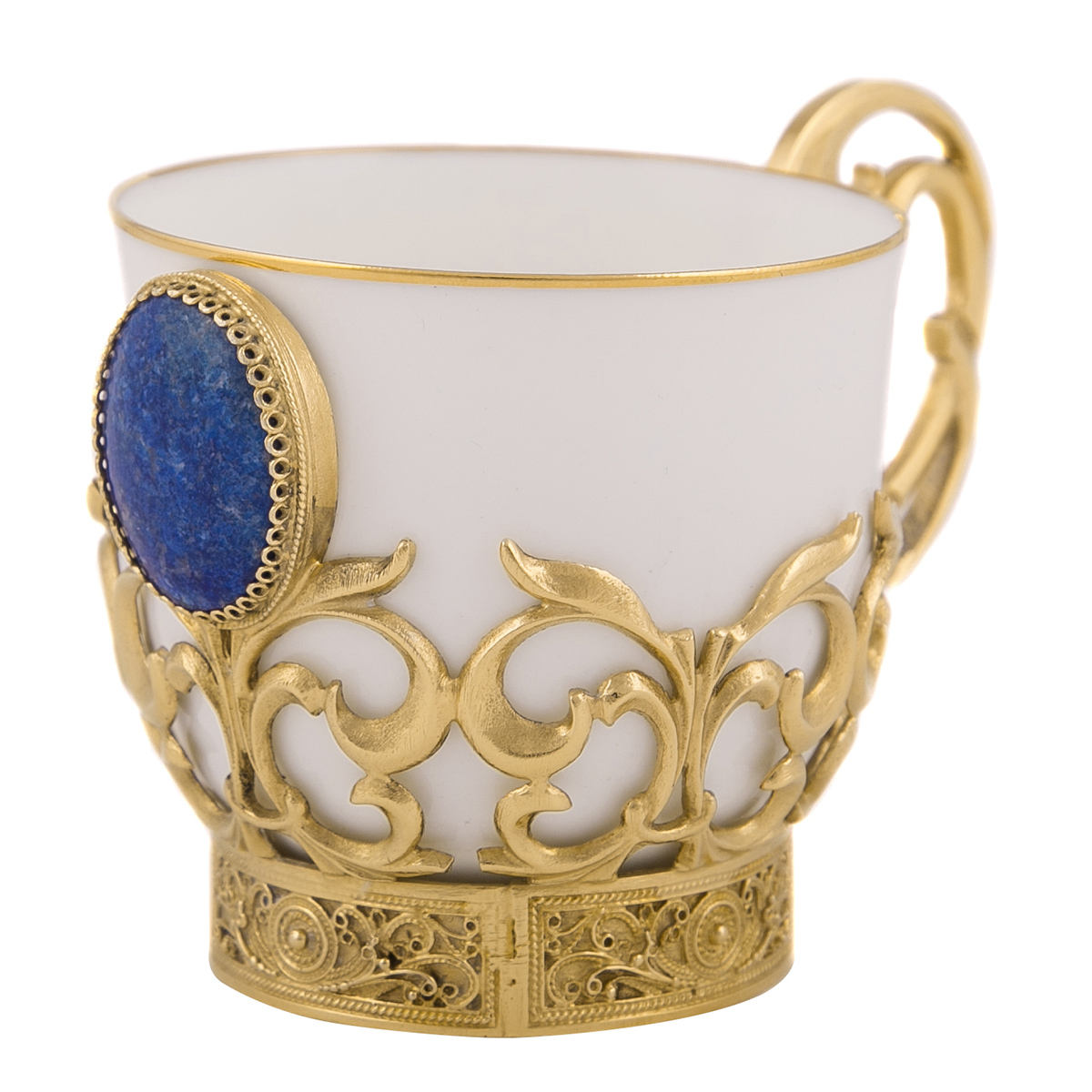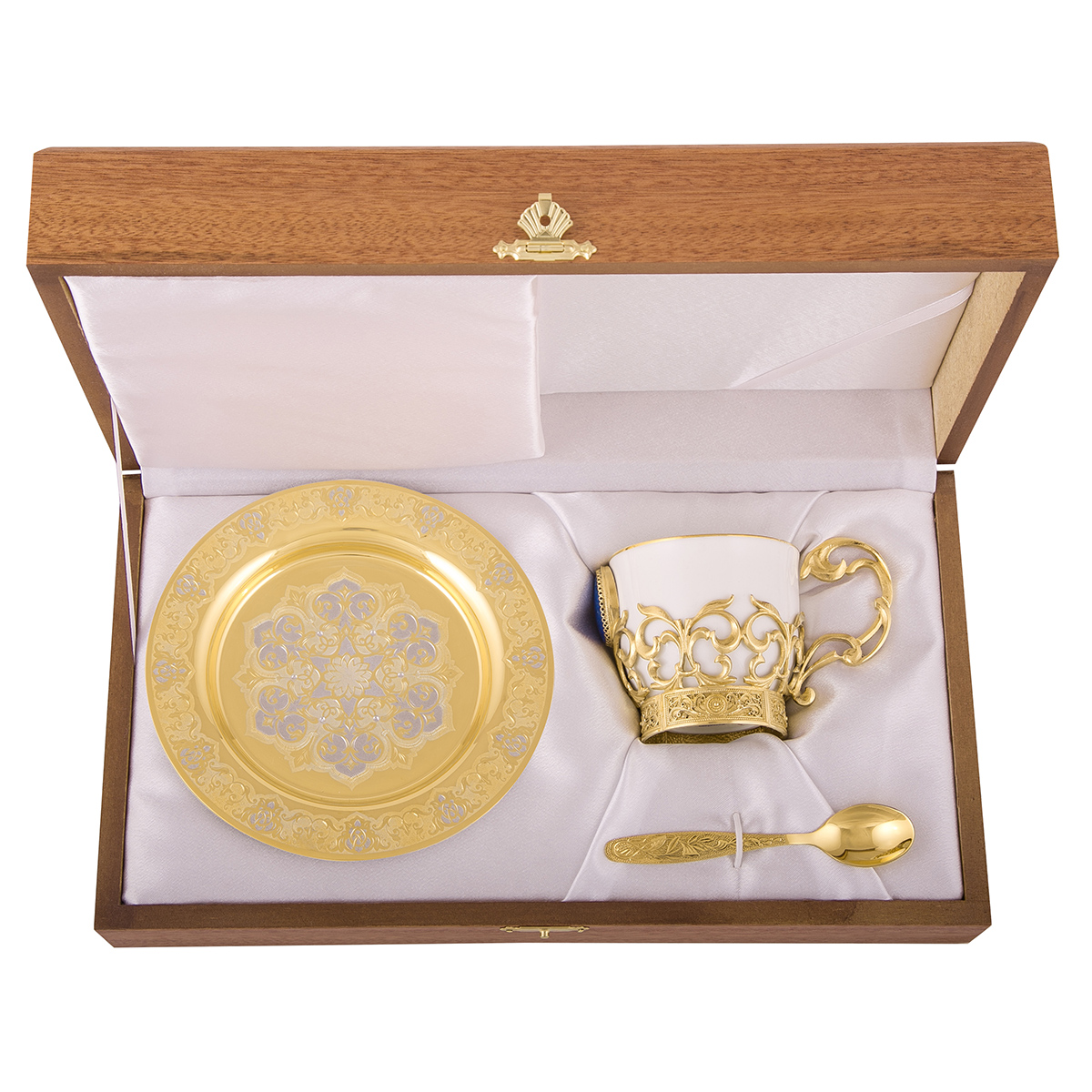 Любители ароматного кофе по достоинству оценят кофейный набор «Лазурит», преподнесенный в качестве оригинального подарка. Тарель из латуни, покрытая золотом, оригинальная чашка из костяного фарфора и ложка – настоящие произведения искусства, изготовленные вручную златоустовскими мастерами. Эксклюзивный набор выполнен в единственном экземпляре