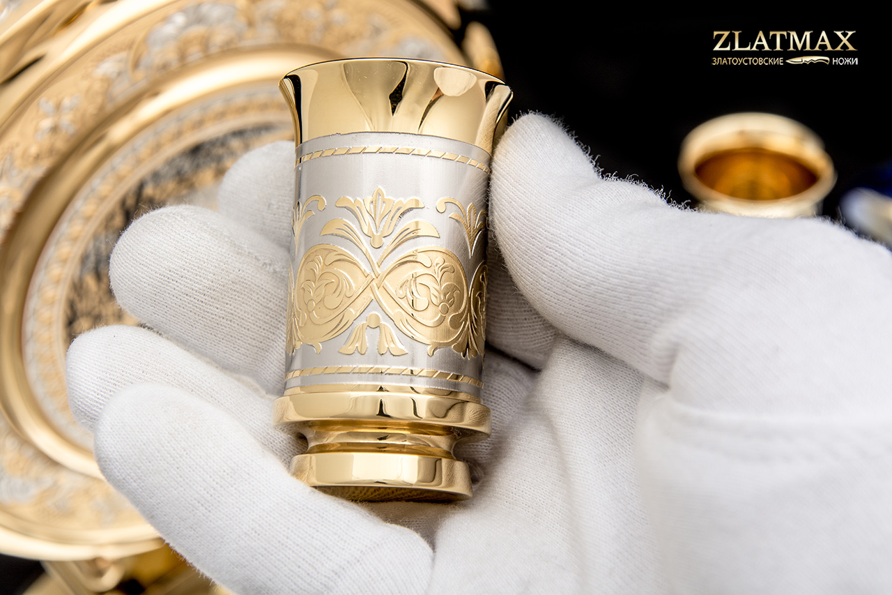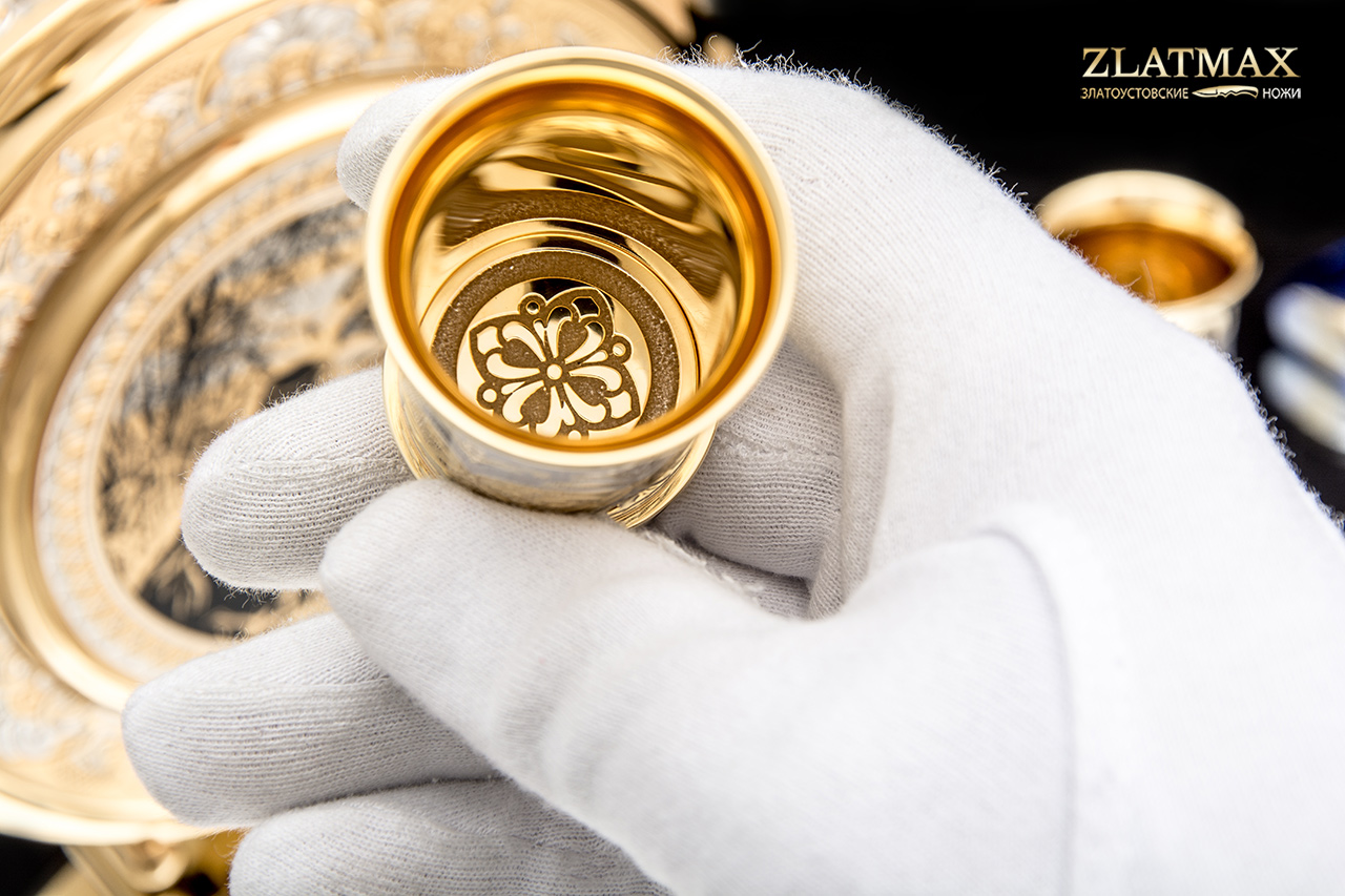 Набор «Охотники на привале» - это ручная работа талантливых мастеров из Златоуста. Здесь подчеркнута каждая деталь, воссоздан уникальный и живой рисунок при помощи росписи и различных техник декорирования. Поверхность изделий полируется, после чего на нее наносят выбранный мотив, а далее сушат в печи и обрабатывают для того чтобы рисунок стал объемным.