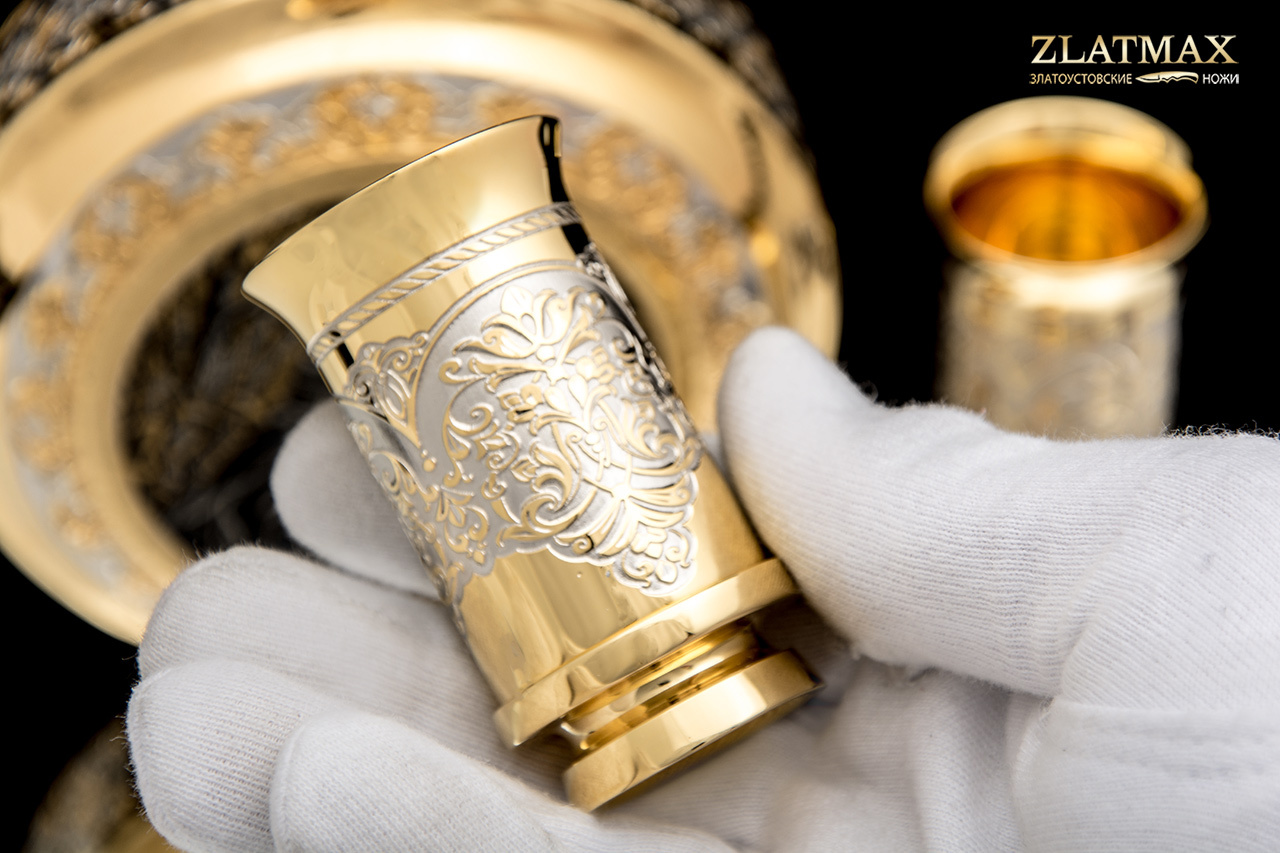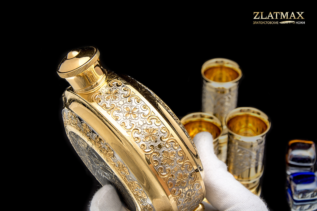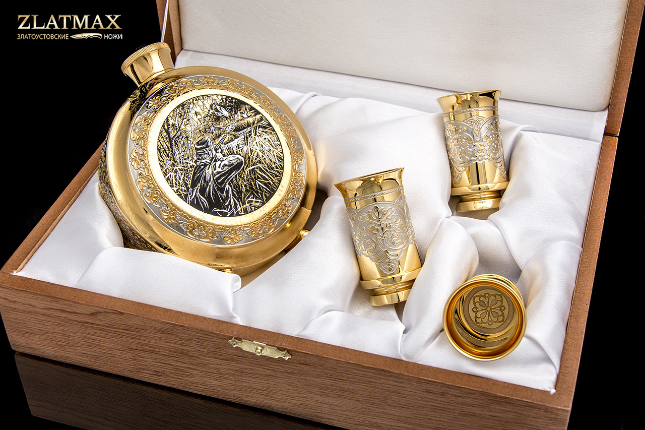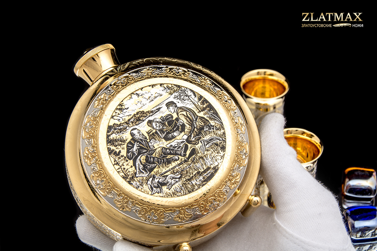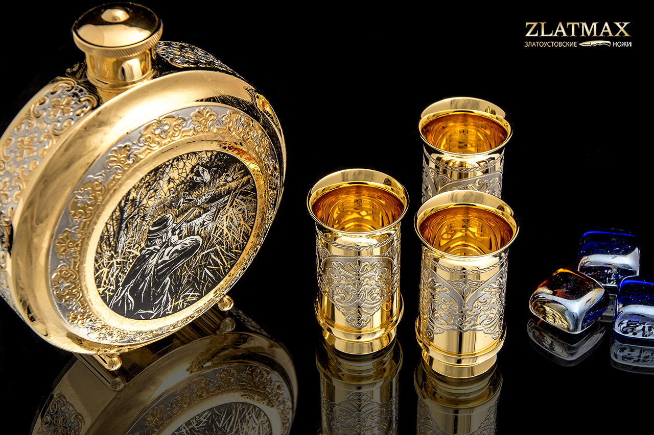 Набор «Охотники на привале» в небольшом объеме - символ дружбы, красоты и мужественности. Фляга и три стопки выполнены в невероятной ручной прорисовке мастеров из Златоуста, позолота роскошно блестит на солнце, привлекая взгляд. Такой набор можно взять с собой в поход, на рыбалку, на охоту.