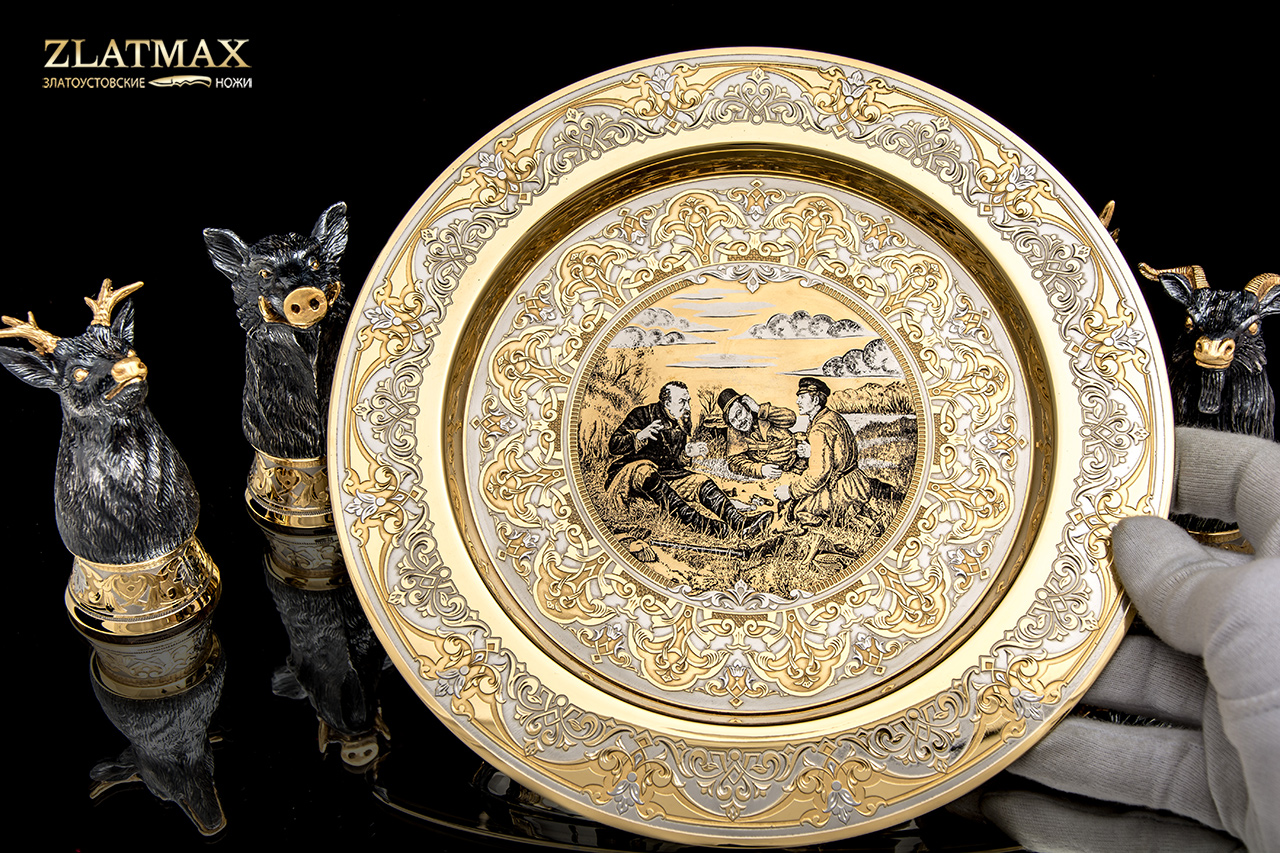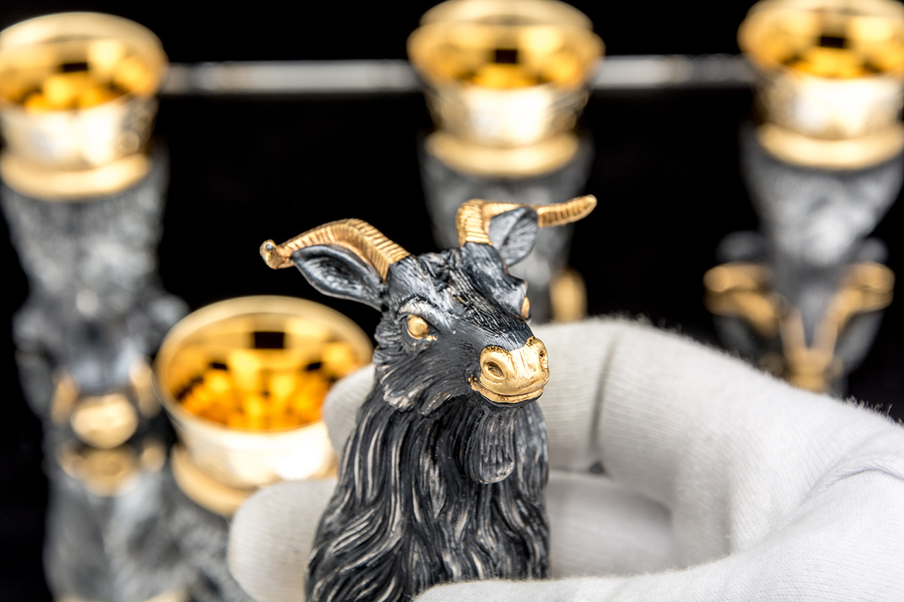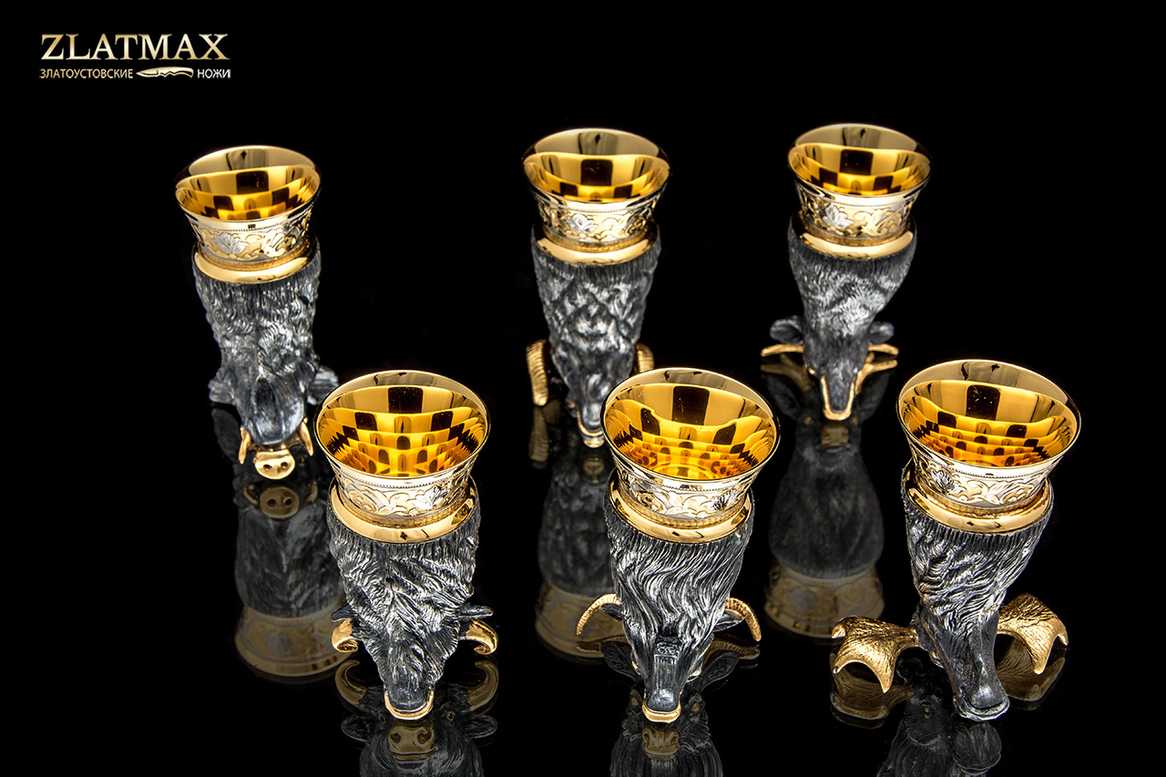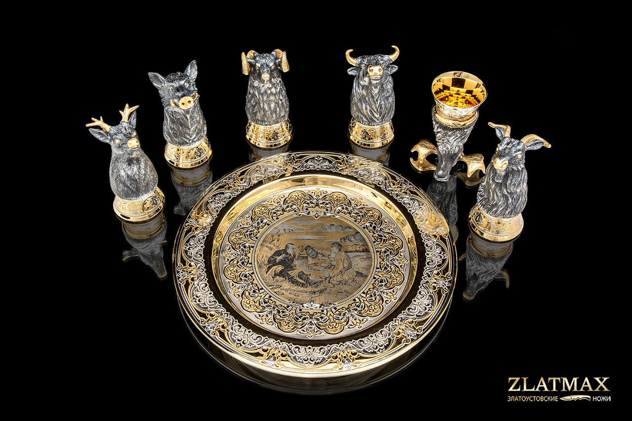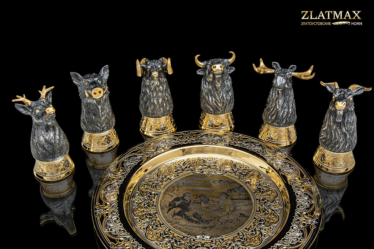 Набор «Трофейный» - это символ успеха, победы и достижений. 6 стопок, выполненных в форме зверей, на роскошном блюде. Каждый зверь характеризует различные качества: упорство, смелость, силу. На тарелке изображен мотив охотников на привале, которые радуются добыче и отдыхают после тяжелого дня.