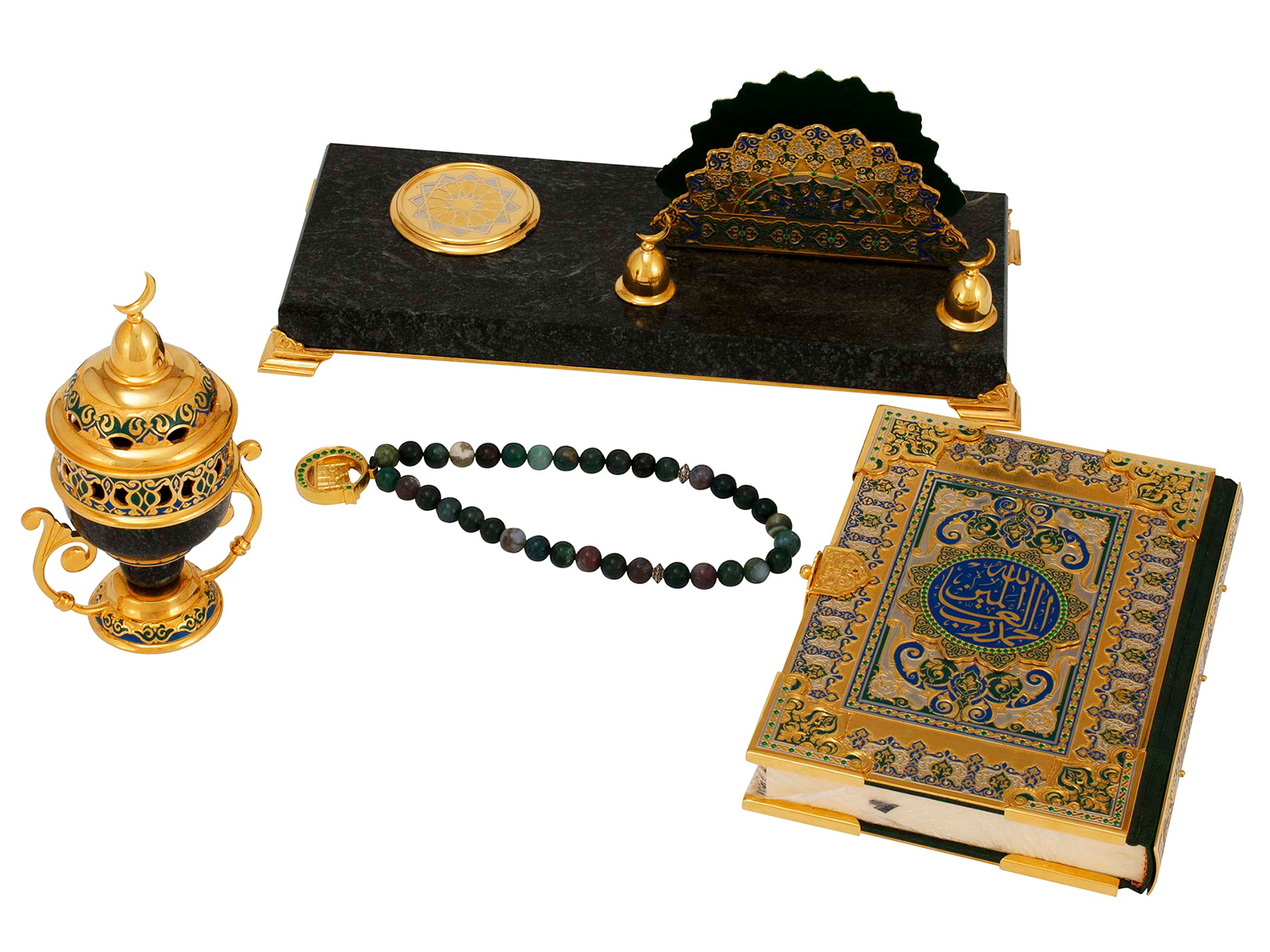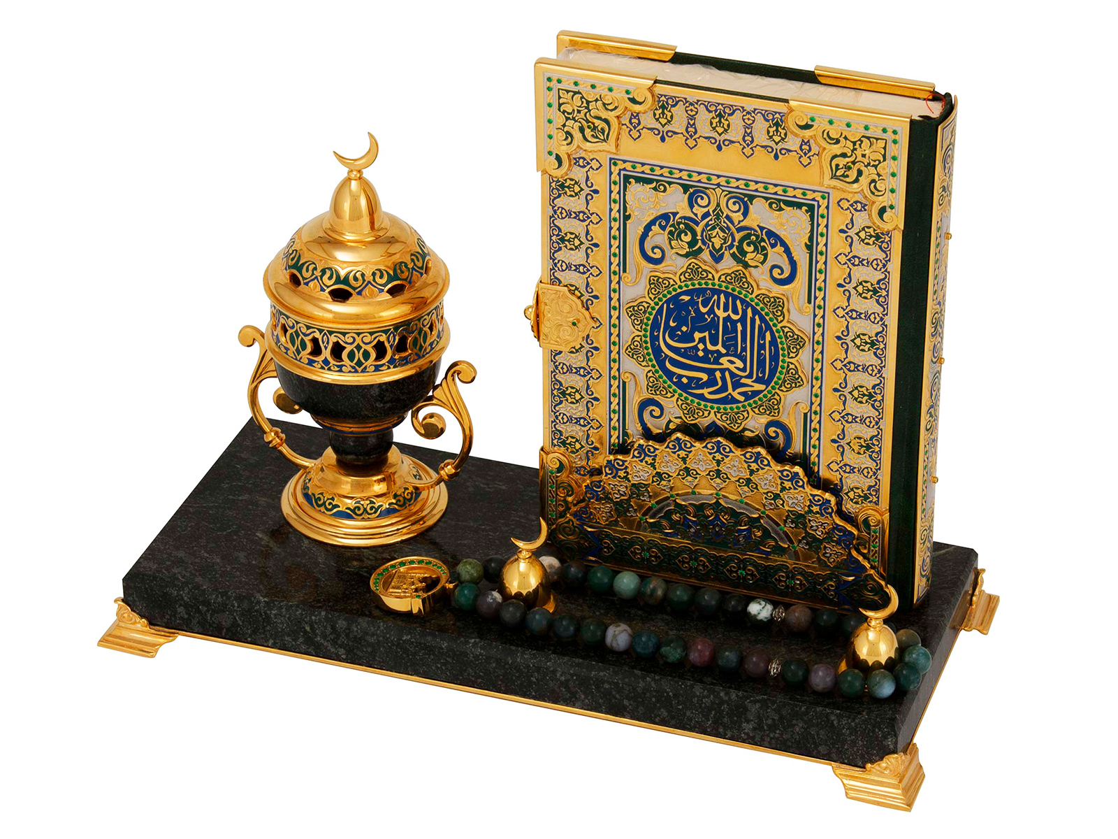 Настольная мусульманская композиция "Намаз" (Коран, бахурница, четки) камень змеевик