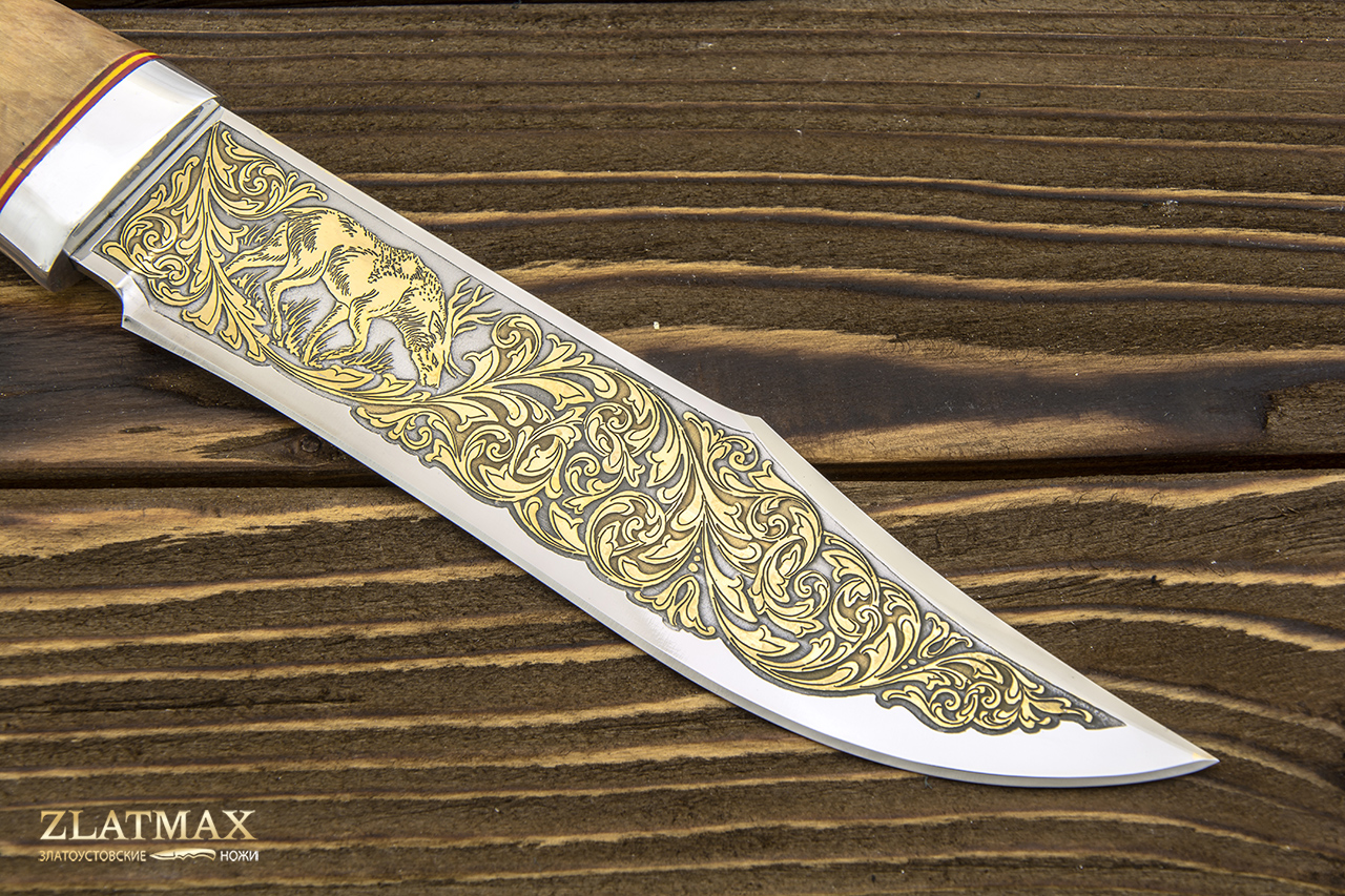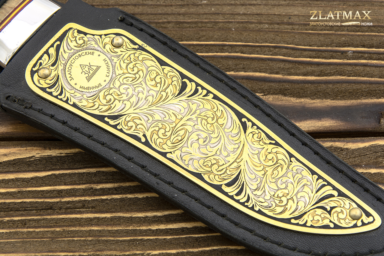 Нож Акела в подарочном исполнении. На клинке изображен рисунок в технике златоустовской гравюры на стали, покрыт золотом. В комплекте поставки идут кожаные ножны с металлической накладкой, на которой так же есть орнамент, покрытый золотом. Клинок выполнен из нержавеющей стали, поэтому нож остается практичным и его можно использовать по прямому назначению.