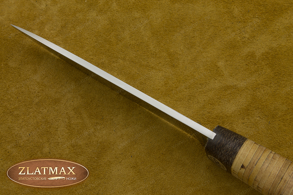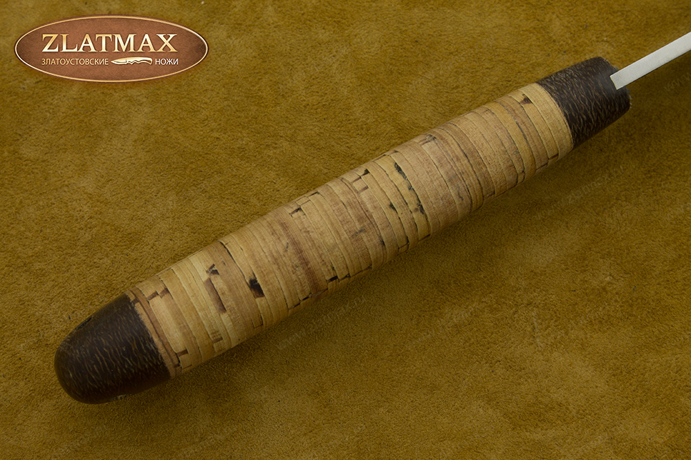 Особенность бересты - она имеет низкую теплопроводность, поэтому пользоваться изделиями из нее комфортно и в теплое, и в холодное время года. Рукоять ножа, выполненная из бересты, не будет скользить в руке, гарантирует надежный хват, даже если она испачкана в чем-то.