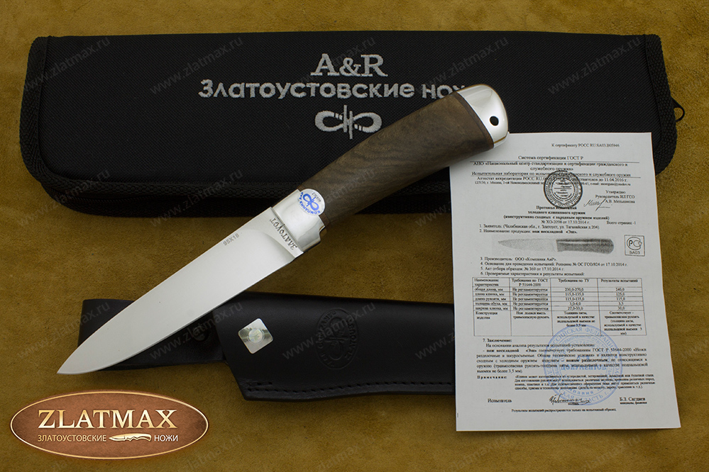 Нож Эш является ножом разделочным и не относится к гражданскому холодному оружию. Соответствует требованиям ГОСТ Р 51644-2000 «Ножи разделочные и шкуросъемные. Общие технические условия».