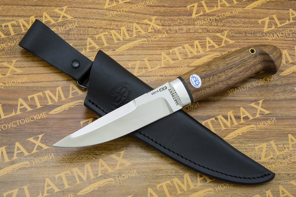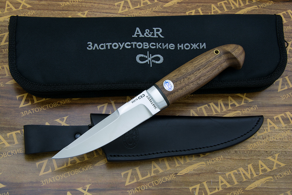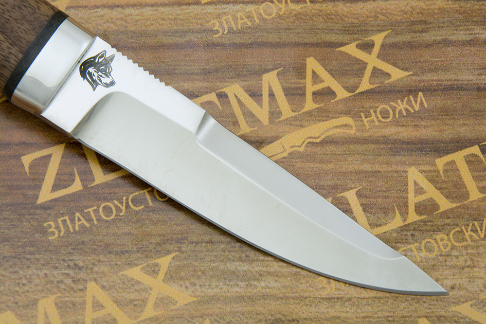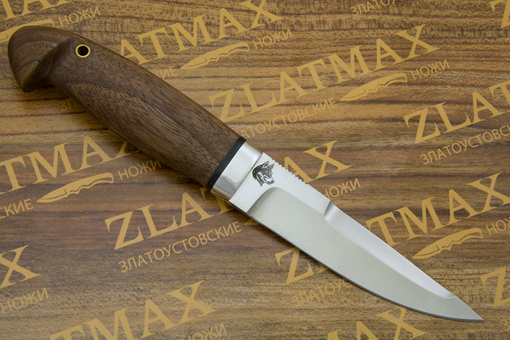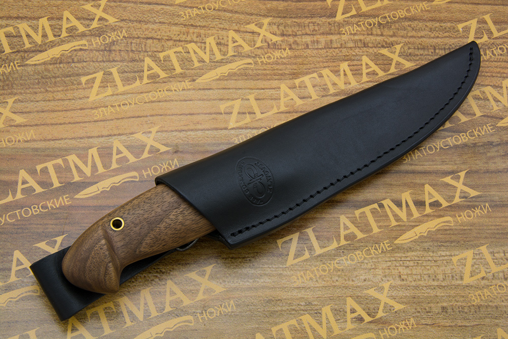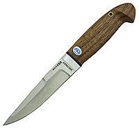 Универсальный легкий и прочный нож с мощным и изящным клинком, имеющим приспущенный обушок. При толщине пяты в 5 мм, за счет широкого фальшлезвия, не доходящего до острия 15 мм, и широких плавных обратнолинзовидных спусков, клинок получился легким, с отличными режущими качествами. На обухе клинка у рукояти есть насечка для резов с упором большого пальца в обушок. Нож прекрасно сбалансирован. Эргономичная форма рукояти в скандинавском стиле уверенно и прочно ложится в любую ладонь, даже в рукавице. Небольшая подпальцевая выемка не дает соскользнуть пальцам при резах от себя. Монтаж рукояти сквозной, неразборный. На рукояти ближе к навершию есть отверстие под темляк. Отличный выбор для большинства видов работы в лесу.