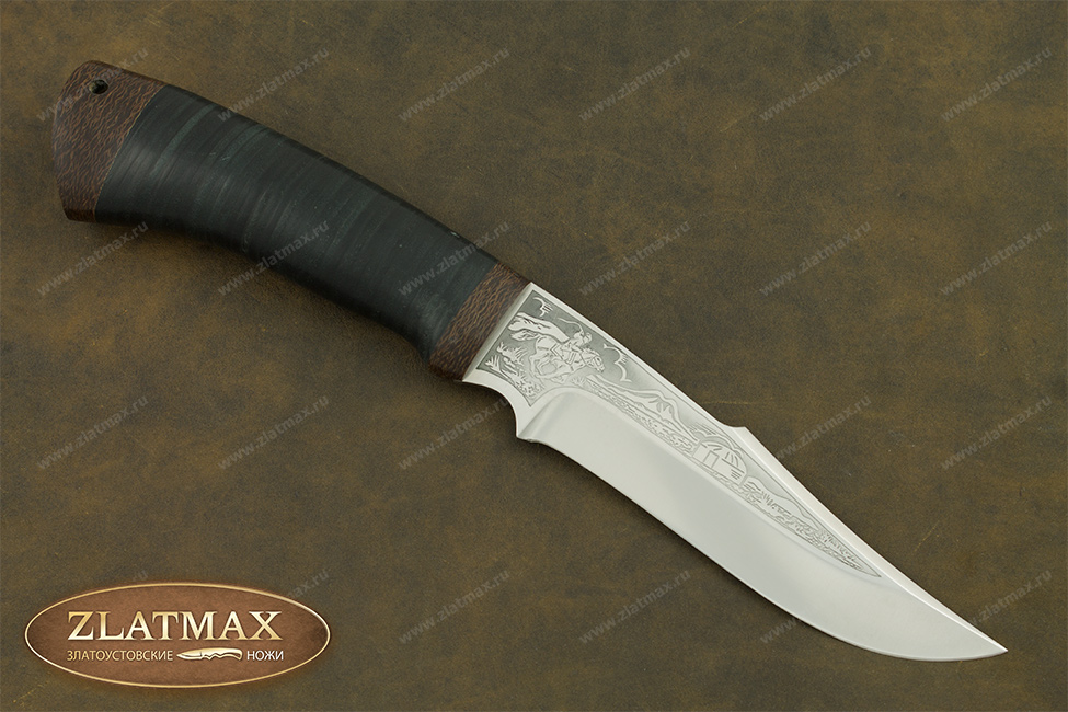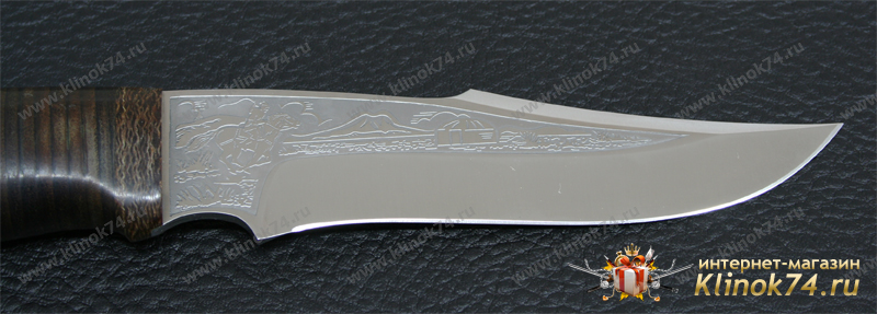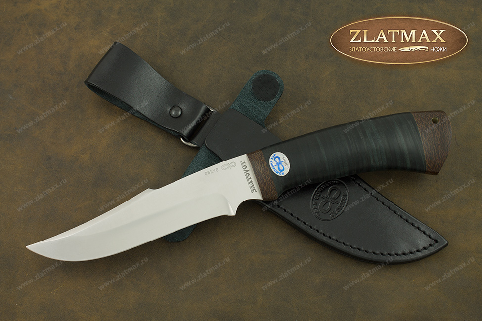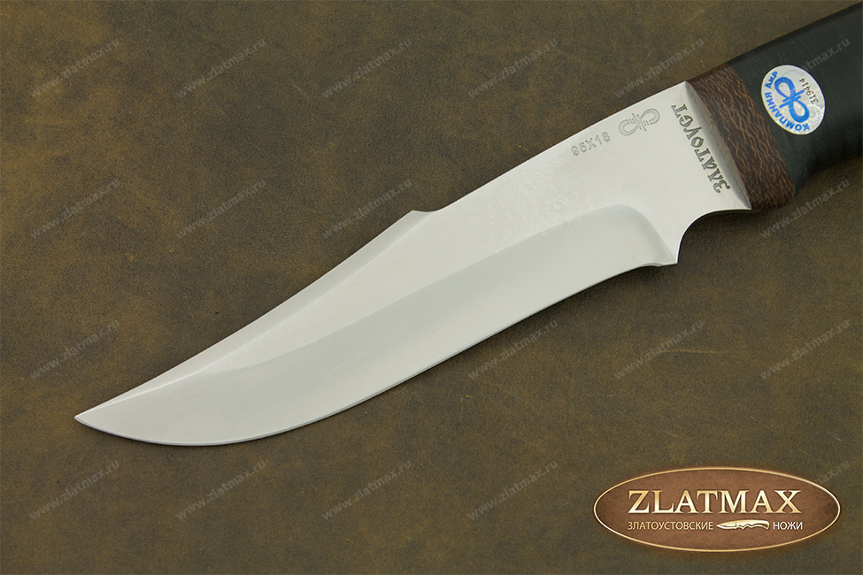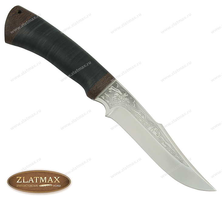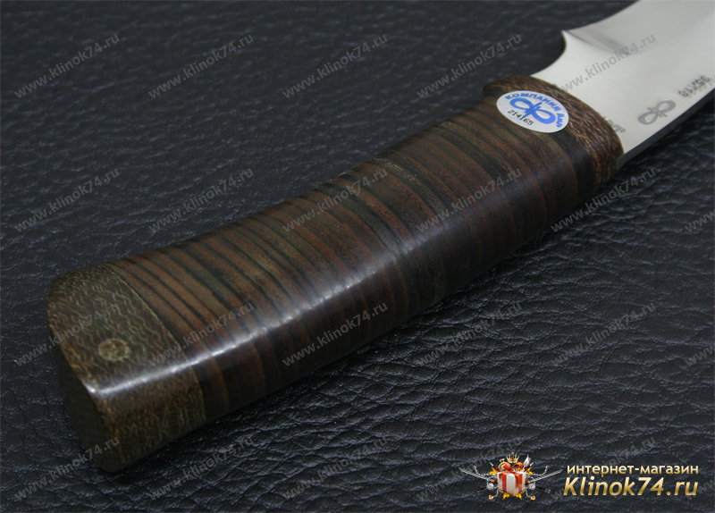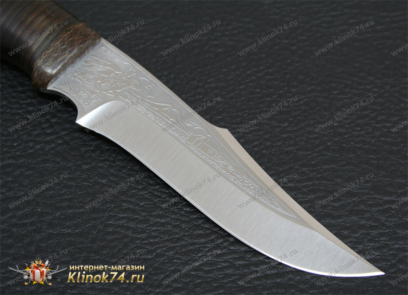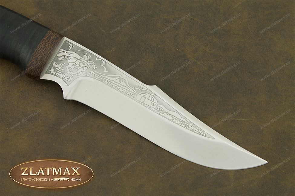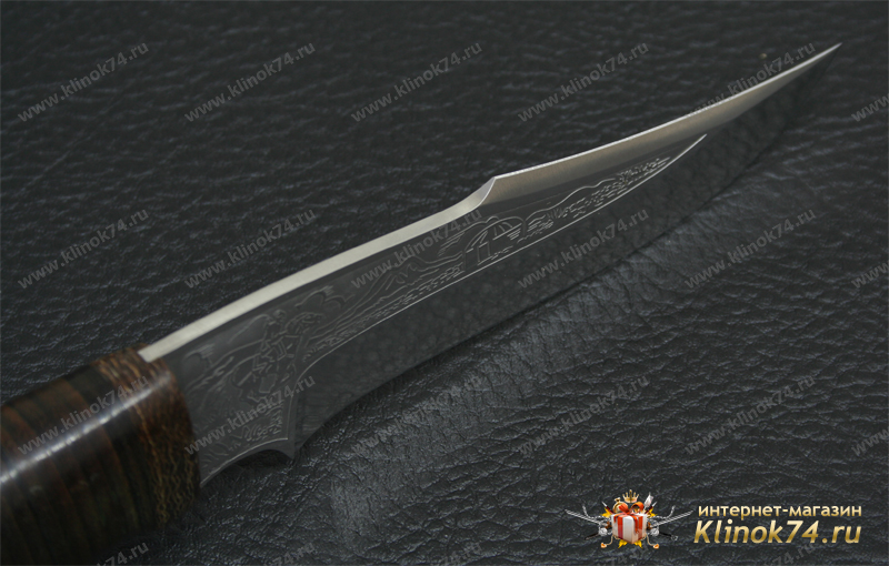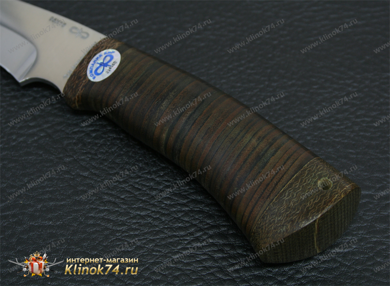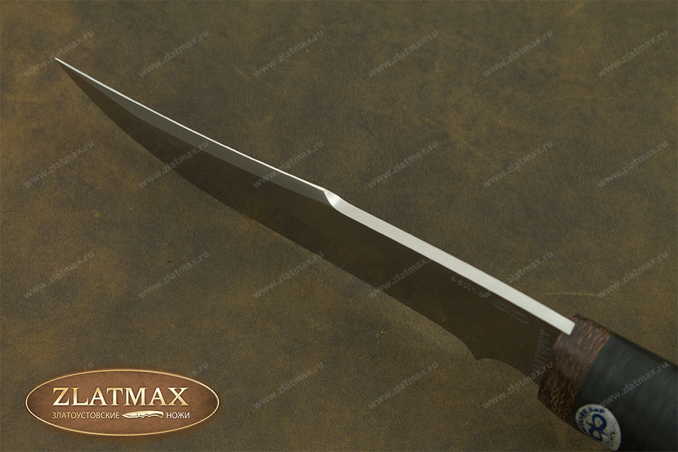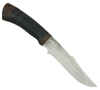 Средний универсальный прочный нож с хищным клинком восточного ятаганного вида, имеющим вогнутые линзовидные спуски от середины клинка, образующие тонкое, прекрасно режущее лезвие. Демонстрирует неплохие режущие качества. Весьма серьезный инструмент. Клинок толщиной обуха в 3 мм имеет прогнутое фальшлезвие двусторонней заточки, с углом заточки 60 градусов и может быть использовано для рубки мелких костей и хрящей. На пяте клинка есть подпальцевый вырез для указательного пальца. Форма рукояти удобна даже для большой руки, уверенно и прочно ложится в любую ладонь. Монтаж рукояти сквозной, неразборный. На навершии рукояти имеется отверстие под темляк. Отличный выбор для большинства видов работы в лесу.