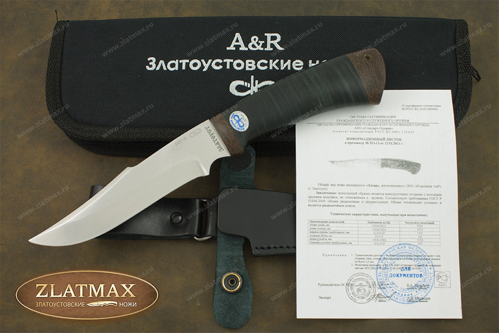 Нож Хазар является ножом разделочным и не относится к гражданскому холодному оружию. Соответствует требованиям ГОСТ Р 51644-2000 «Ножи разделочные и шкуросъемные. Общие технические условия».