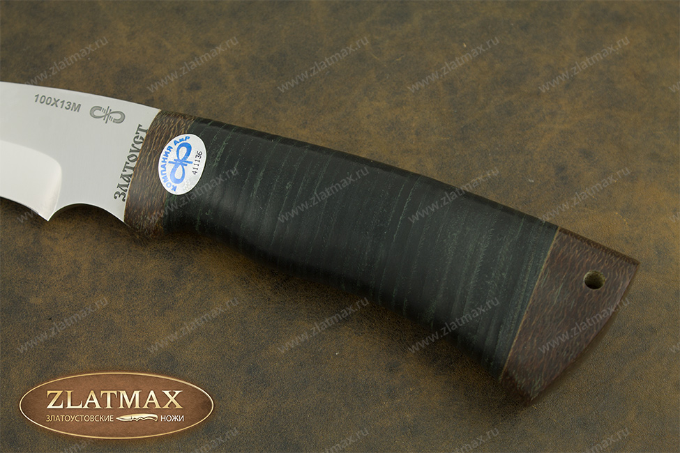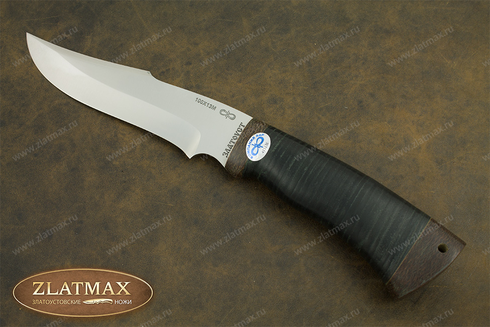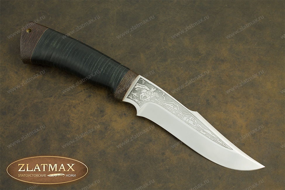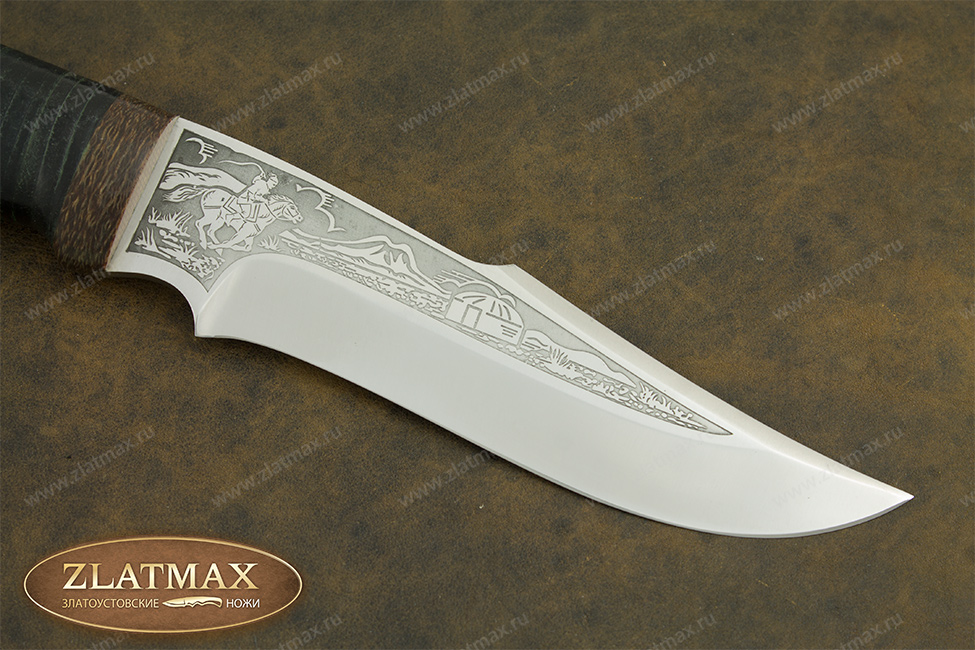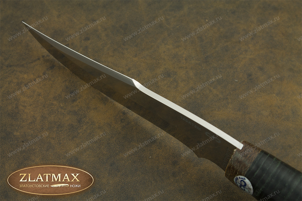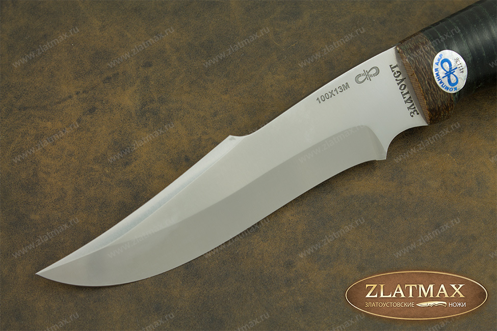 Универсальный нож «Хазар» довольно прочный, имеет среднюю величину и клинок хищного вида, что демонстрируется взгляду сразу же. Вид, как у восточного ятагана с вогнутыми спусками с середины клинка. Он обладает хорошими режущими способностями, в чем ему помогает оптимальная толщина обуха в 3 мм. и угол двусторонней заточки в 60 градусов фальшлезвия. Оно пригодится, чтобы рубить кости и хрящики. Уверенно держится в руках пользователя, а вырез для указательного пальца на пяте придает максимальное удобство. Оптимальный вариант для лесных работ.