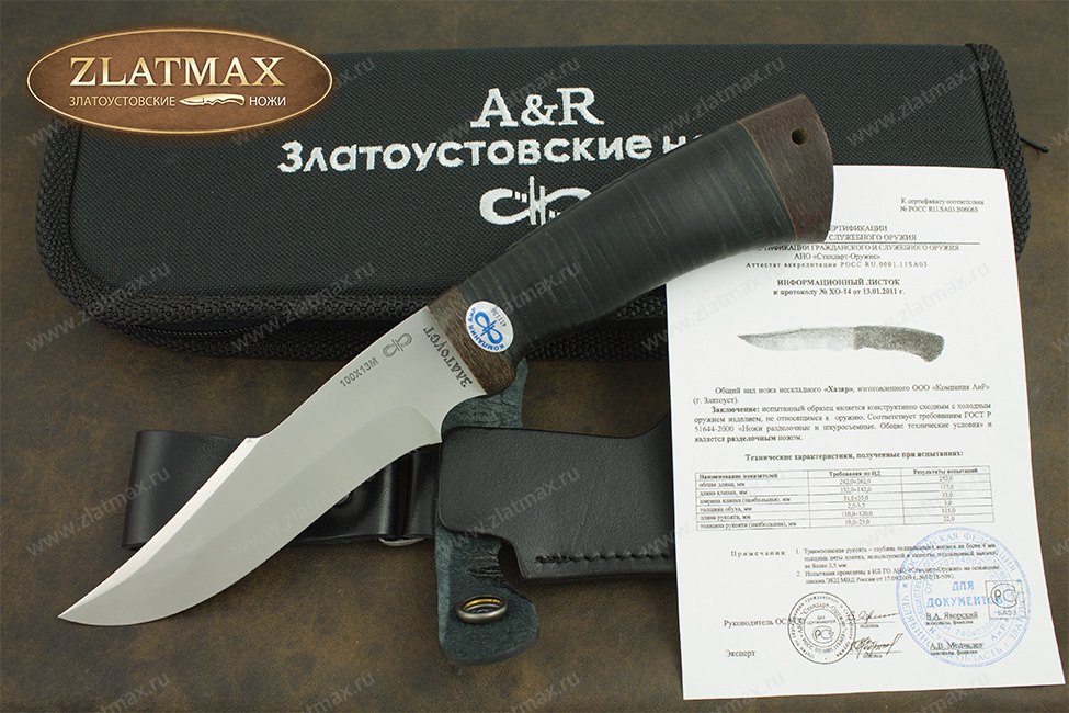 Нож Хазар является ножом разделочным и не относится к гражданскому холодному оружию. Соответствует требованиям ГОСТ Р 51644-2000 «Ножи разделочные и шкуросъемные. Общие технические условия».