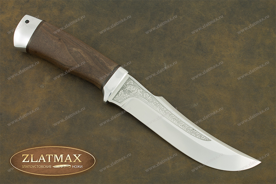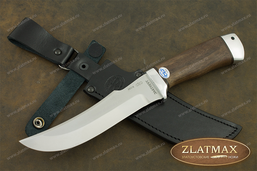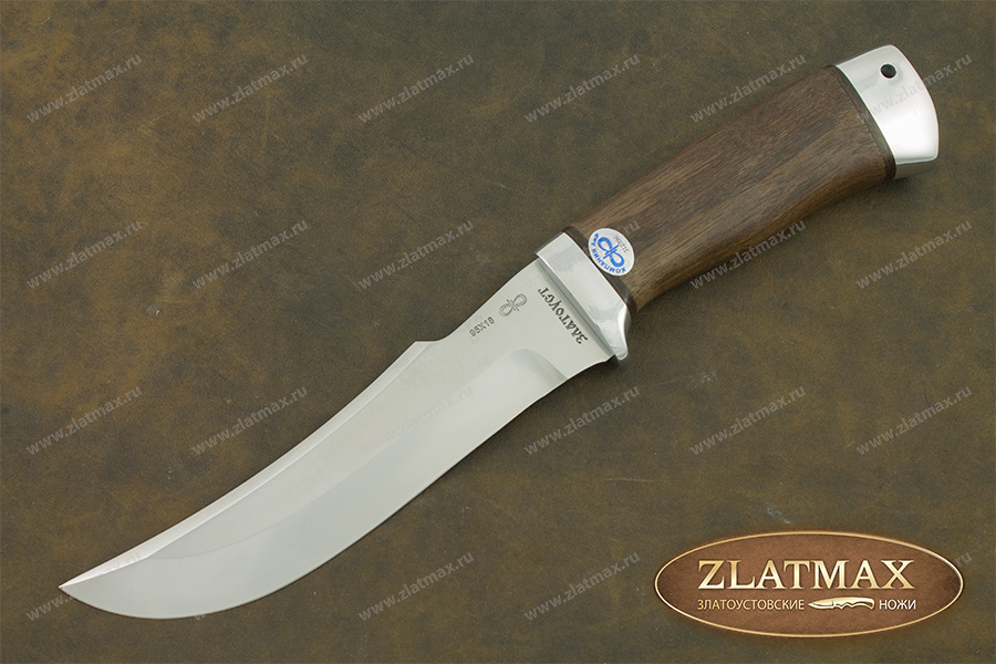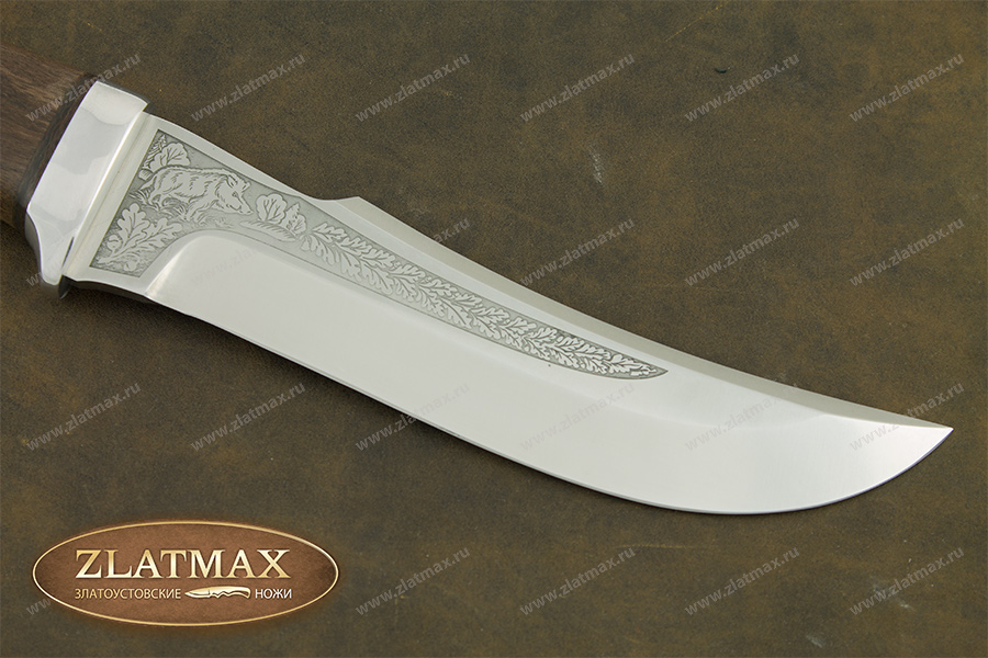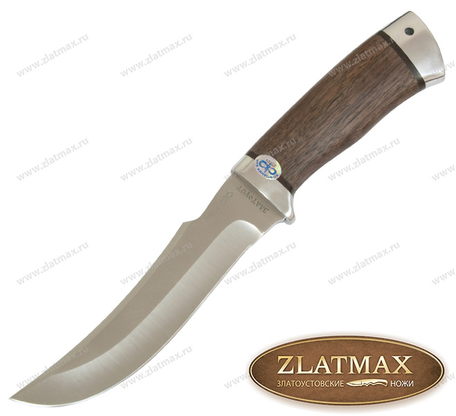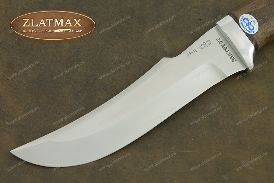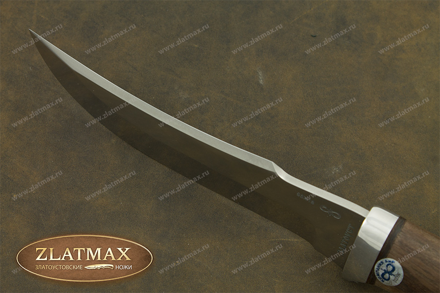 Крупный универсальный, прочный нож с хищным клинком восточного ятаганного вида, имеющим вогнутые линзовидные спуски от середины ширины клинка, образующие тонкое, прекрасно режущее лезвие. Демонстрирует отличные режущие качества. Весьма серьезный инструмент. Клинок толщиной обуха в 3,7 мм имеет прогнутое фальшлезвие на три четверти длины клинка и может быть использован для рубки мелких костей и хрящей. Эргономичная форма рукояти подкупает: она удобна даже для большой руки, уверенно и прочно ложится в любую ладонь. А полноценная гарда не дает соскользнуть пальцам при резах от себя. Монтаж рукояти сквозной, неразборный. На навершии рукояти имеется отверстие под темляк. Отличный выбор для большинства видов работы в лесу.